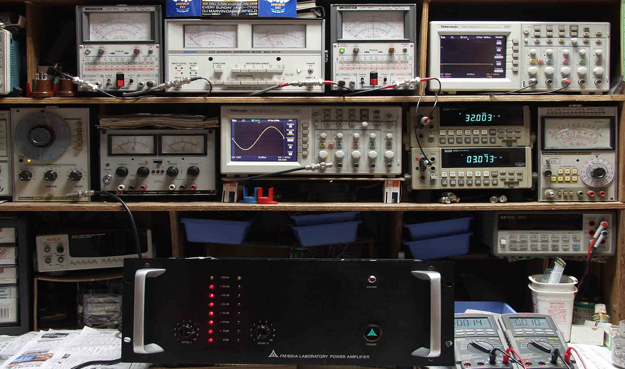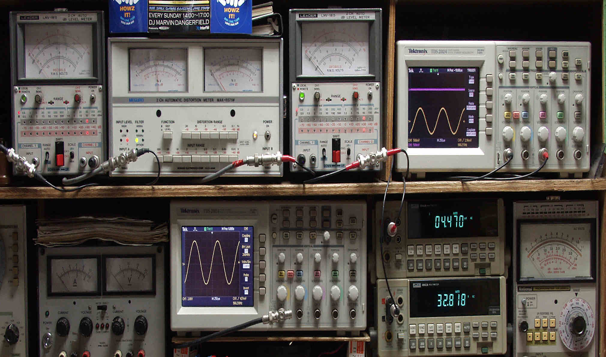 | E. 調整・測定 E1. 出力・歪み率測定・調整 <見方> 下段左端 オーディオ発振器より400HZ・1KHZの信号を出し(歪み率=約0.003%)これをAMPに入力し、出力を測定 下段中左 オシロ=入力波形(オーディオ発振器のTTLレベル) 下段中右上=周波数計 上段左端 電圧計=L側出力電圧測定、黒針のみ使用 上段中左 歪み率計=出力の歪み率測定 左メータ=L出力、右メータ=R出力 上段中右 電圧計=R側出力電圧測定、赤針のみ使用 上段右端 オシロ=出力波形 上=R出力、下=L出力(実際にはRL電圧計の出力「Max1V」を観測) 下段中右上 デジタル電圧計=R出力電圧測定 下段中右下 デジタル電圧計=L出力電圧測定 |