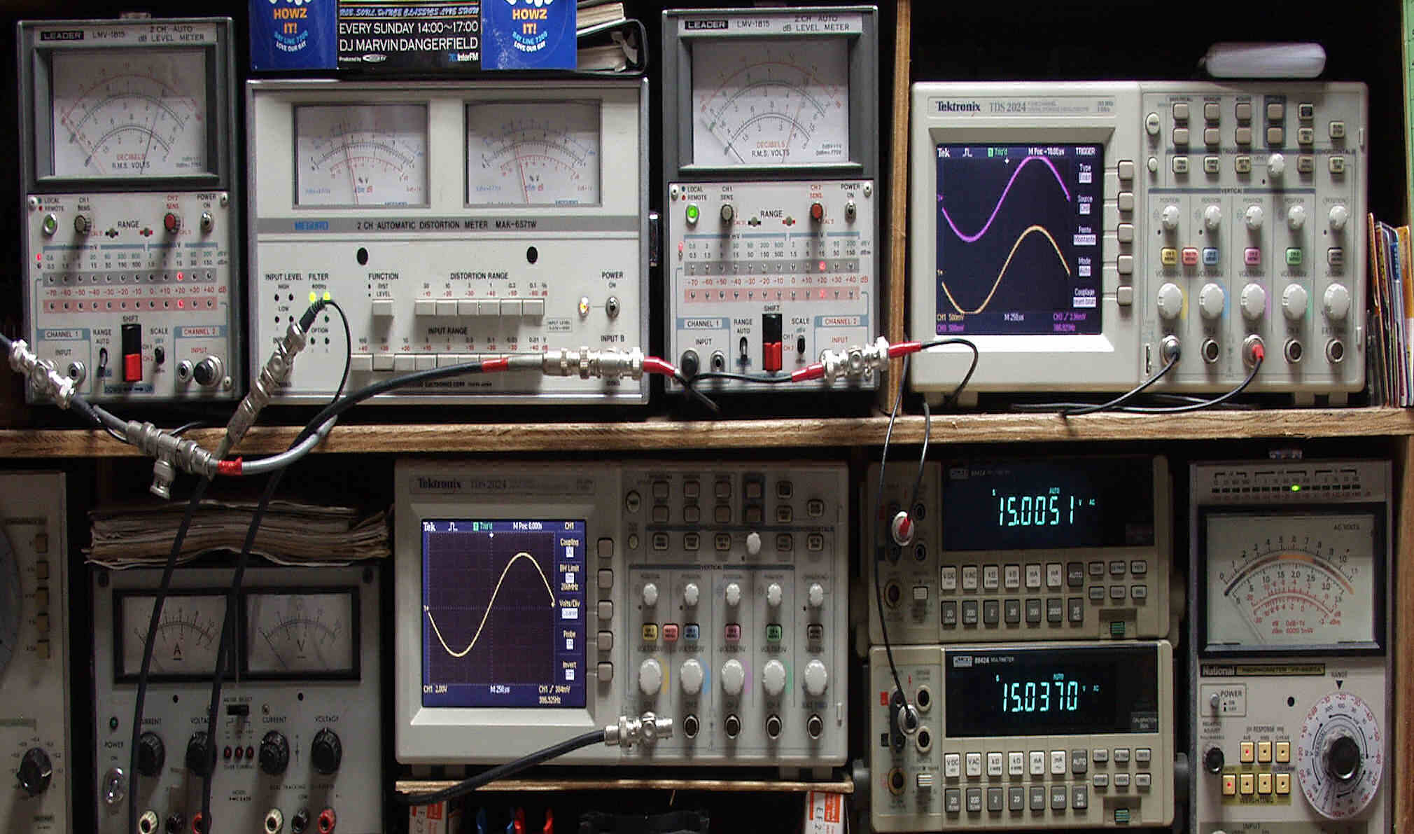 | E. 調整・測定 E1. 出力・歪み率測定・調整 <見方> 下段左端 オーディオ発振器より400HZ・1KHZの信号を出し(歪み率=約0.003%)これをAMPに入力し、出力を測定 下段中左 オシロ=入力波形(オーディオ発振器のTTLレベル) 下段中右上=周波数計 上段左端 電圧計=L側出力電圧測定、黒針のみ使用 上段中左 歪み率計=出力の歪み率測定 左メータ=L出力、右メータ=R出力 上段中右 電圧計=R側出力電圧測定、赤針のみ使用 上段右端 オシロ=出力波形 上=R出力、下=L出力(実際にはRL電圧計の出力「Max1V」を観測) 下段中右上 デジタル電圧計=R出力電圧測定 下段中右下 デジタル電圧計=L出力電圧測定 |