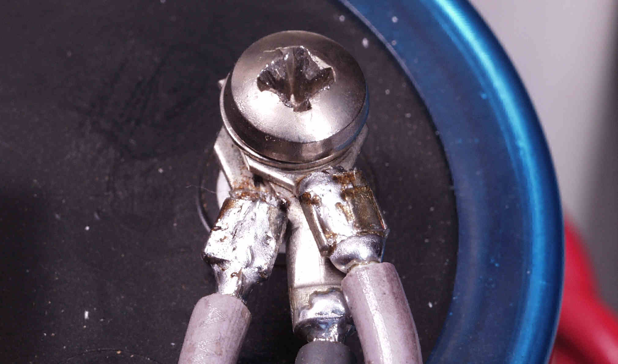 | CC3. 修理前 「−」電源へのラグ端子、線が全部入っていない、左上の線は奥まで心線が入れてない | ||||||||||||||||||||||||||