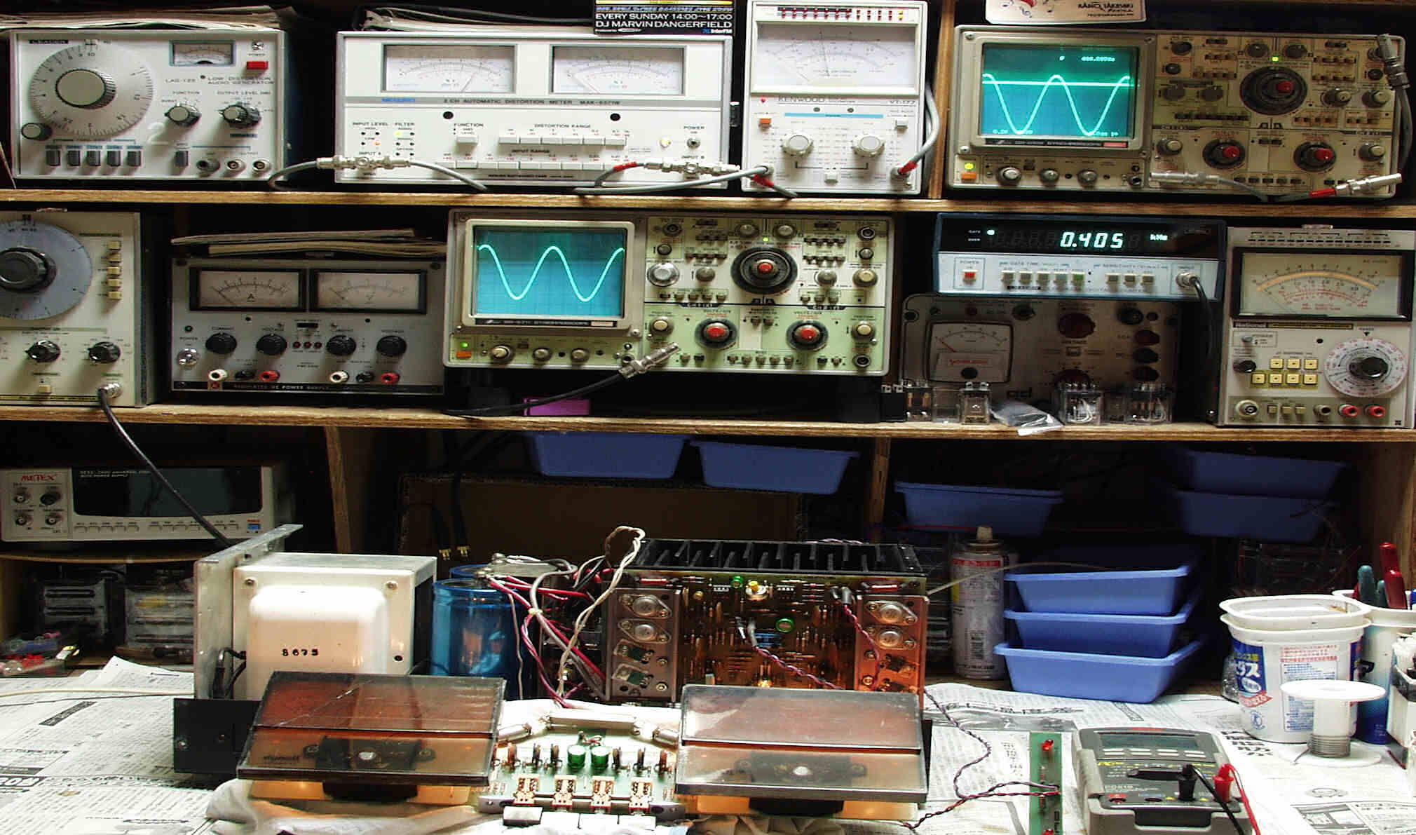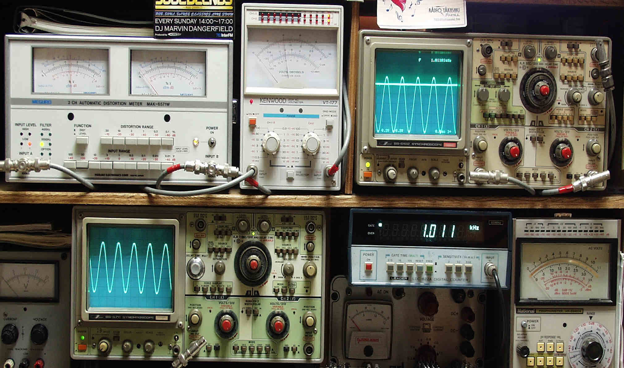 | E. 調整・測定 E1. 出力/歪み率測定・調整 <見方> 下左オーデオ発振器より400HZ・1KHZの信号を出す(歪み率=約0.003%) 下中=入力波形(オーデオ発振器のTTLレベル) 下右=周波数計 上左=SP出力の歪み率測定 左メ−タ−=L出力、右メ−タ−=R出力 上中=SP出力電圧測定器、赤針=R出力、黒針=L出力 上右=SP出力波形オシロ 上=R出力、下=L出力(出力電圧測定器の出力) |