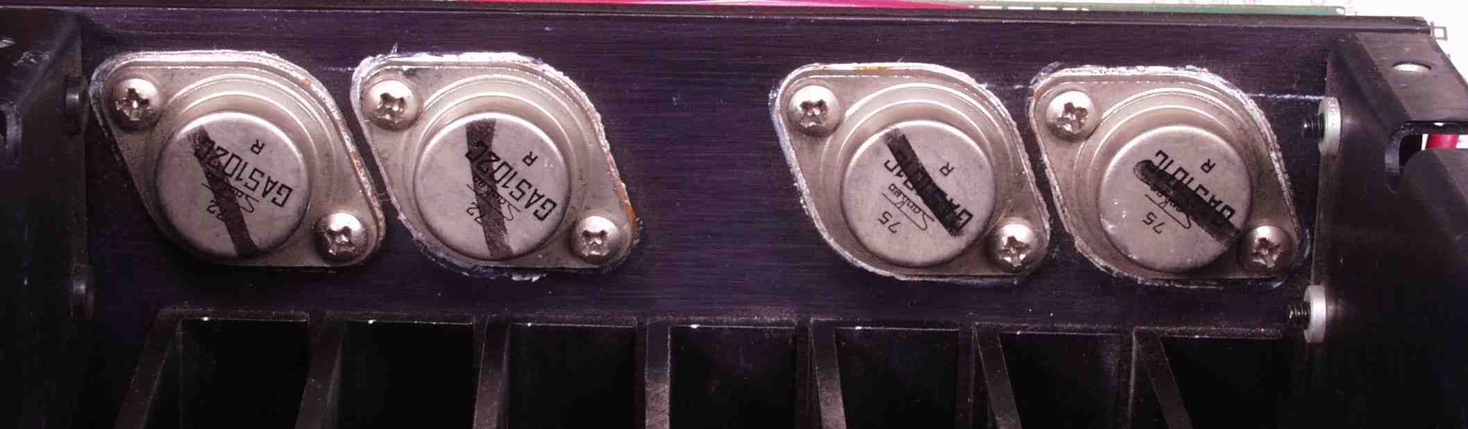 | A7. 点検中 プロテクトのサーミスターが短絡して有る! これで音質が良くは成る(?)でしょうが、その代償は終段TR(トランジスター)を損焼した。 |