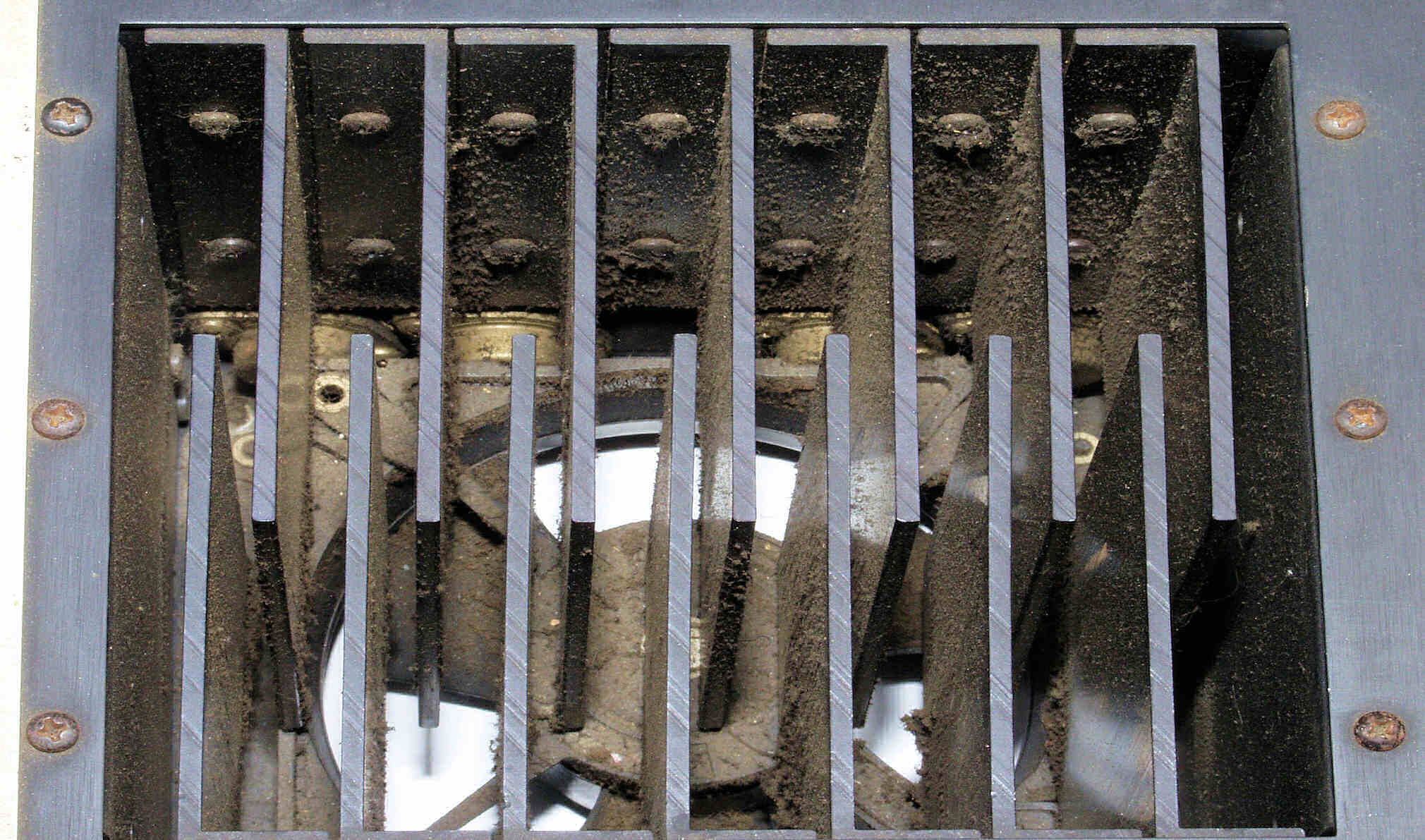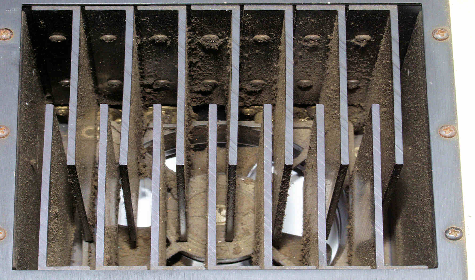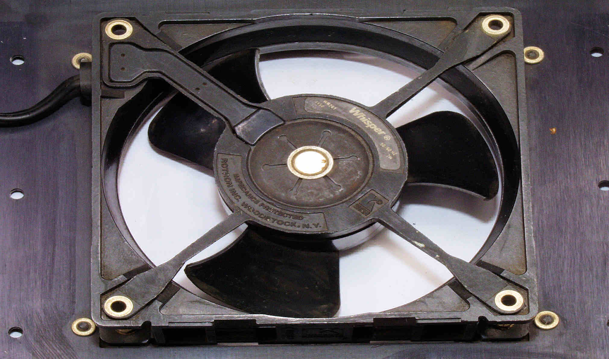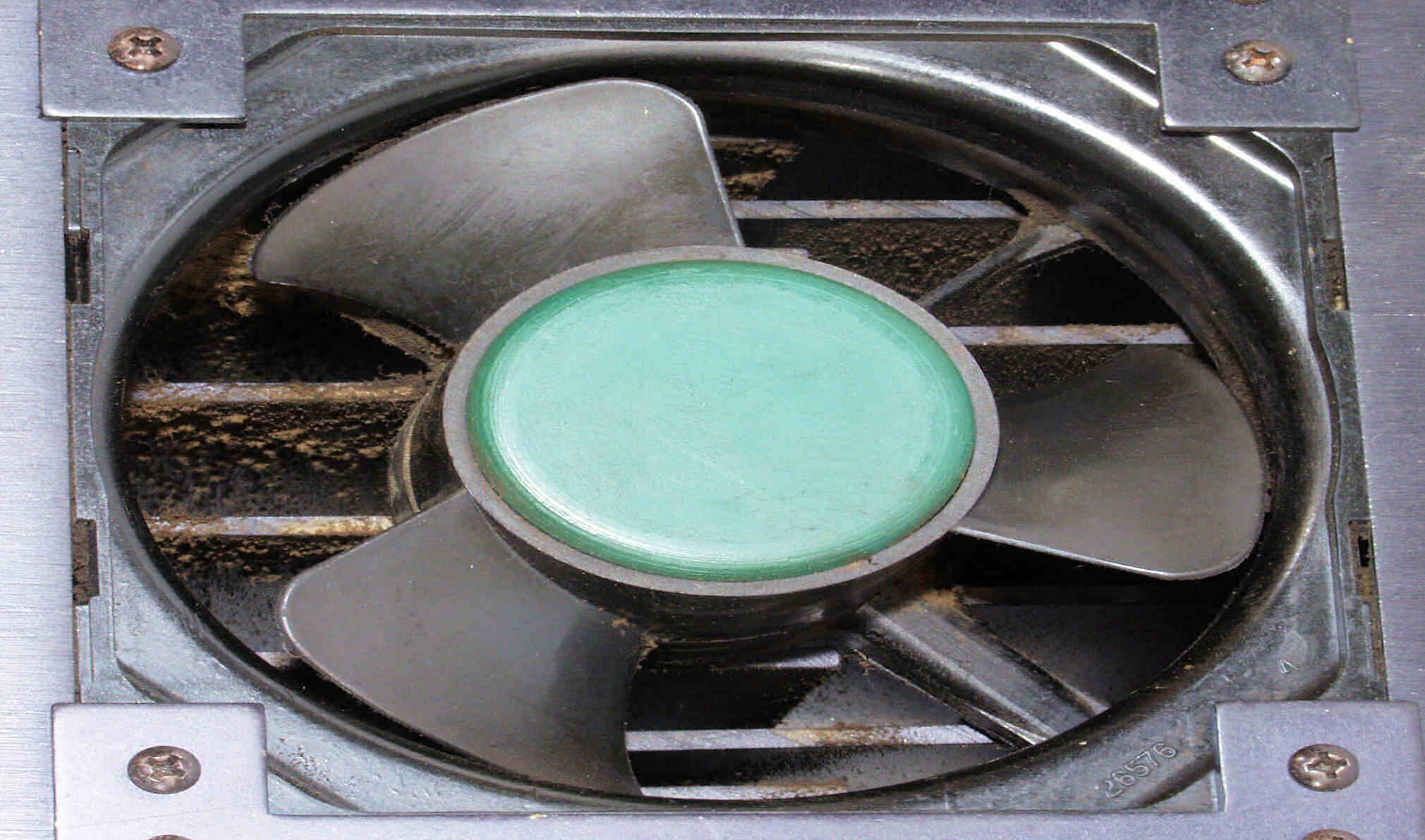 A32. 点検中 下から、フアンを見る、放熱器に埃が沢山付いている。