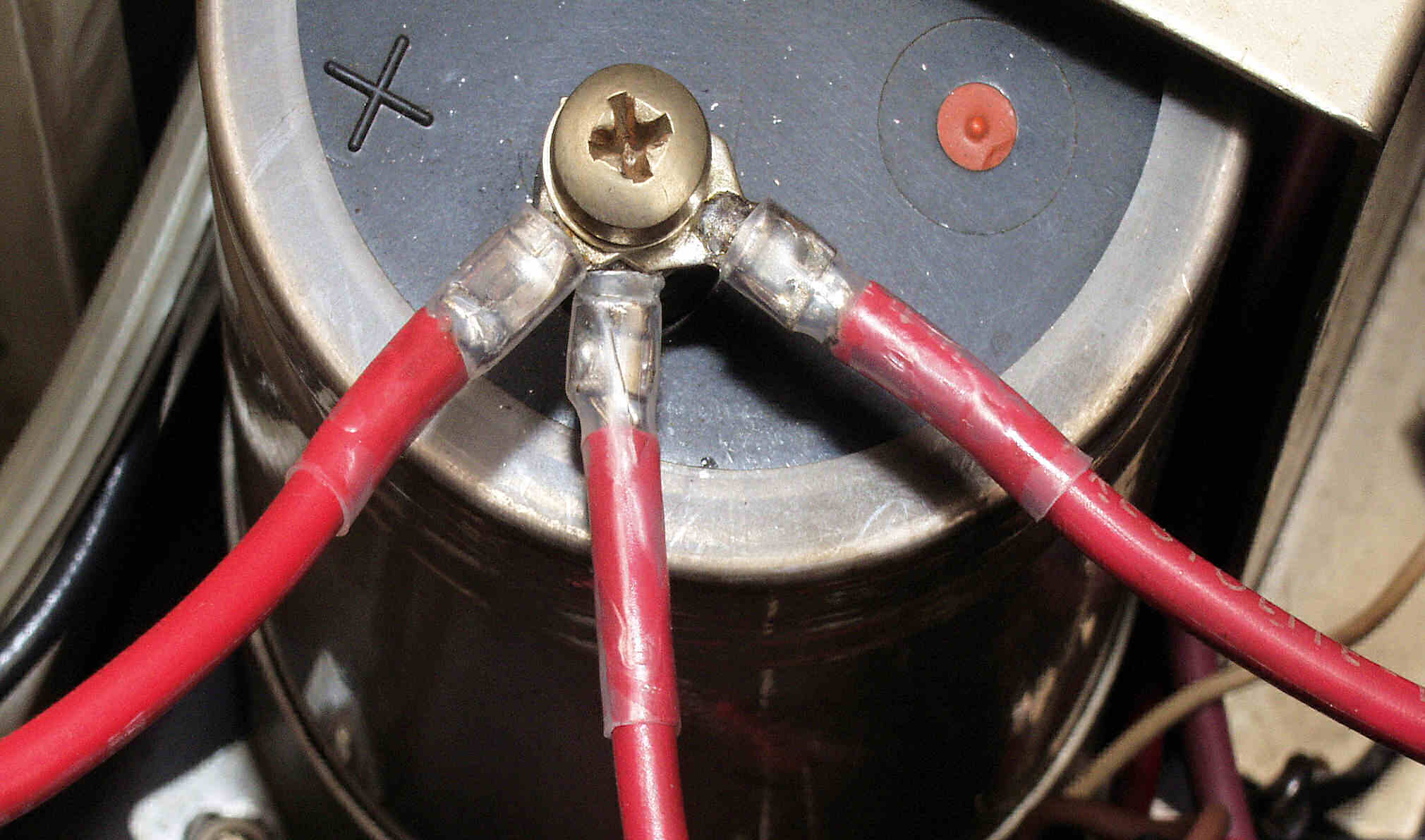 A63. 点検中 熱でビニールが後退した電解コンデンサー、B側。
