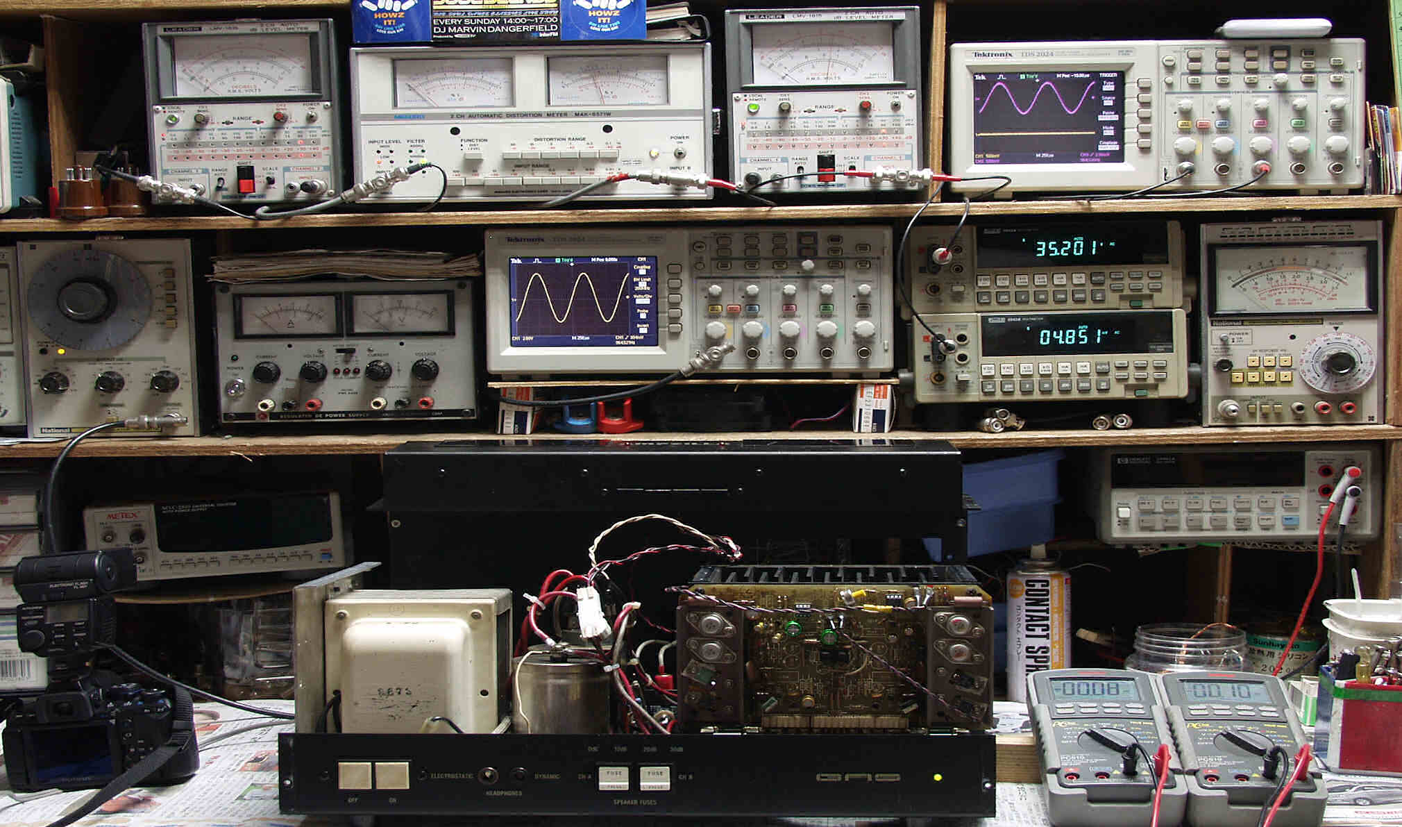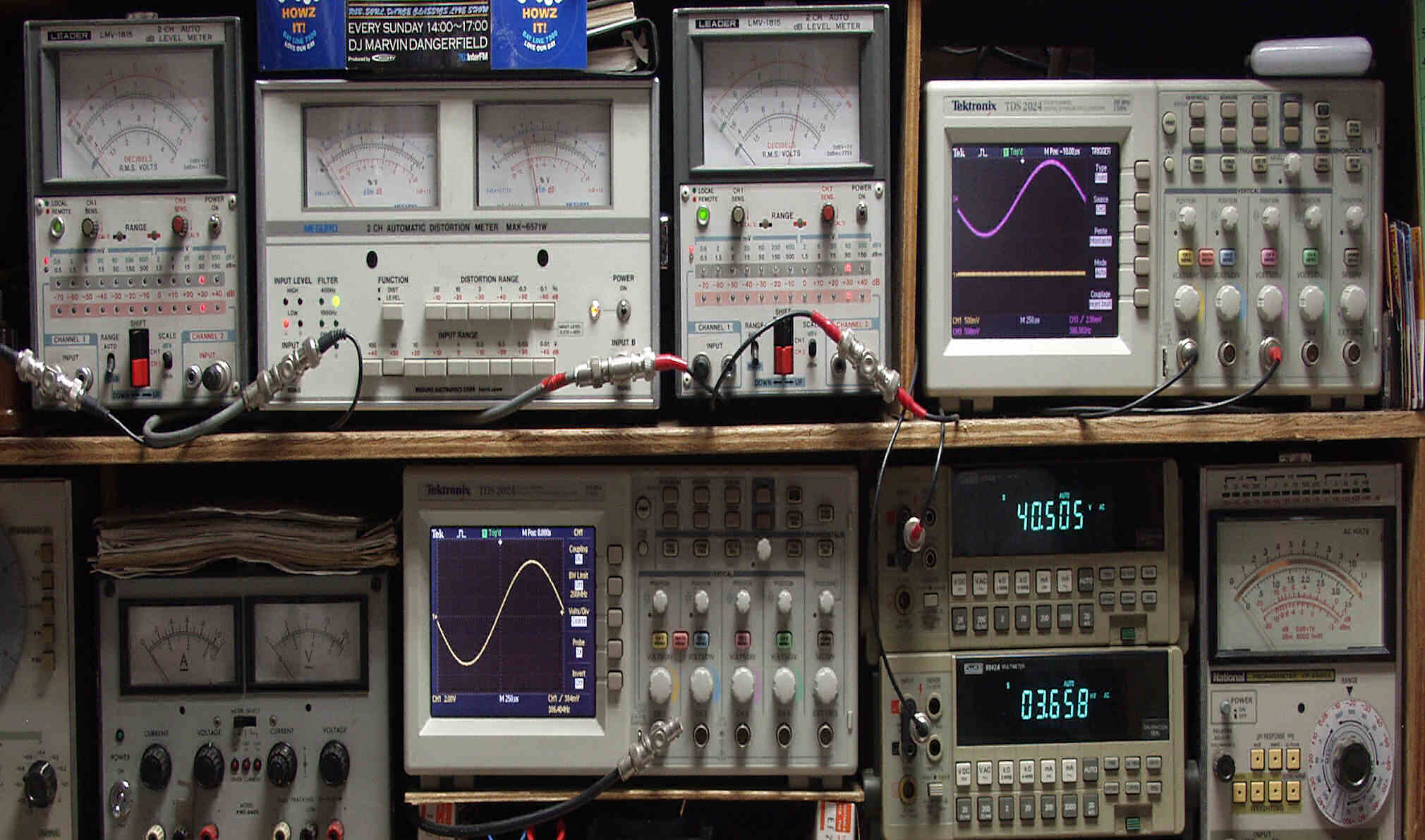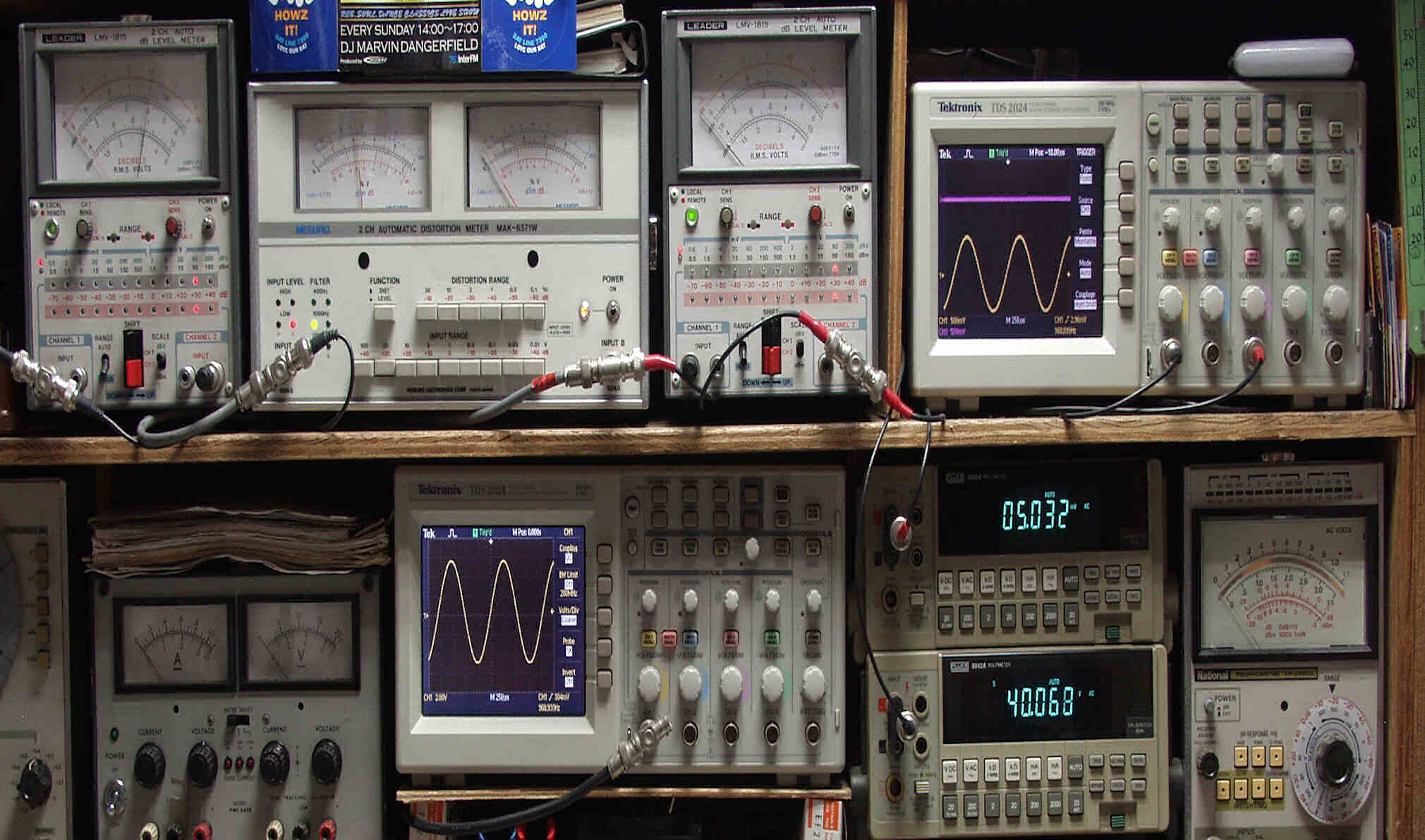 上段中左 歪み率計=出力の歪み率測定 左メータ=L出力、右メータ=R出力