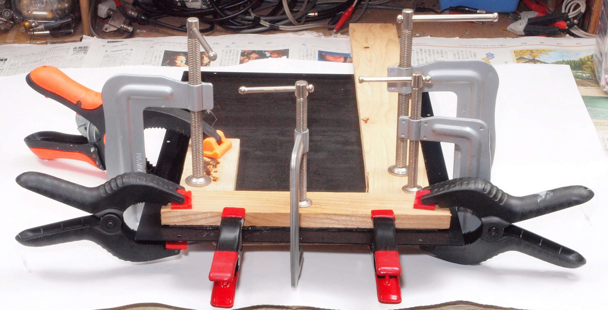 | CA2. 修理中 上蓋裏のフエルト。 シャコ万力やクランプで接着する。 | ||||||||||||||||||||||||||||||||||||