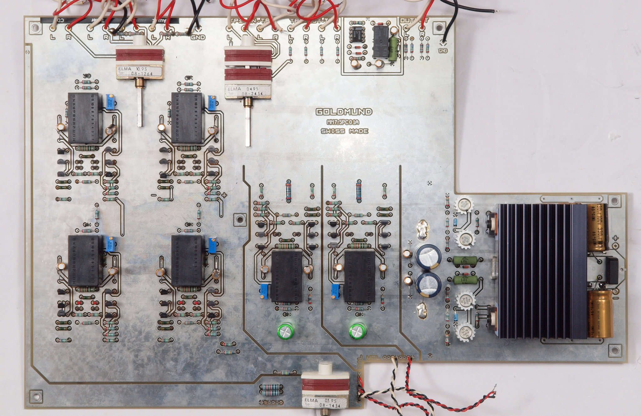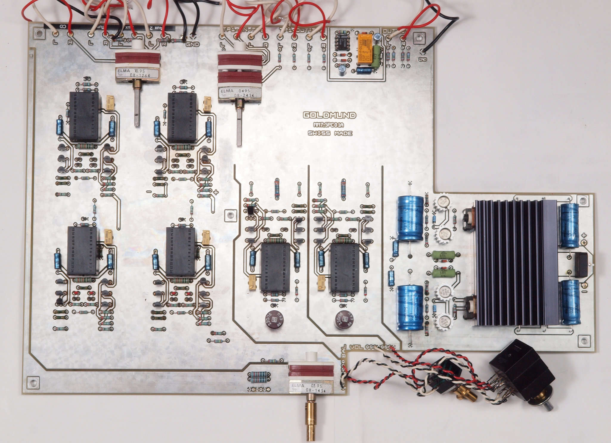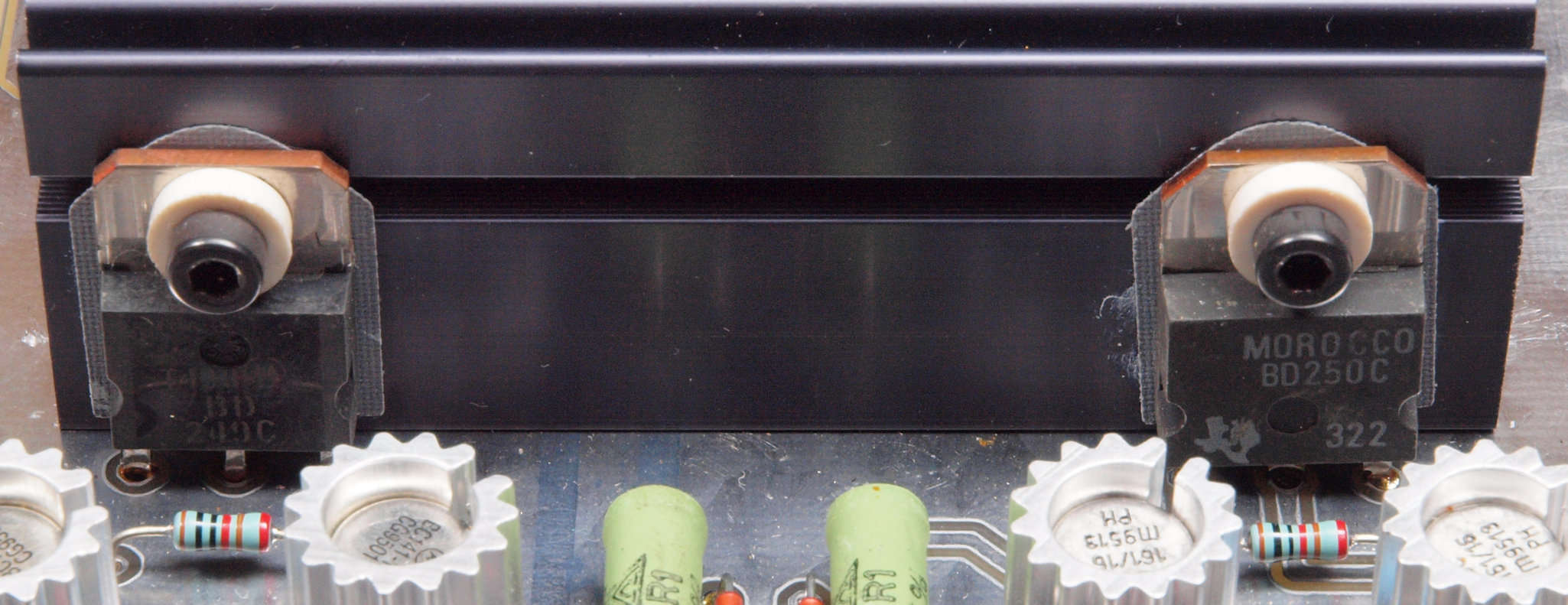 | C31. 修理前 入力アンプ後段基板。 黒い長方形の物2個がモジュール。 | ||||||||||||||||||||||||||||||||||||
