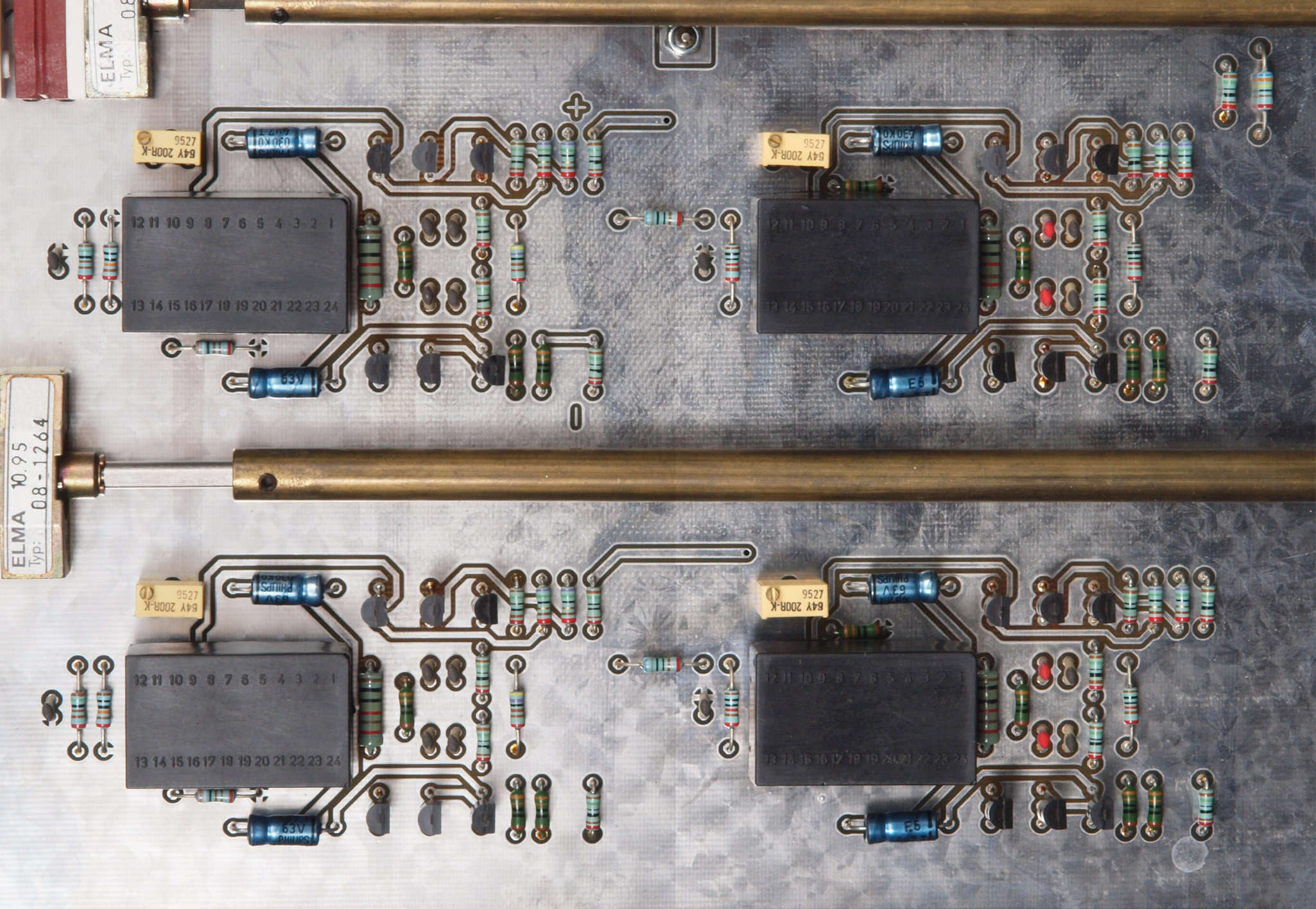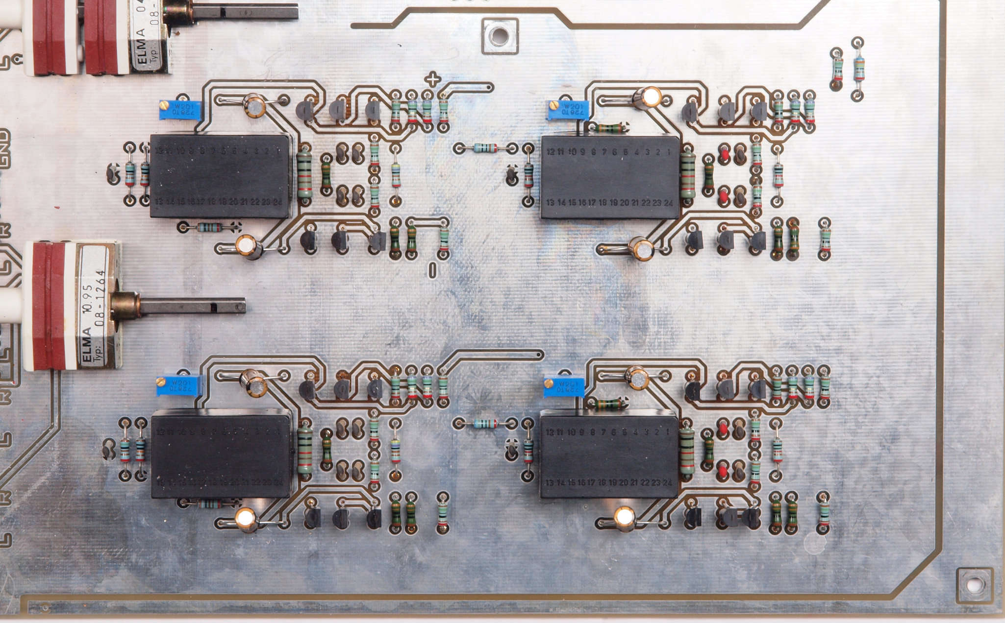 | C11. 修理前 入力アンプ基板。 黒い長方形の物4個がモジュール、外形は同じに見えるが、中身は不明? | ||||||||||||||||||||||||||||||||||||