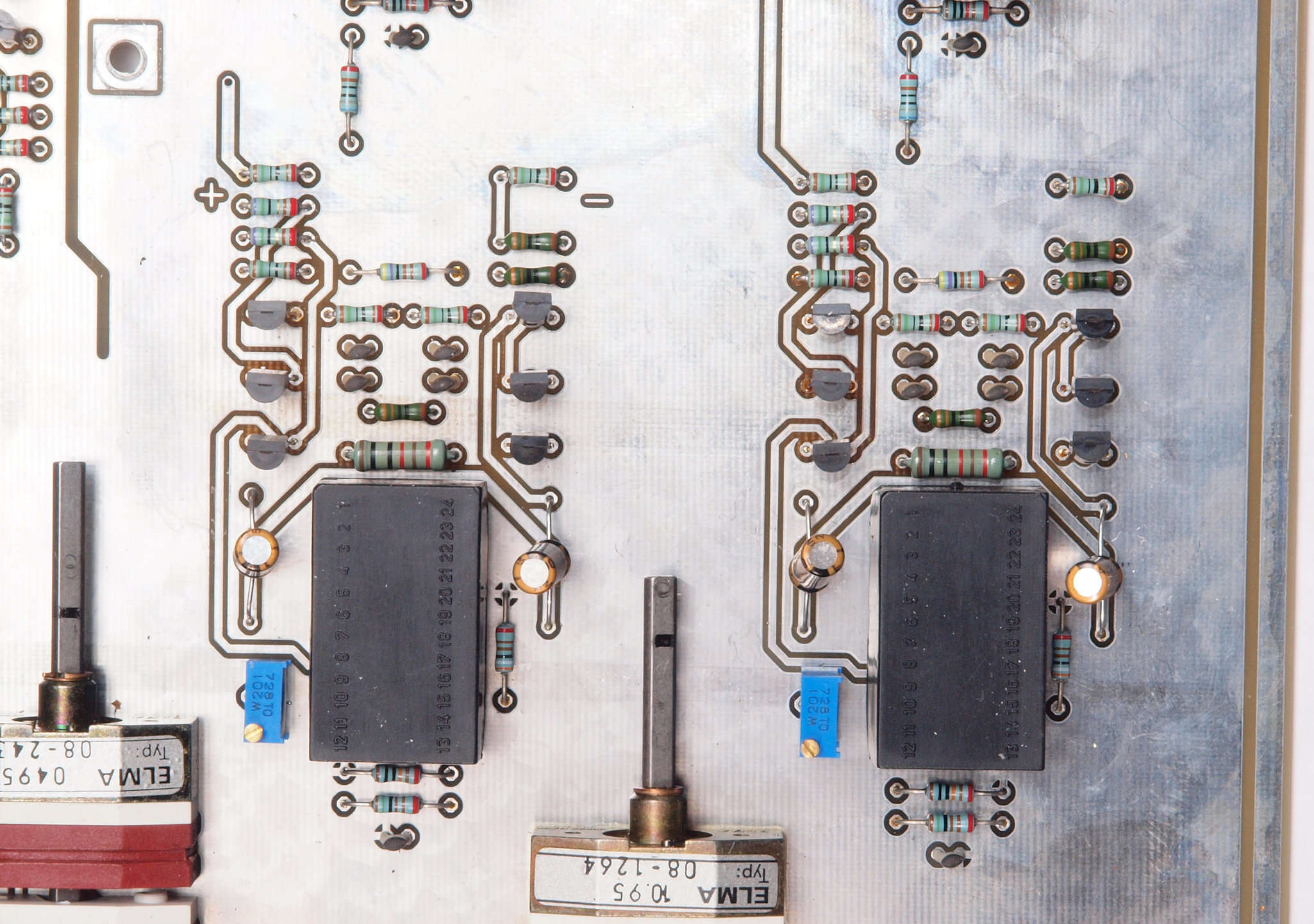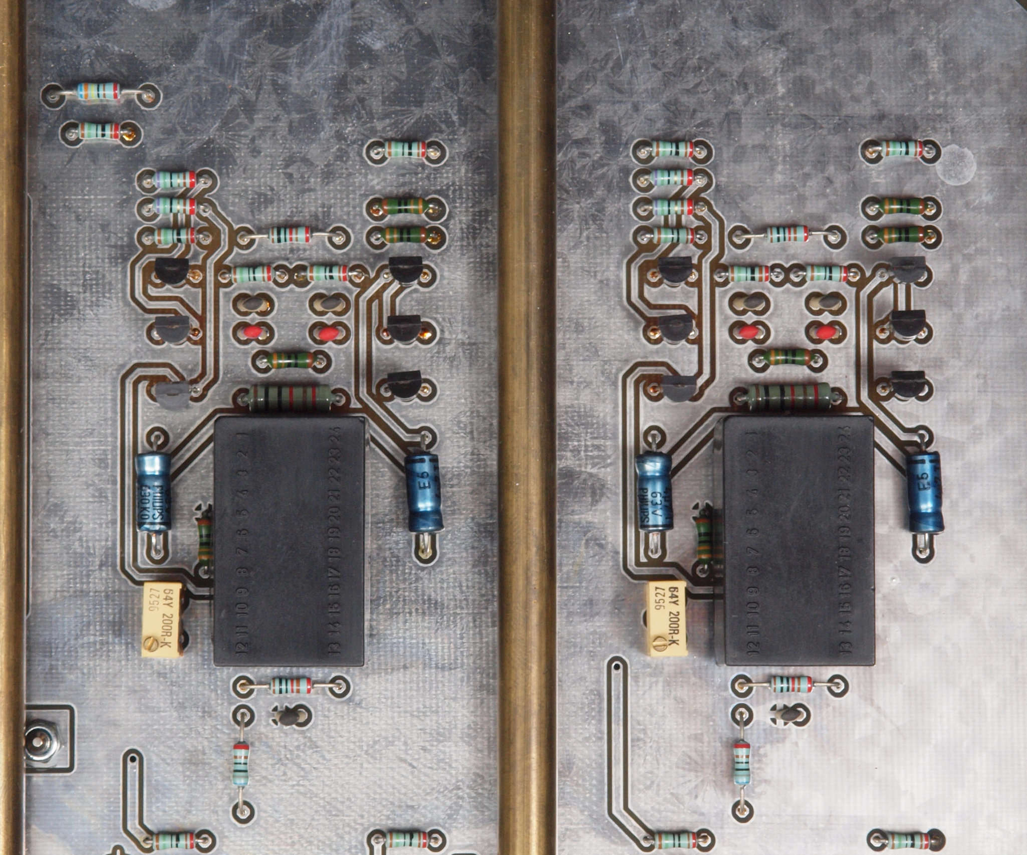 | C21. 修理前 入力アンプ前段基板。 黒い長方形の物2個がモジュール。 | ||||||||||||||||||||||||||||||||||||