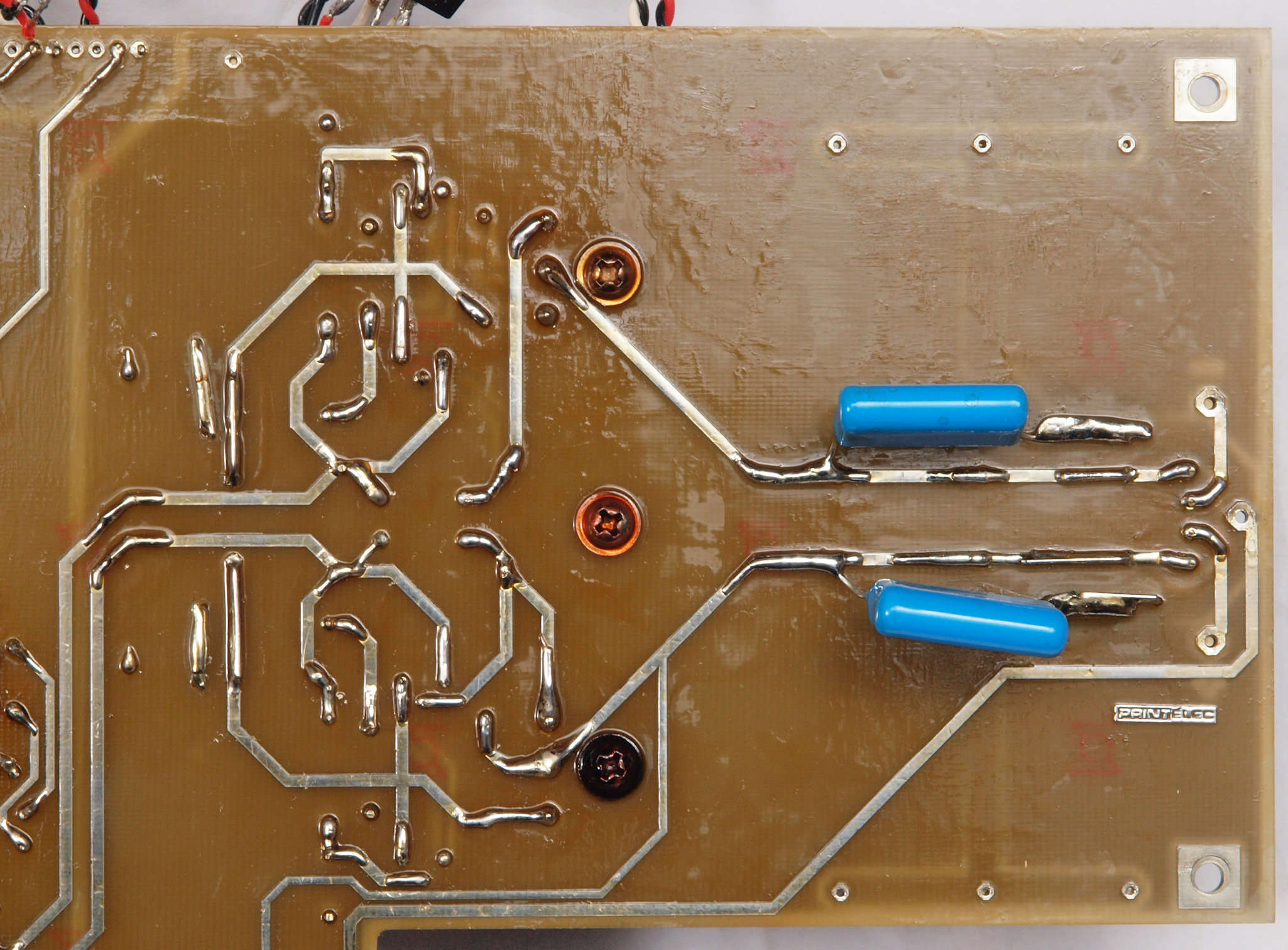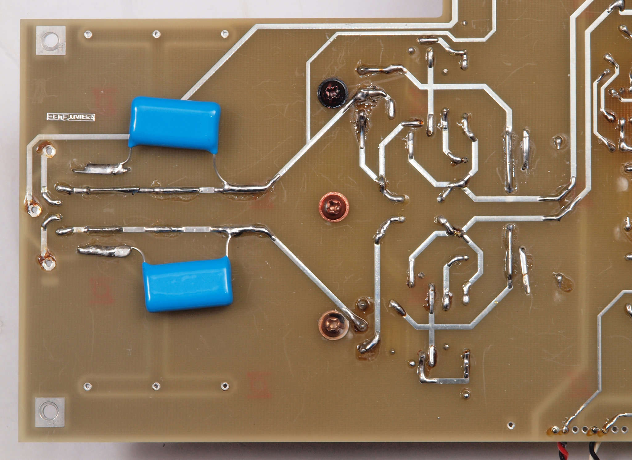 | C58. 修理(半田補正)後 電源基板裏。 全ての半田をやり修す、フイルムコンデンサー2個追加。 | ||||||||||||||||||||||||||||||||||||