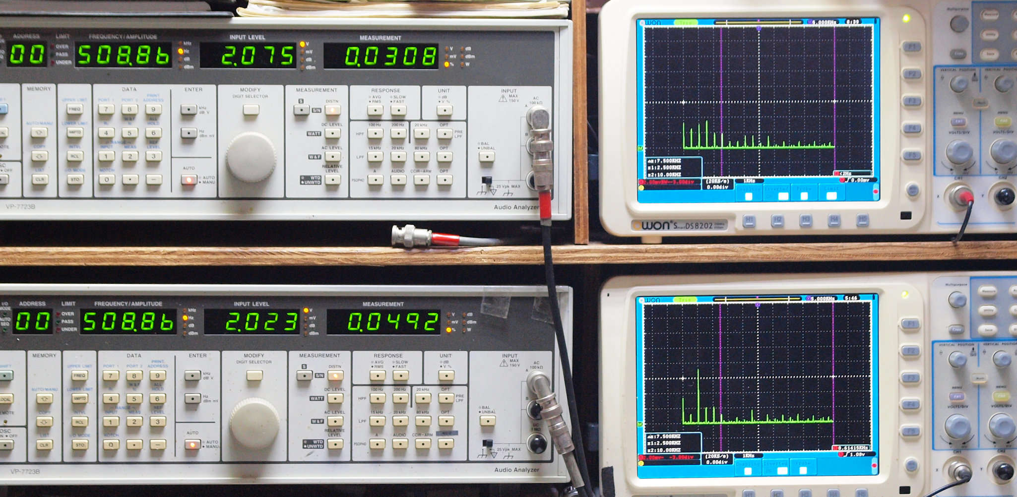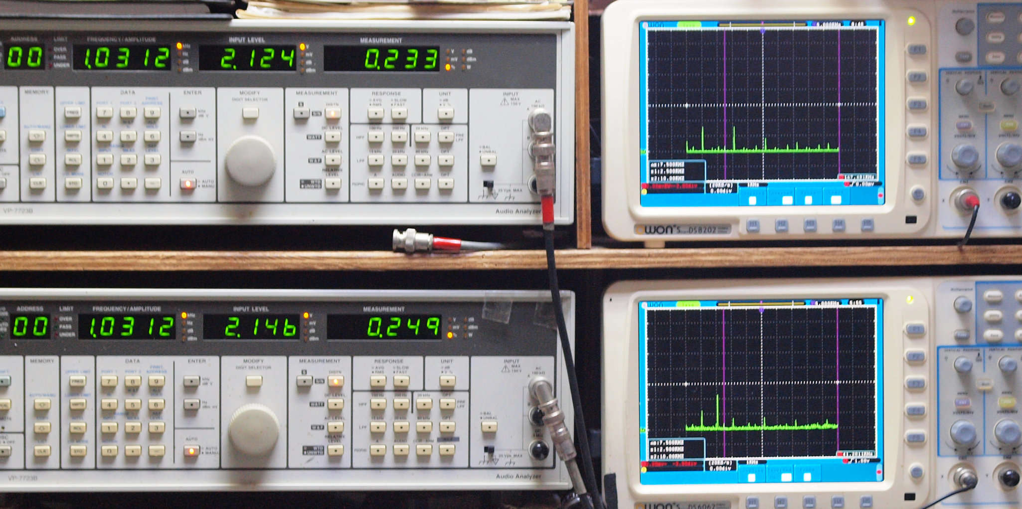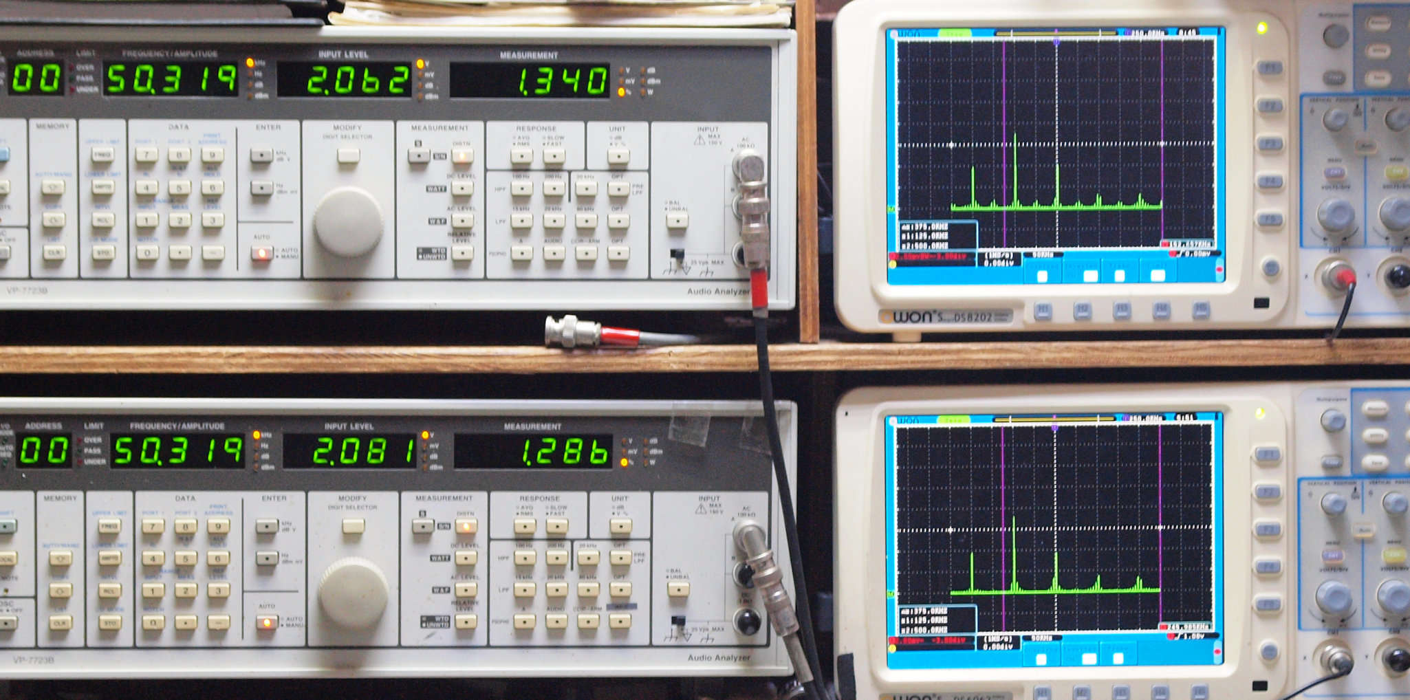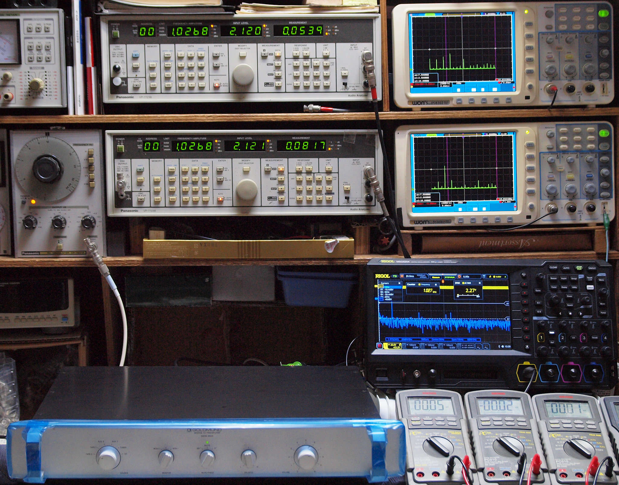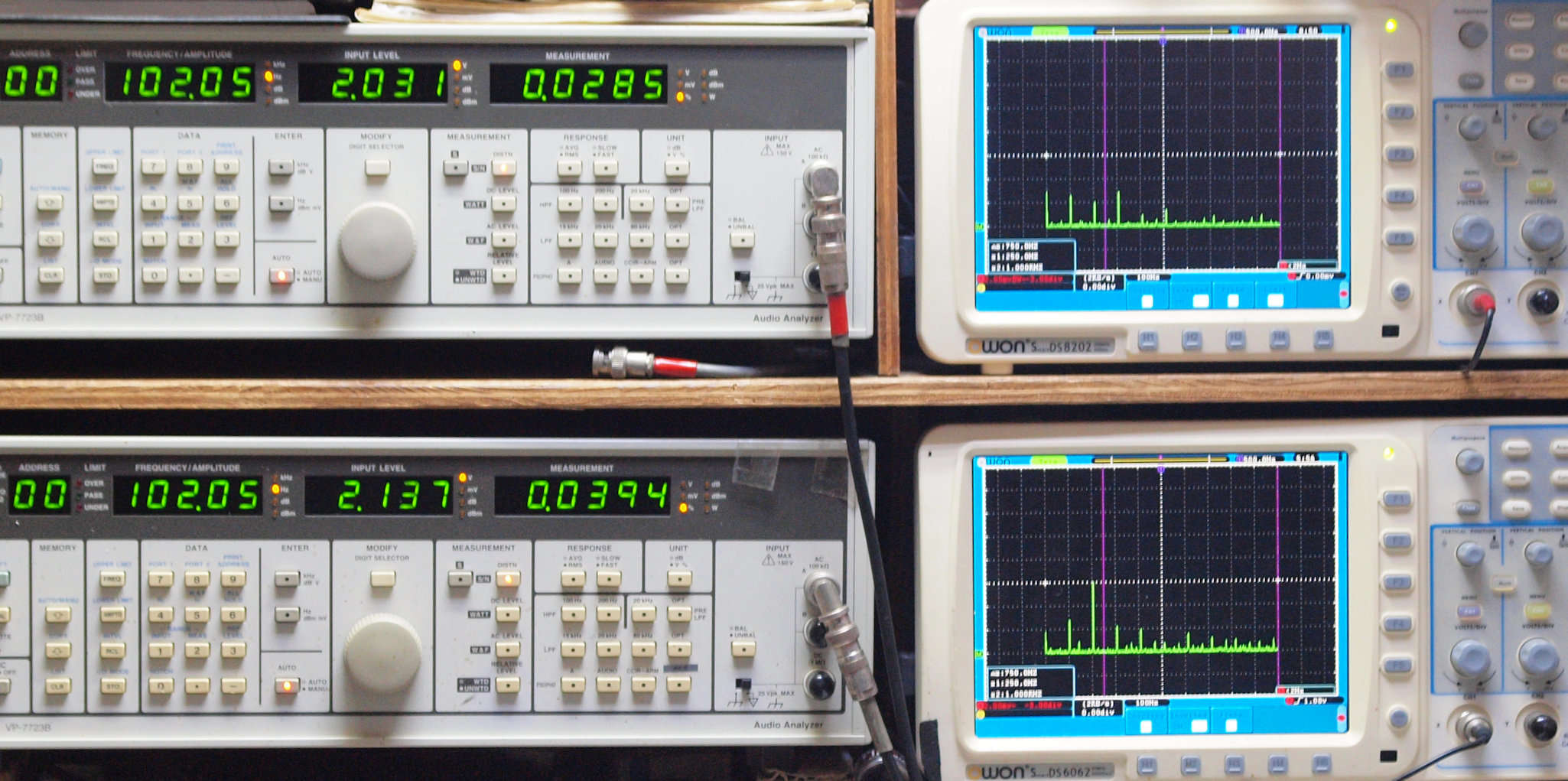 | E. 調整・測定。 画像をクリックすると、大きく(横幅2050ドット)表示されます。 E0. 出力・歪み率測定・調整。 「見方」。 上段中 右側出力を「Audio Analyzer Panasonic VP−7723B」により測定。 表示LED、 左端=メモリーNo、 中左=周波数測定、 中右=出力電圧測定、 右端=歪み率測定。 上段右端 VP−7723Bの基本波除去出力を「owon SDS8202(200MHZ)」で「FFT分析」表示。 下段中 左側出力を「Audio Analyzer Panasonic VP−7723B」により測定。 表示LED、 左端=メモリーNo、 中左=周波数測定、 中右=出力電圧測定、 右端=歪み率測定。 下段右端 VP−7723Bの基本波除去出力を「owon SDS6062(200MHZ)」で「FFT分析」表示。 下段左端 オーディオ発振器 VP−7201A より50Hz〜100kHzの信号を出し(歪み率=約0.003%)、ATT+分配器を通し、AMPに入力。 よって、ダイアル設定出力レベルより低くなります。測定機器の仕様や整備の様子はこちら、「VP−7723B」「VP−7201A」。 FFT画面の見方はこちら。 |