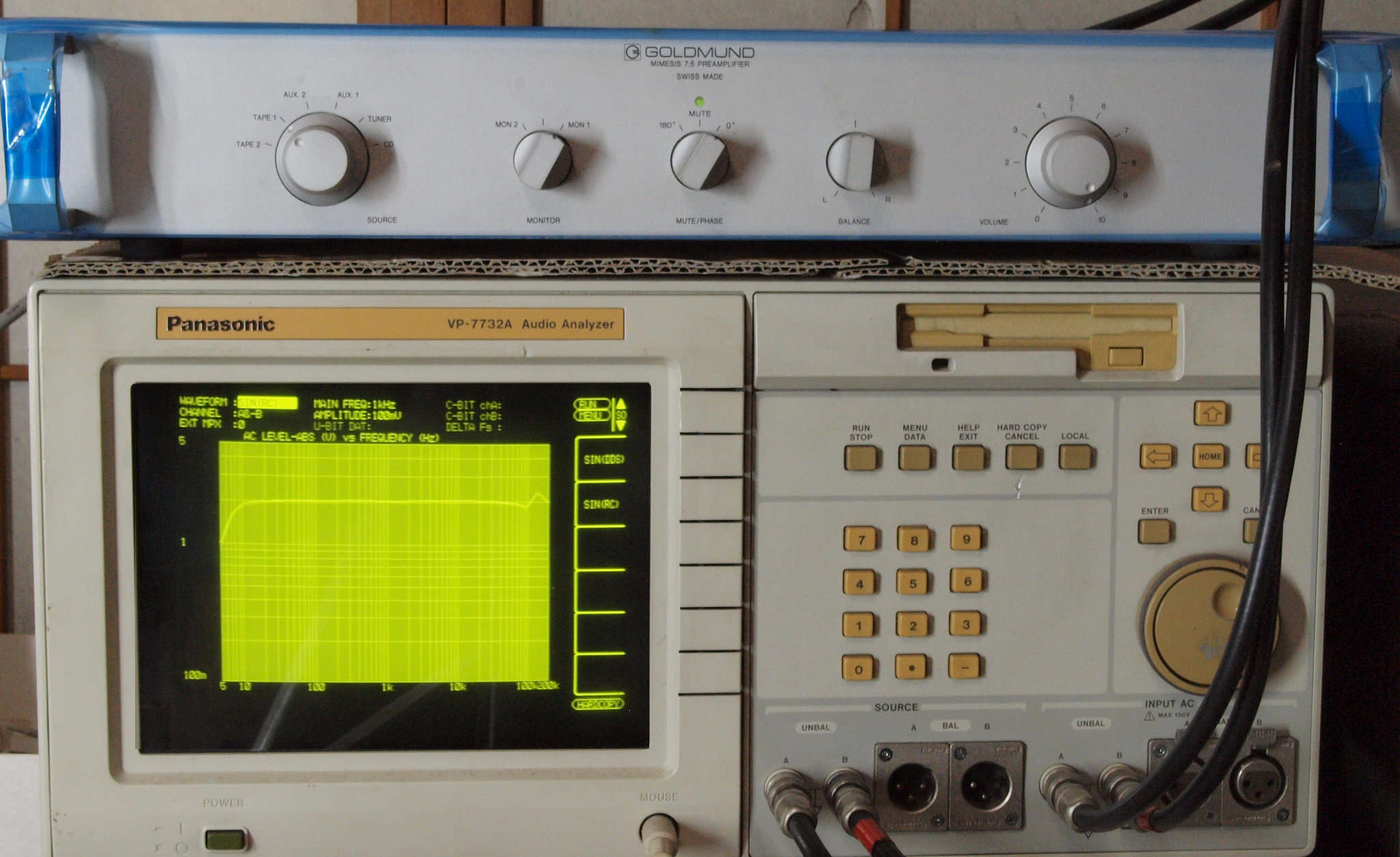 | F. 上位測定器による 調整・測定。 画像をクリックすると、大きく(横幅2050ドット)表示されます。 F0. 下のオーディオアナライザーVP−7732Aで自動測定 |