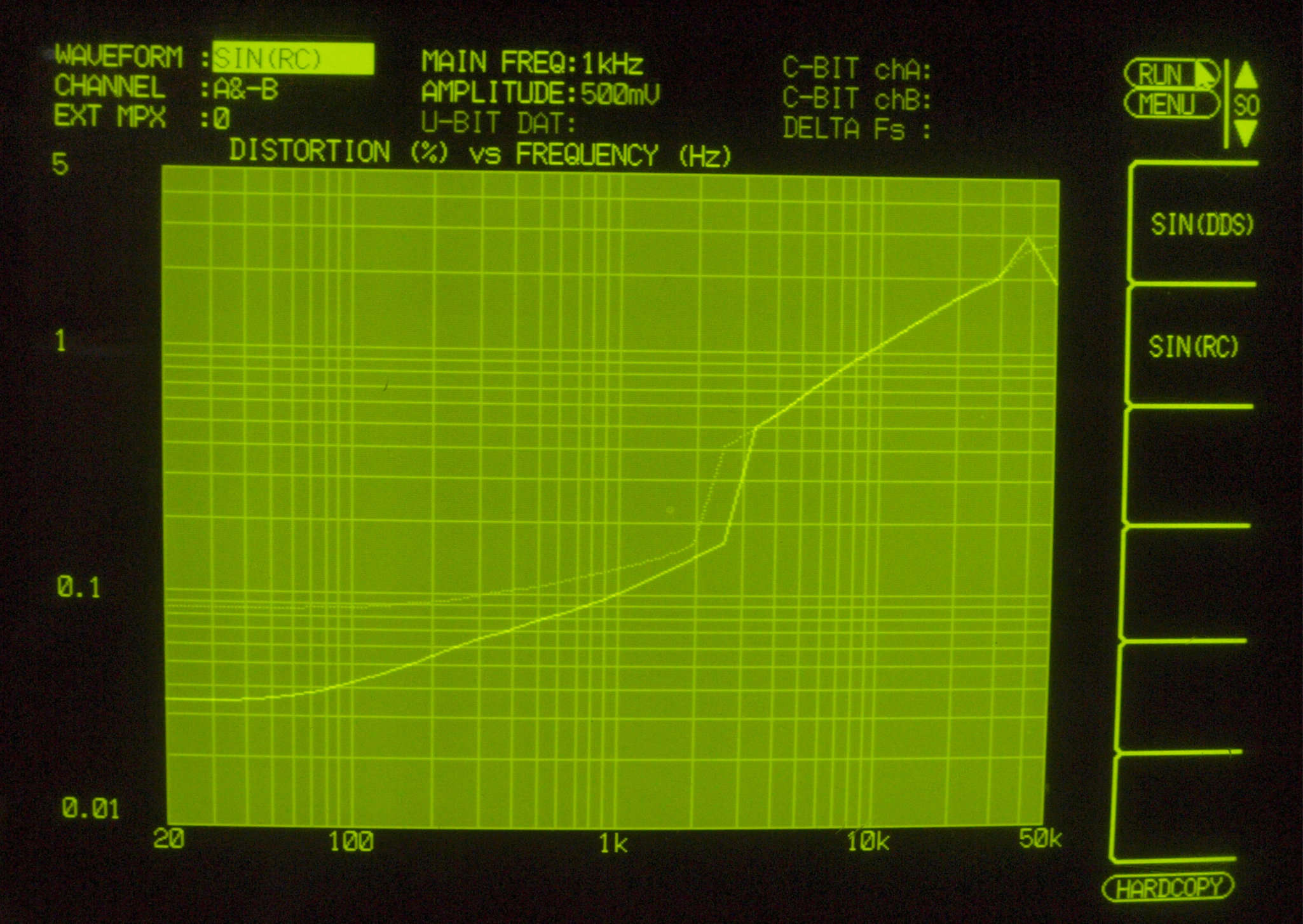| F4. 歪み率特性測定(CD入力) AUX入力端子へ500mV一定入力 VRはmax。 左出力=薄(細い)色 右出力=濃い(太い)色 |