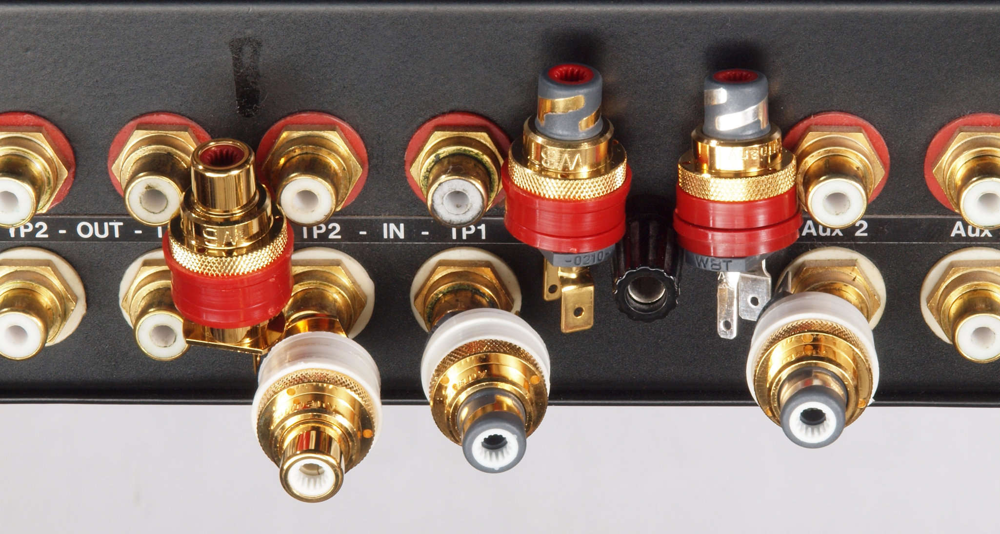 | A32. 点検中 入出力RCA端子郡。左=WBT−0201、 中=WBT−0210Cu、 右=WBT−0210Ag。 OUTPUT、TP1、CD の3箇所をWBT−0201に交換。 |