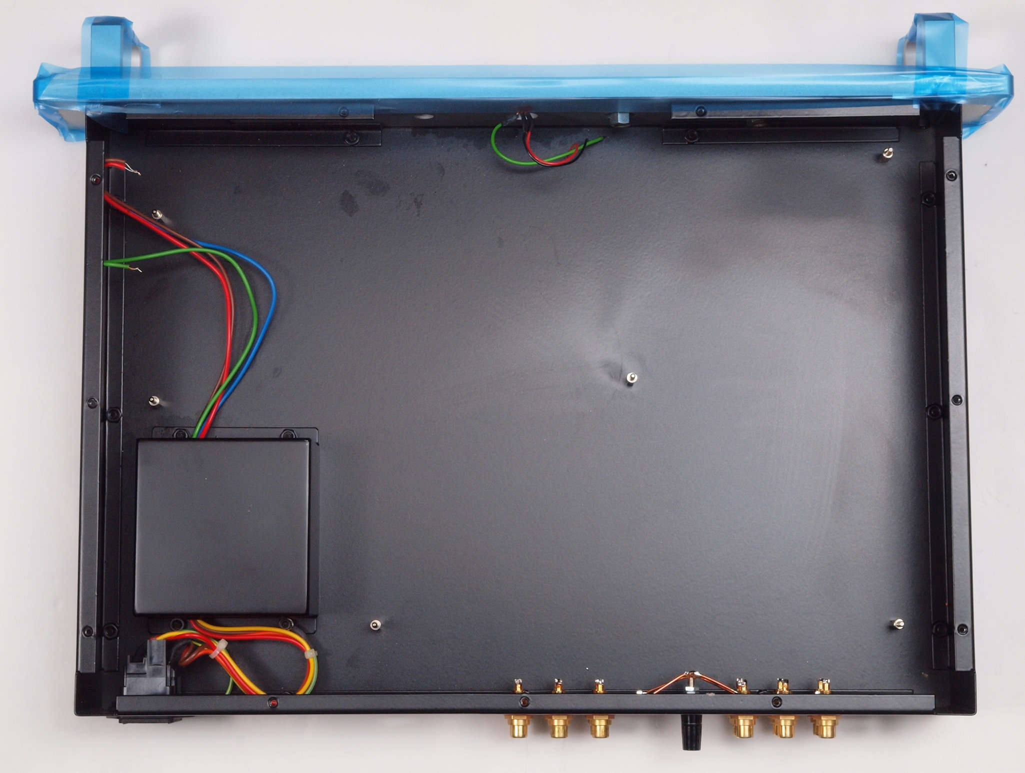 | C. 修理状況 。 画像をクリックすると、大きく(横幅2050ドット)表示されます。 C0. 修理中 基板を全て取り除いたシャーシを上から見る。 |