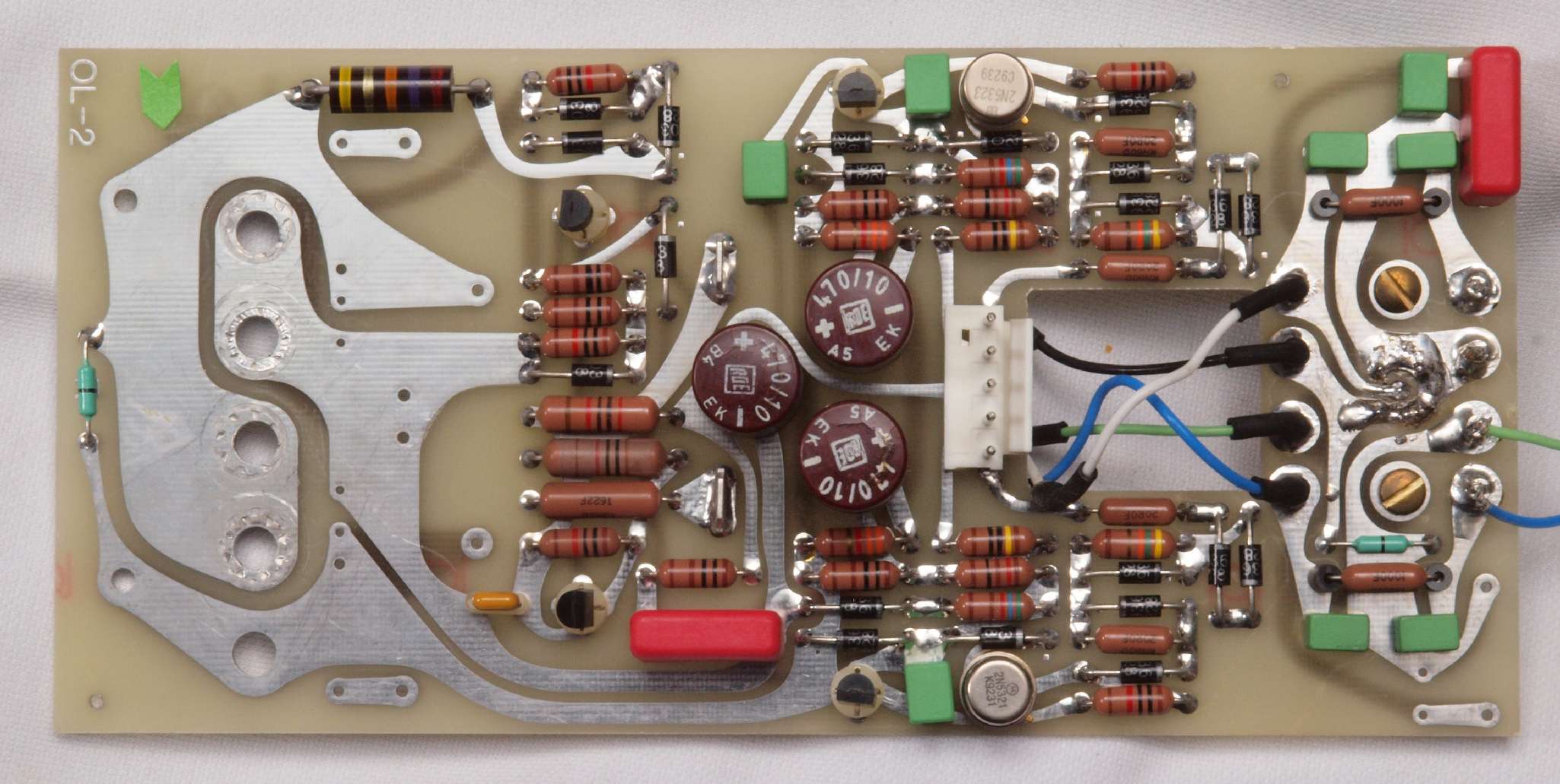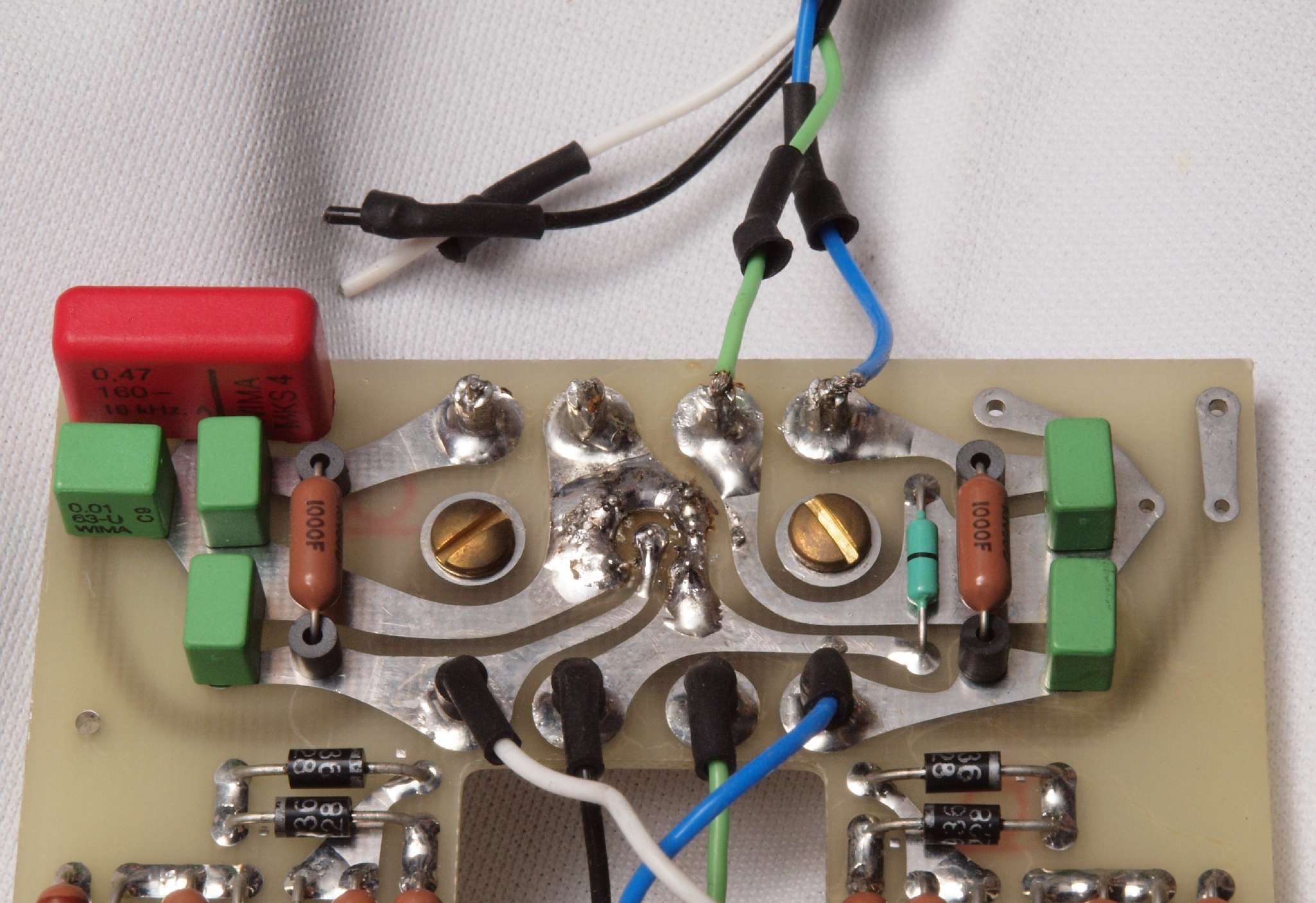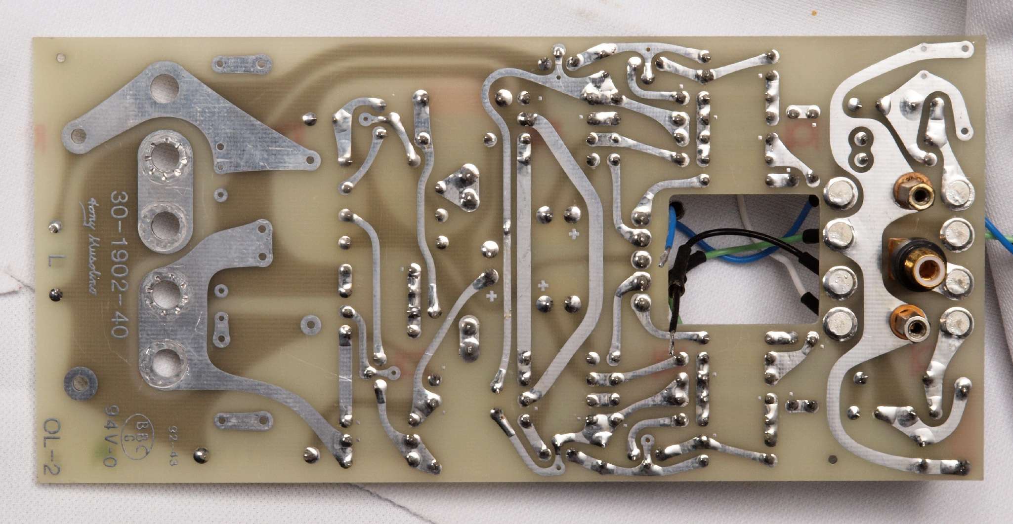 C52. 修理(半田補正)後 左側SP接続端子裏プロテクト基板。電解コンデンサー3個交換、 半田を全部やり直す。