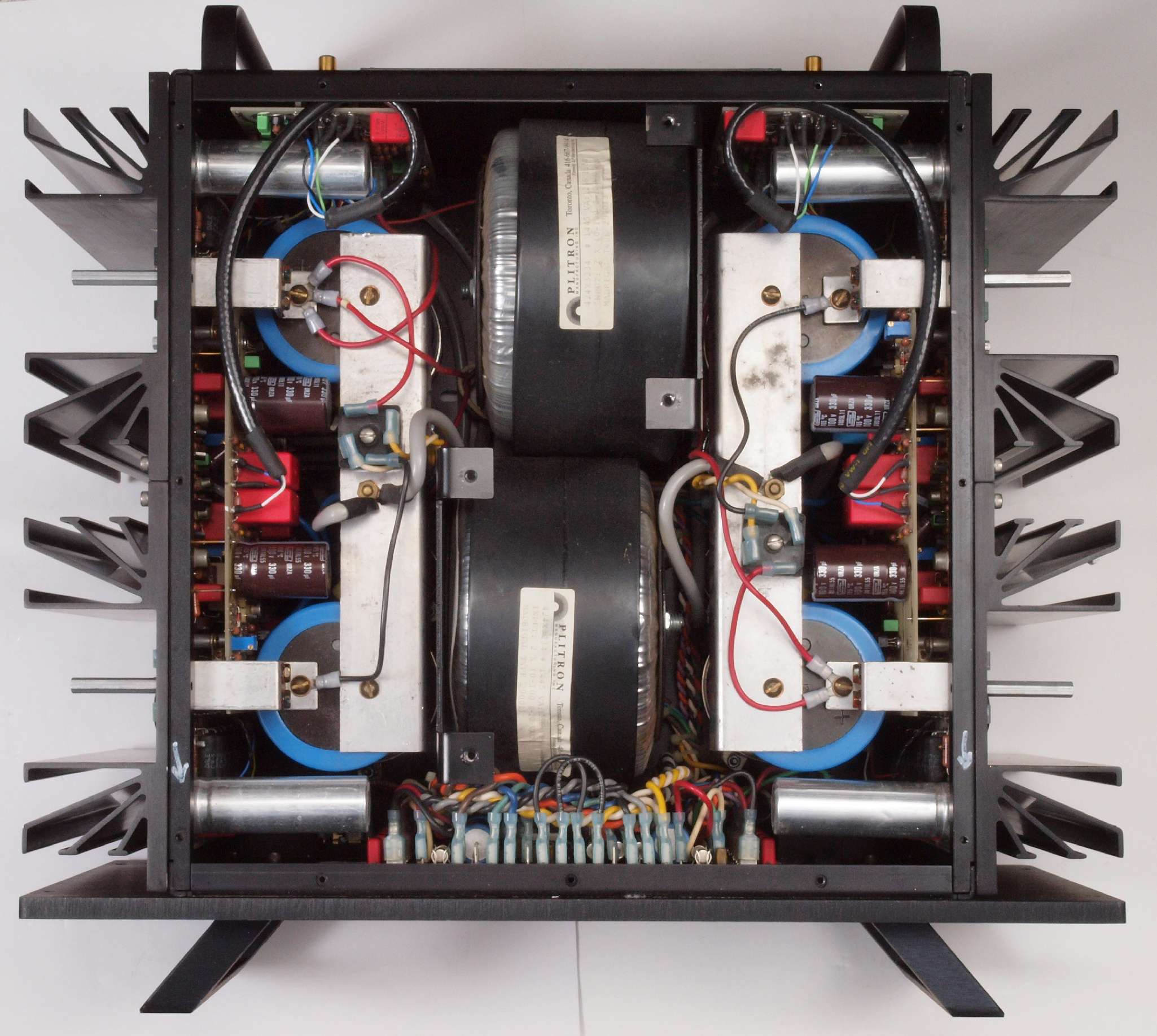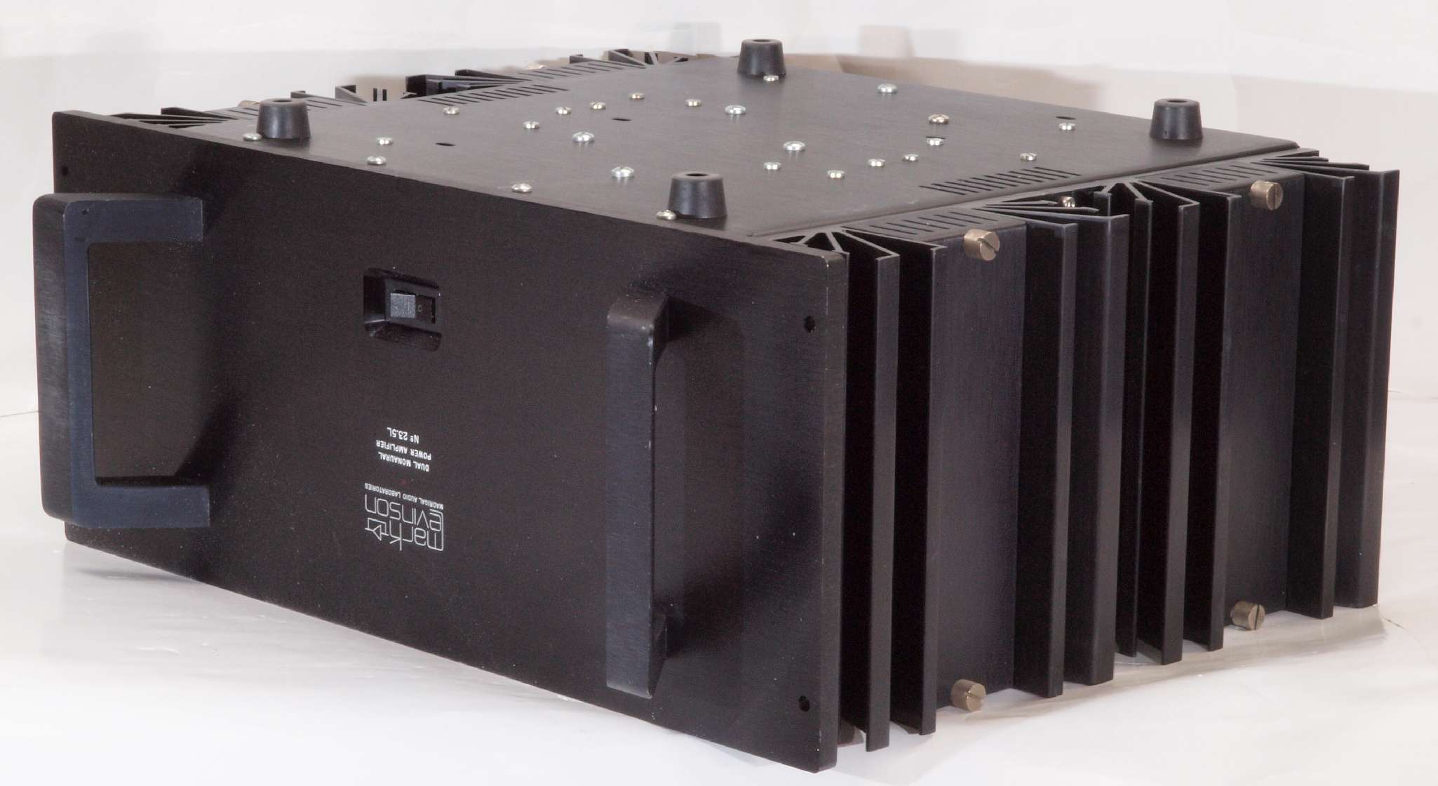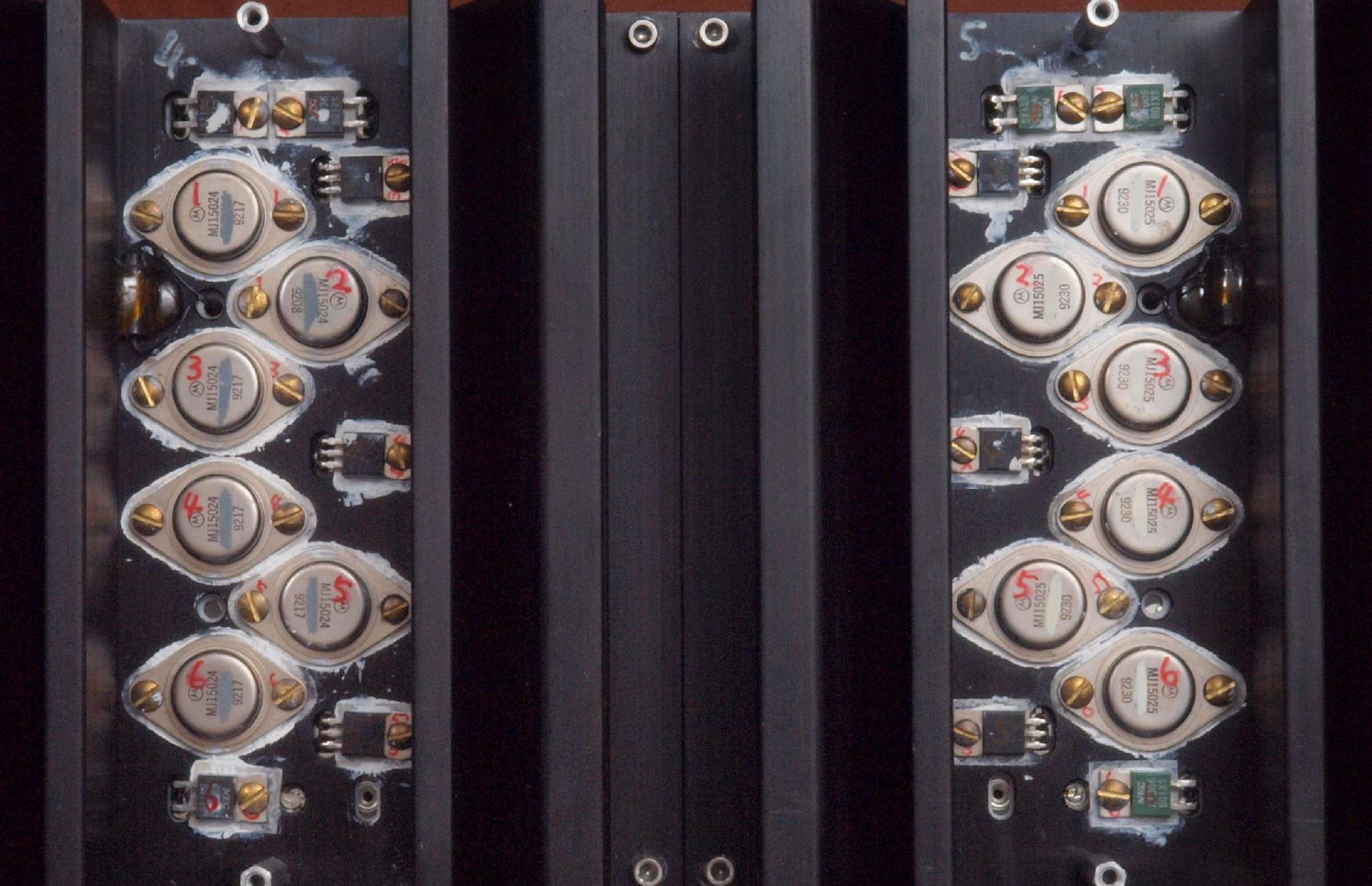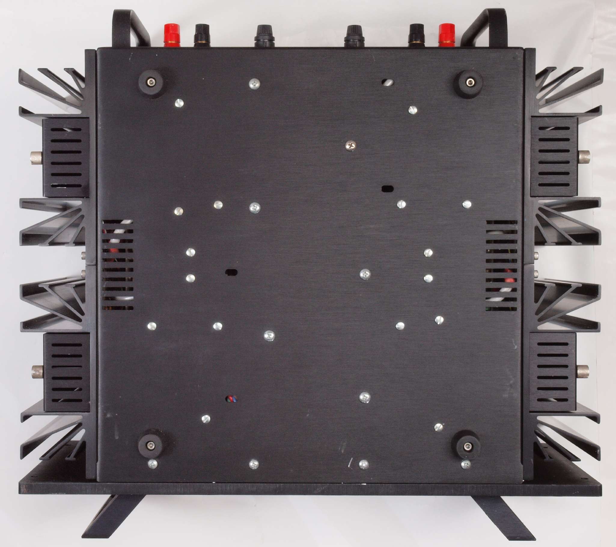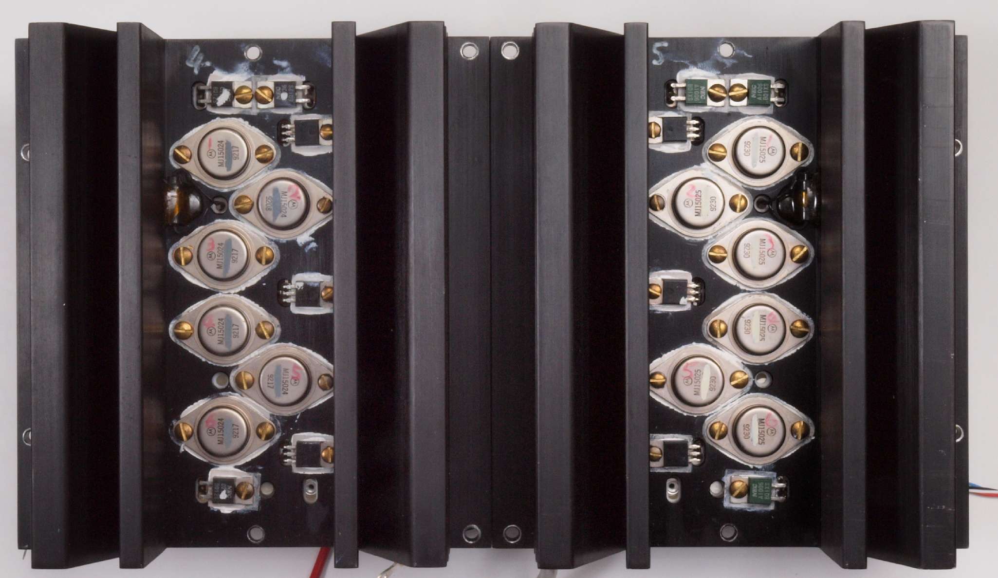 C34. 修理後 右側終段ブロック裏。 基板に力が加わらない様、修理中は放熱器を上下固定して置く。