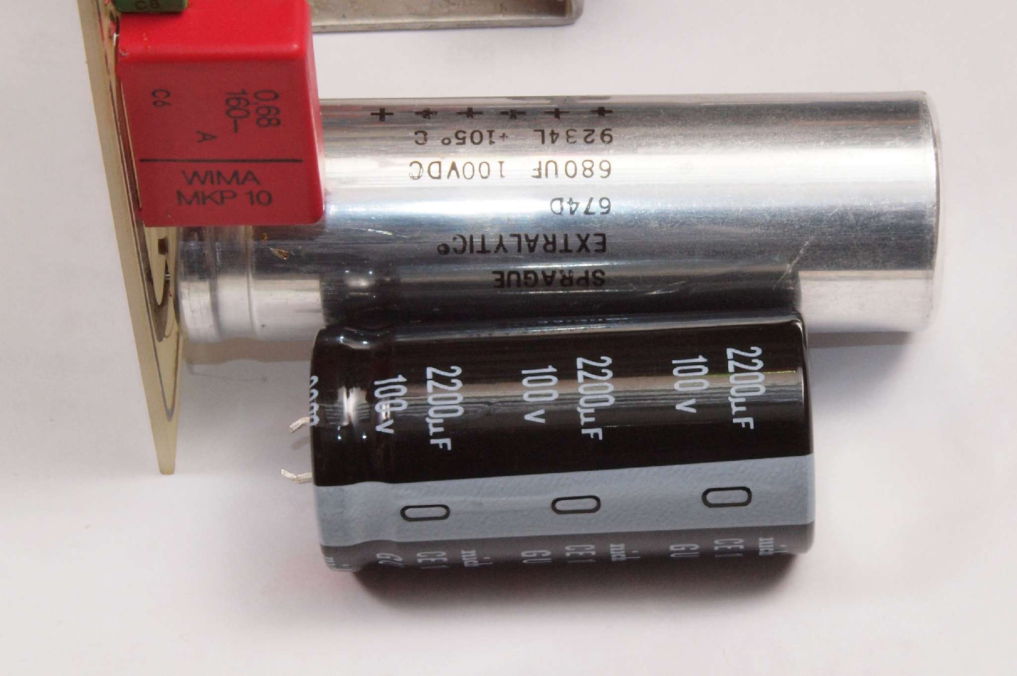 上、付いている=680μF/100VW、下、交換する=2200μF/100VW。