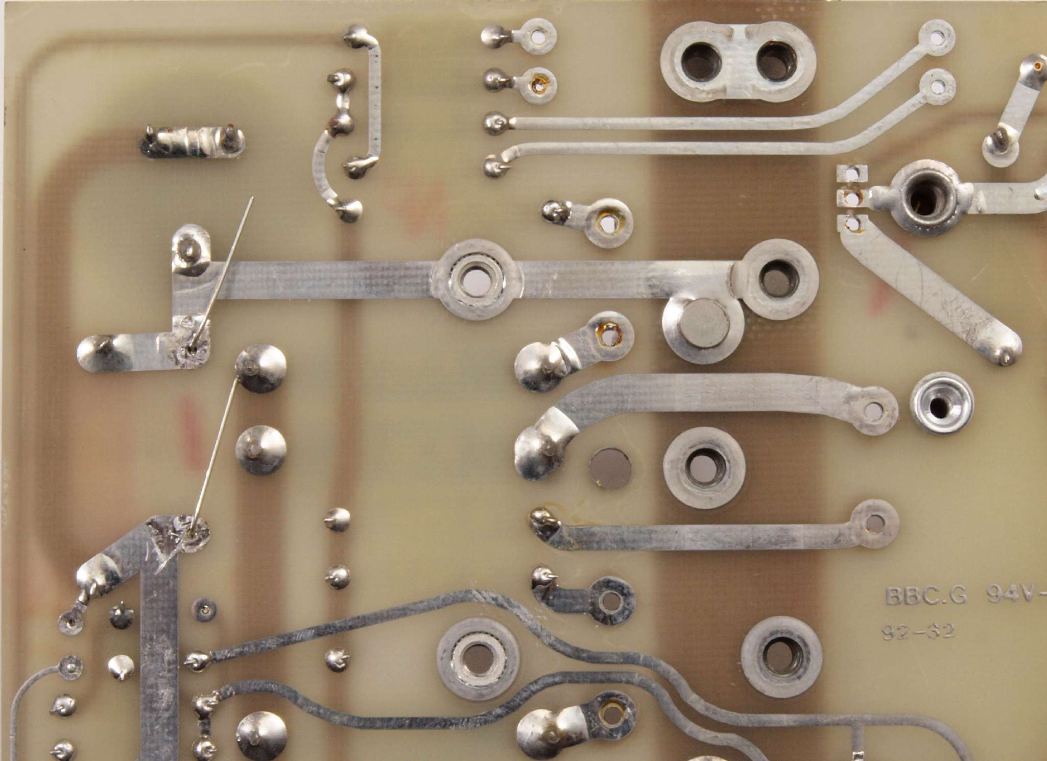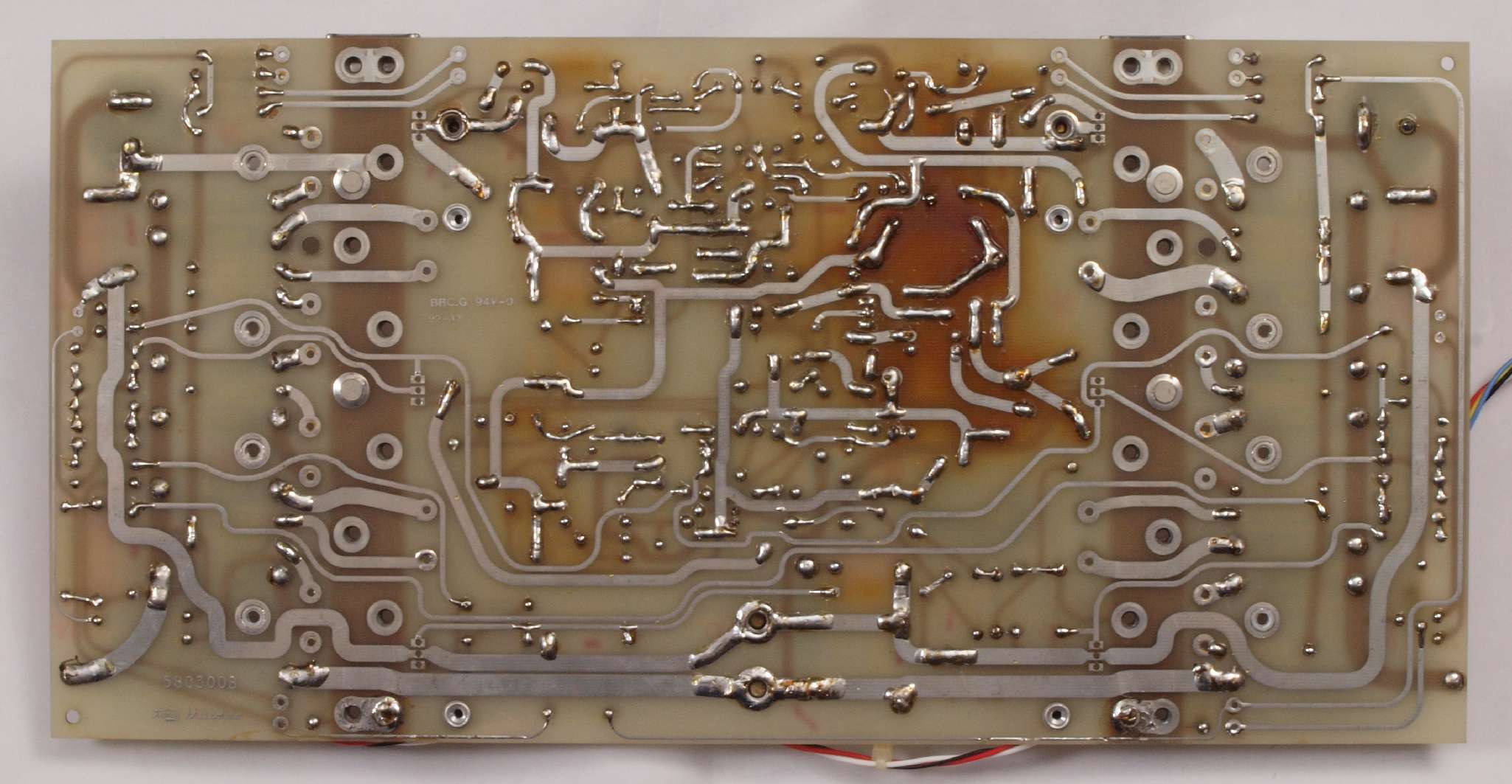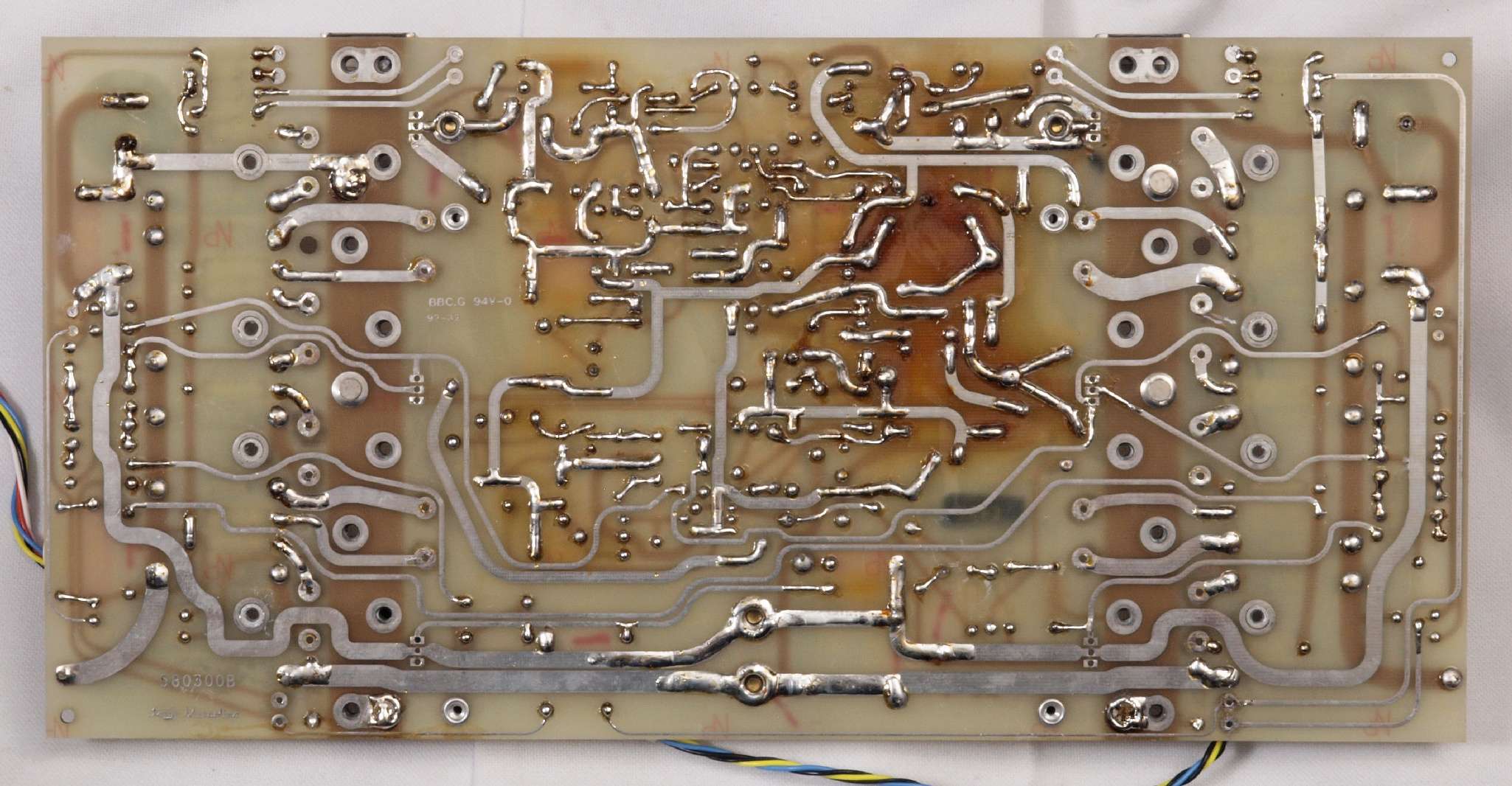 C782. 修理中 左側終段基板裏。 前回の修理で半田ブリッジ。