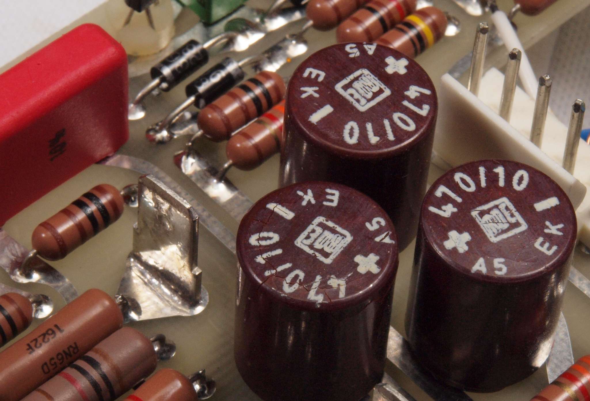 C112. 修理中 右側SP接続端子裏プロテクト基板。ヒビの入った3個の電解コンデンサー。