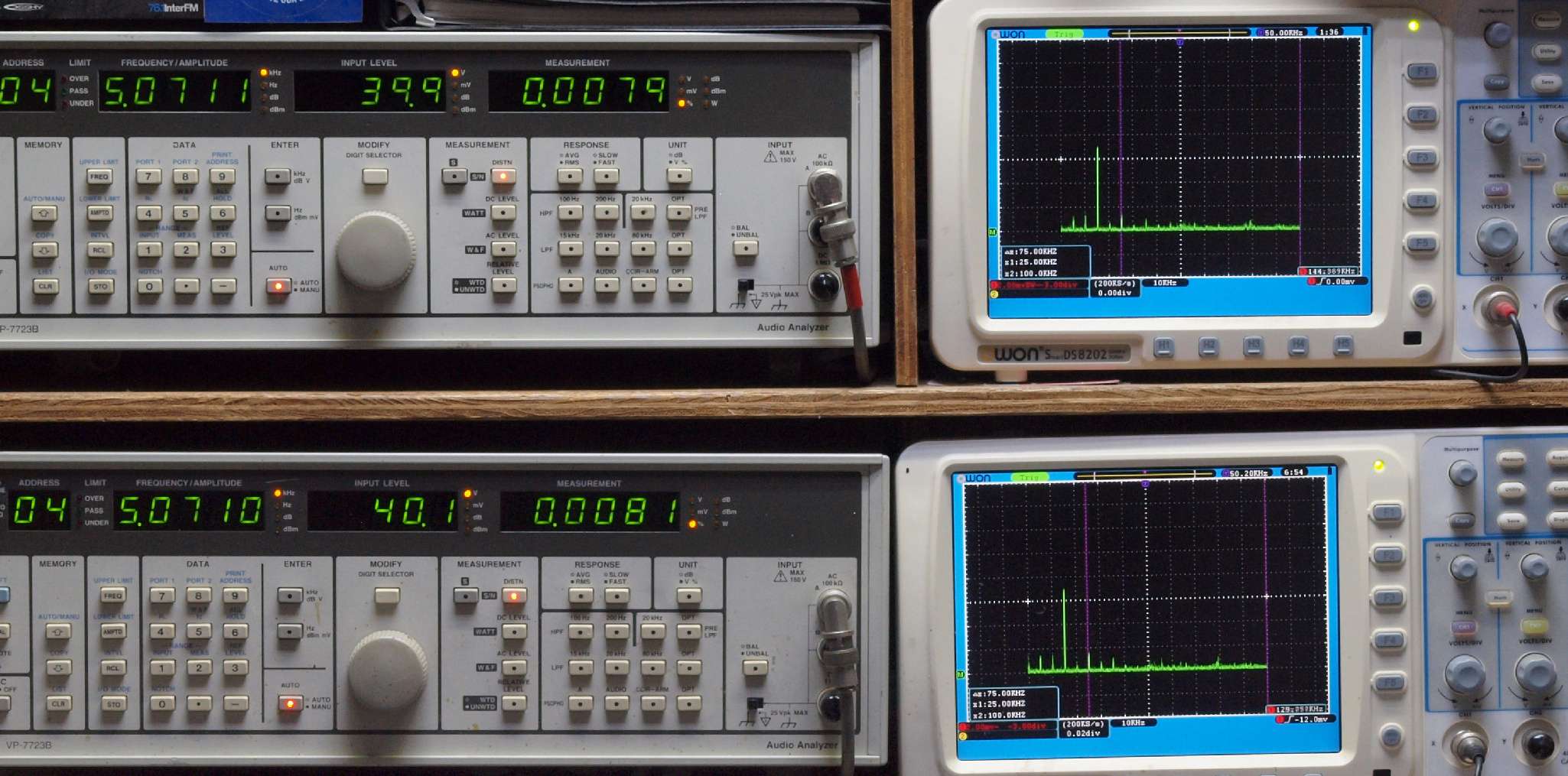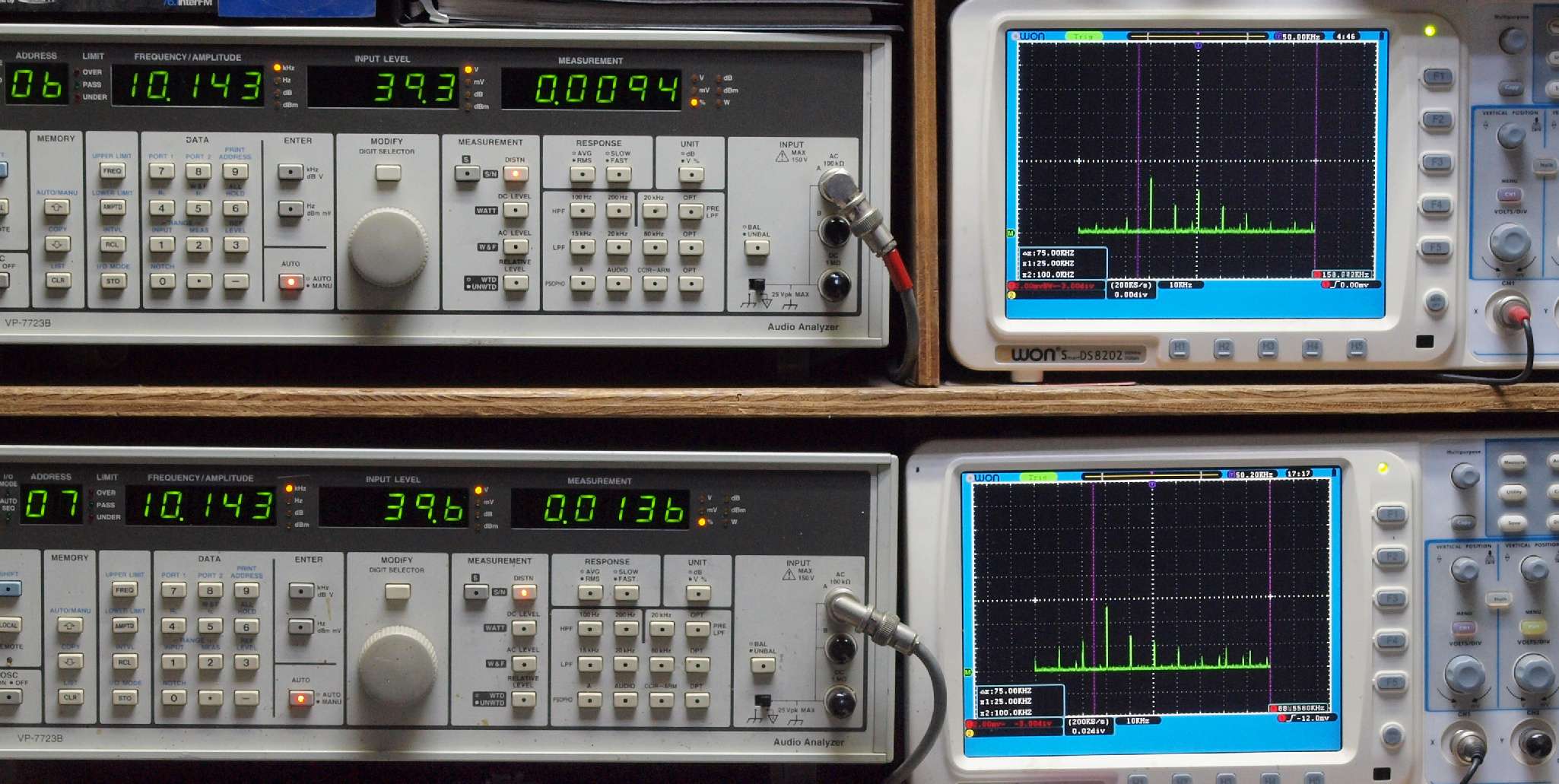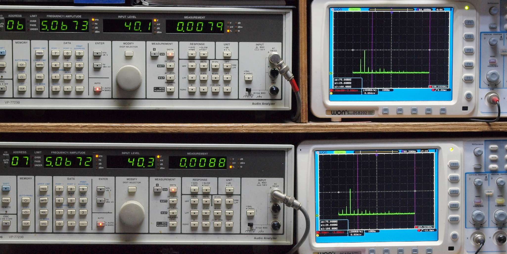 よって、ダイアル設定出力レベルより低くなります。測定機器の仕様や整備の様子はこちら、「VP−7723B」「VP−7201A」。 FFT画面の見方はこちら。