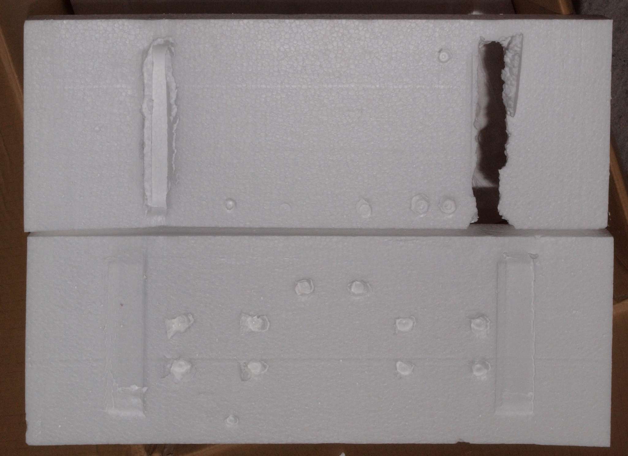 A13. 点検中 梱包箱の下発泡スチロール。 下足も埋まり、下シャーシの止めビスの頭や放熱器のフィンの跡がある。