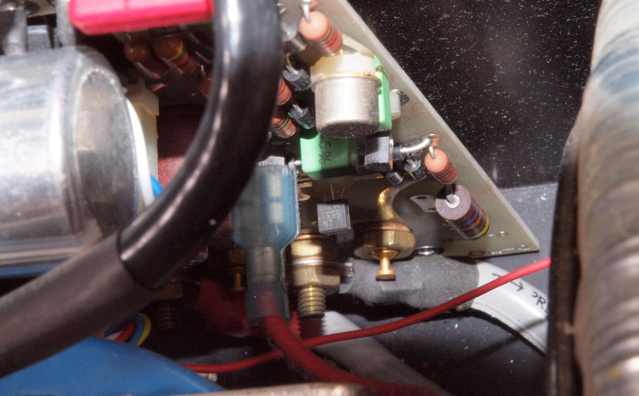 C113. 修理中 右側SP接続端子裏プロテクト基板。RCA端子からの入力線が太く固いので、チューブの中で半断線。