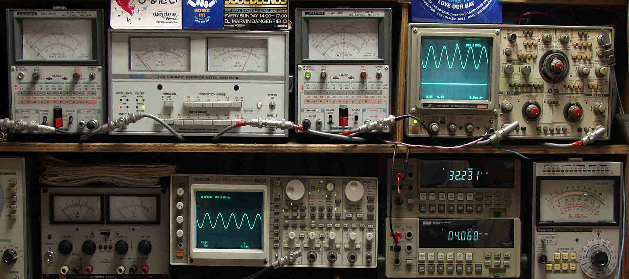 | E. 調整・測定 E1. 出力・歪み率測定 <見方> 下段左端 オーディオ発振器より400HZ・1KHZの信号を出し(歪み率=約0.003%)これをAMPに入力し、出力を測定 下段中左 オシロ=入力波形(オーディオ発振器のTTLレベル) 下段中右上=周波数計 上段左端 電圧計=L側出力電圧測定、黒針のみ使用 上段中左 歪み率計=出力の歪み率測定 左メータ=L出力、右メータ=R出力 上段中右 電圧計=R側出力電圧測定、赤針のみ使用 上段右端 オシロ=出力波形 上=R出力、下=L出力(実際にはRL電圧計の出力「Max1V」を観測) 下段中右上 デジタル電圧計=R出力電圧測定 下段中右下 デジタル電圧計=L出力電圧測定 |