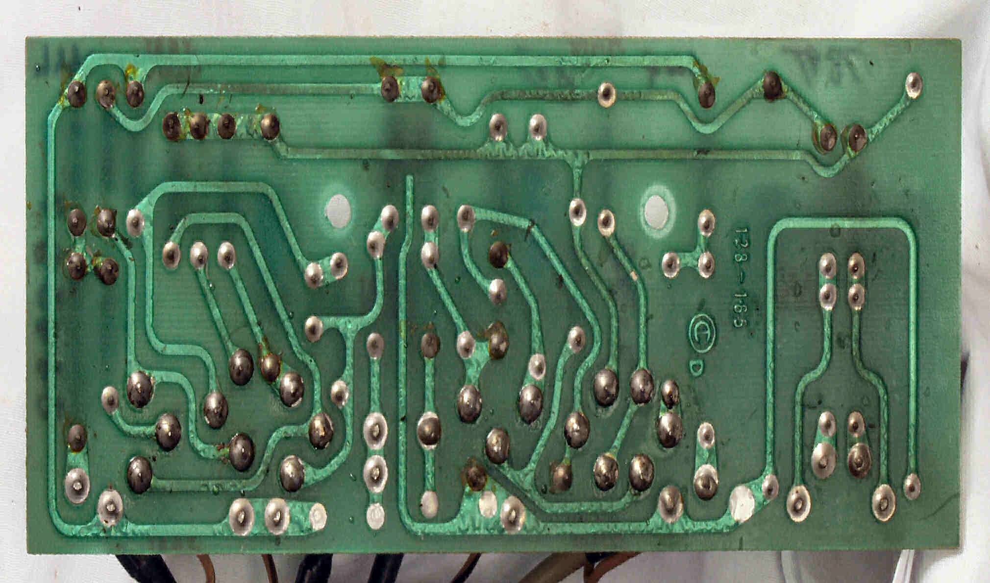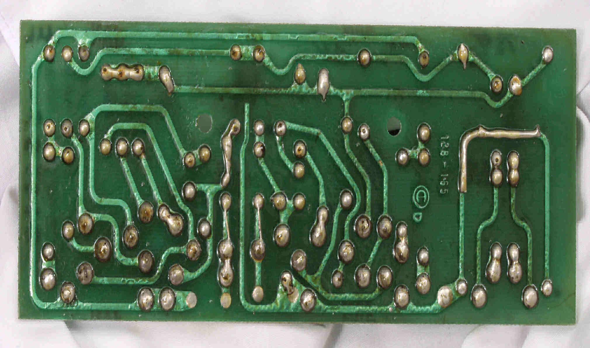| C3D. 修理(半田補正)後 プリAMP基板裏。 半田を全部やり直す。 | ||||||||||||||||||||||||||||||