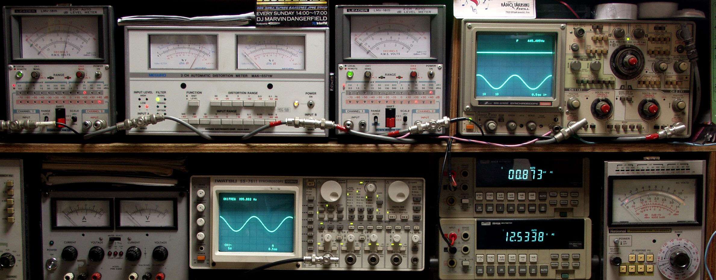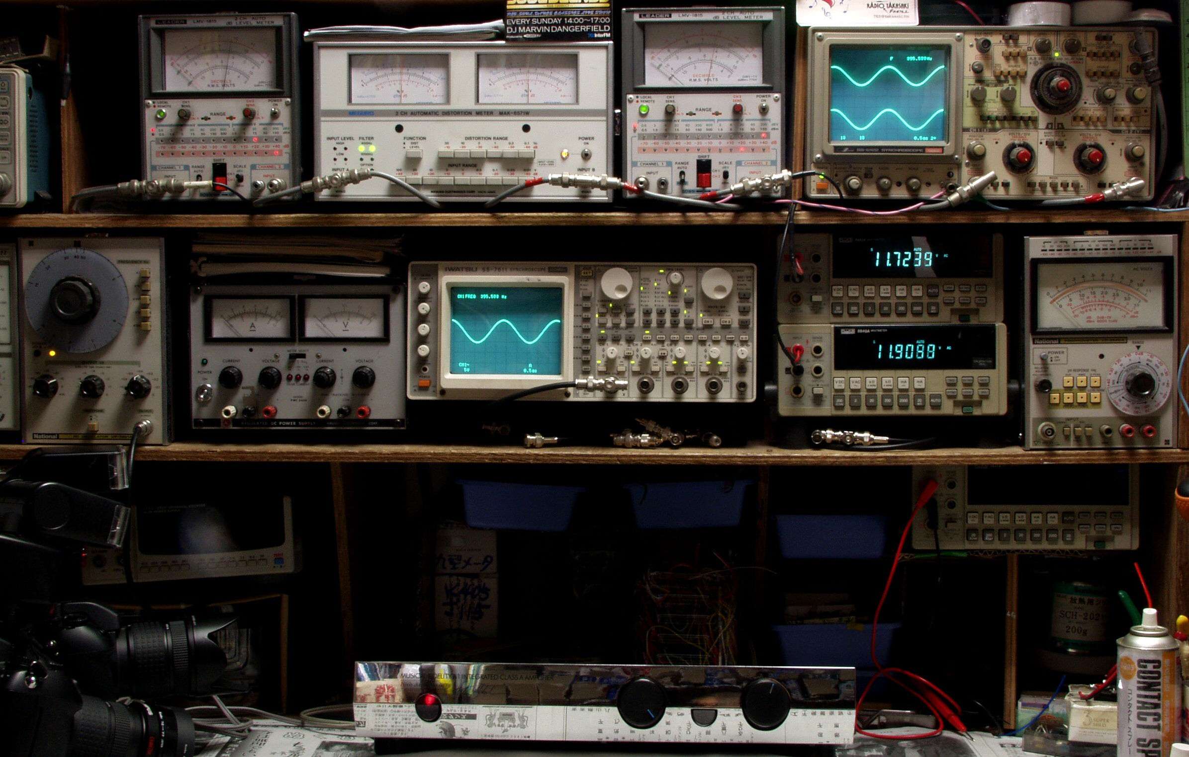 上段中左 歪み率計=出力の歪み率測定 左メータ=L出力、右メータ=R出力.