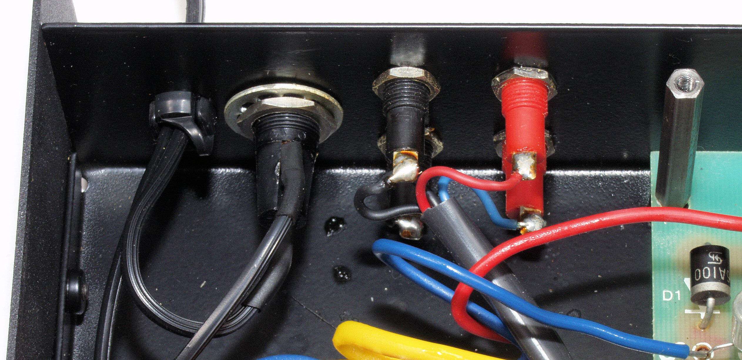 C136. 修理後 SP接続端子裏、インレットソケット裏、太いケーブルを使用出来るよう、接着材を使用する。