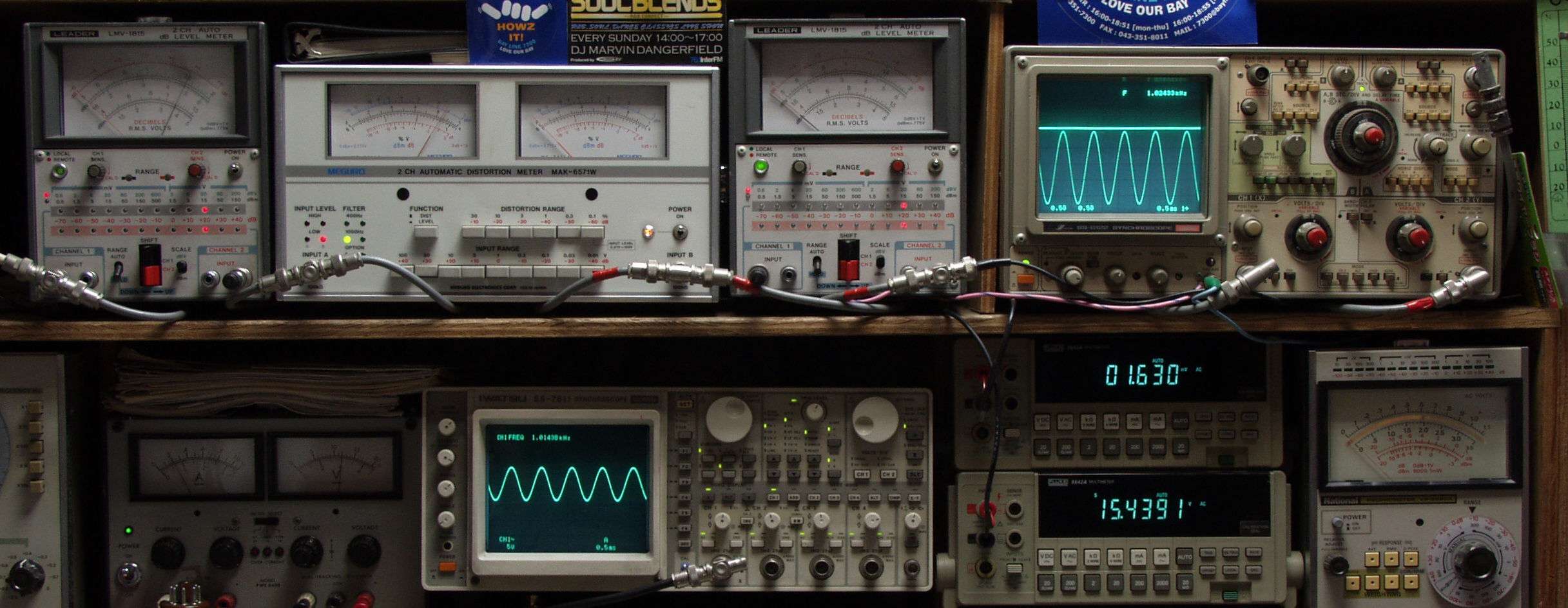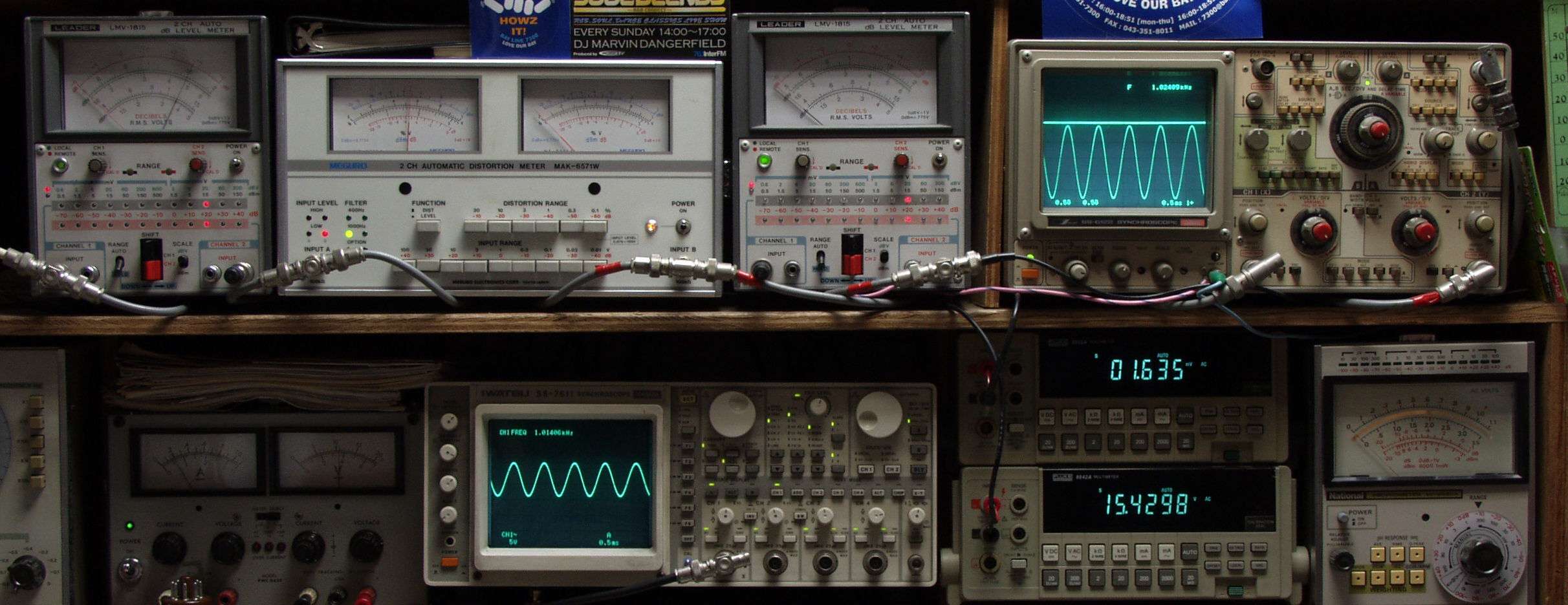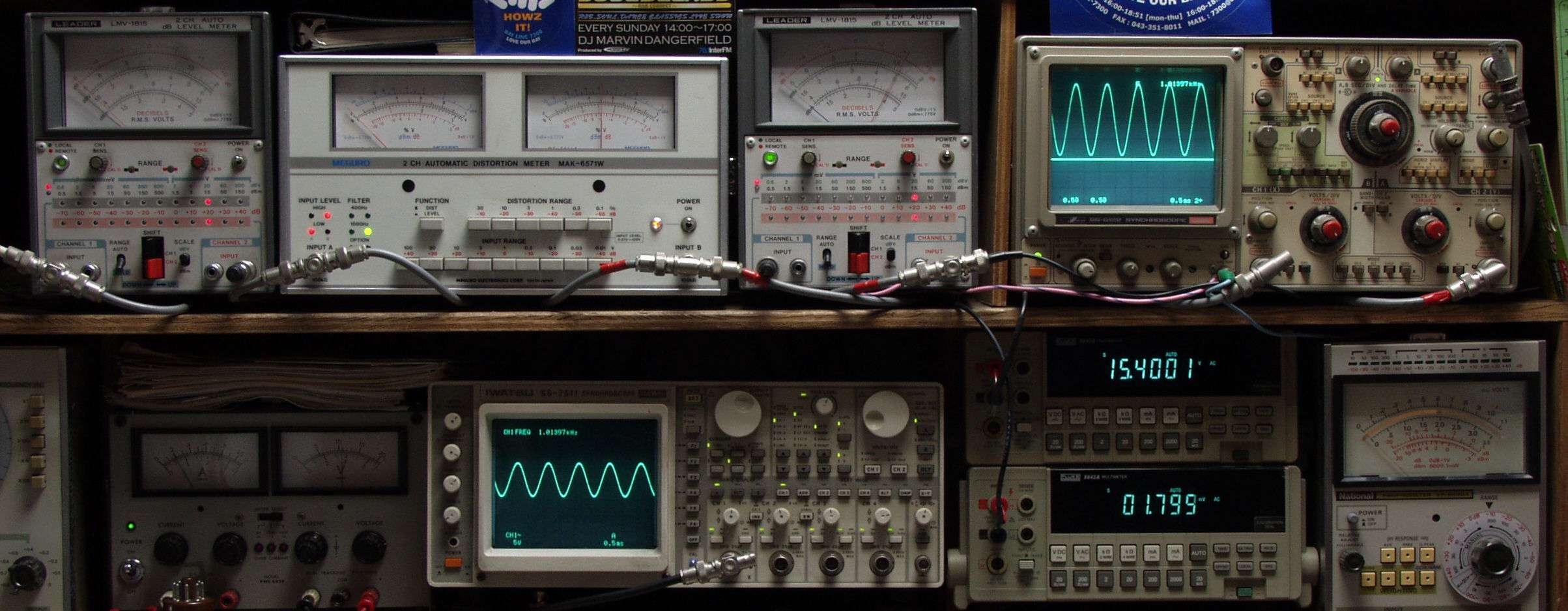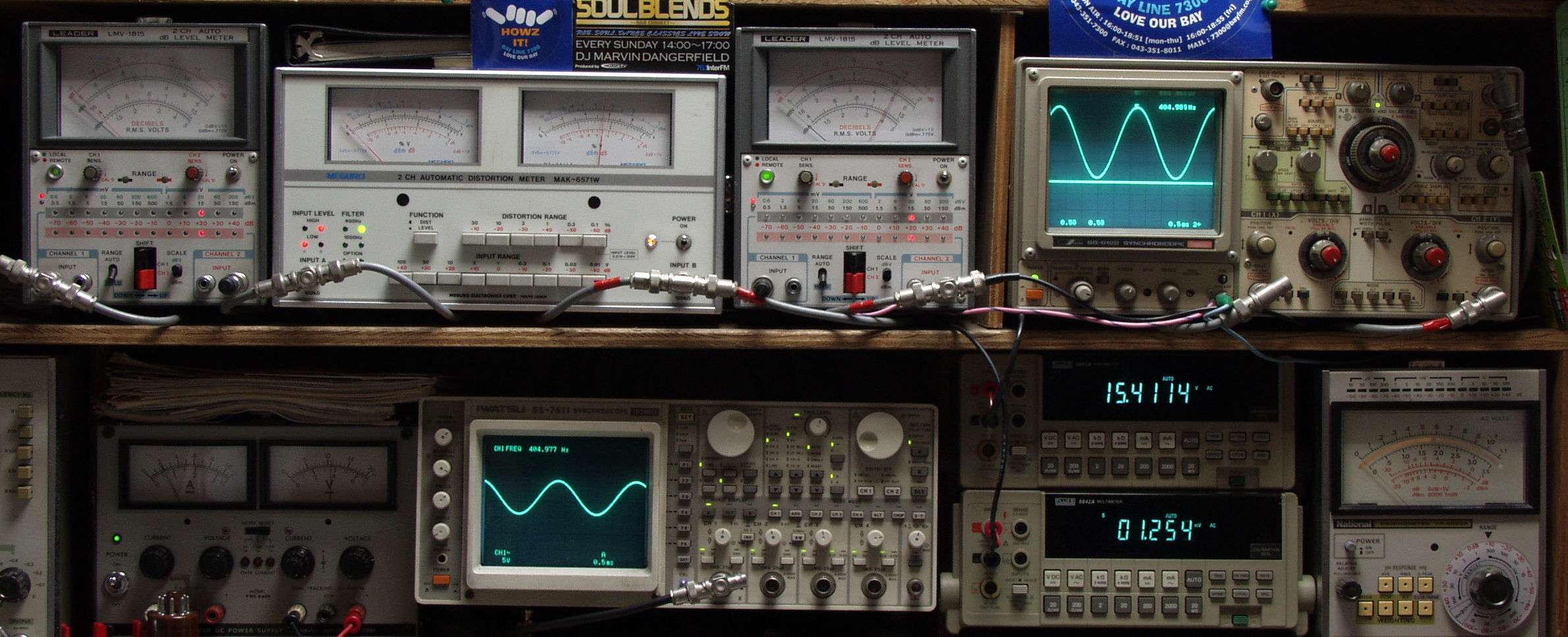 上段中左 歪み率計=出力の歪み率測定 左メータ=L出力、右メータ=R出力.