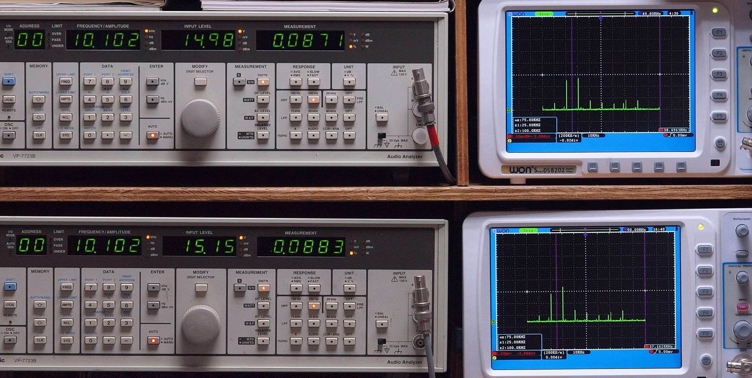 | E. 測定・調整 E1. 出力・歪み率測定・調整 「見方」。 上段中 右側SP出力を「Audio Analyzer Panasonic VP−7723B」により測定。 表示LED、 左端=メモリーNo、 中左=周波数測定、 中右=出力電圧測定、 右端=歪み率測定。 上段右端 VP−7723Bの基本波除去出力を「owon SDS8202(200MHZ)」で「FFT分析」表示。 下段中 左側SP出力を「Audio Analyzer Panasonic VP−7723B」により測定。 表示LED、 左端=メモリーNo、 中左=周波数測定、 中右=出力電圧測定、 右端=歪み率測定。 下段右端 VP−7723Bの基本波除去出力を「owon SDS6062(200MHZ)」で「FFT分析」表示。 下段左端 オーディオ発振器 VP−7201A より50Hz〜100kHzの信号を出し(歪み率=約0.003%)、ATT+分配器を通し、AMPに入力。 よって、ダイアル設定出力レベルより低くなります。測定機器の仕様や整備の様子はこちら、「VP−7723B」「VP−7201A」。 FFT画面の見方はこちら。 |