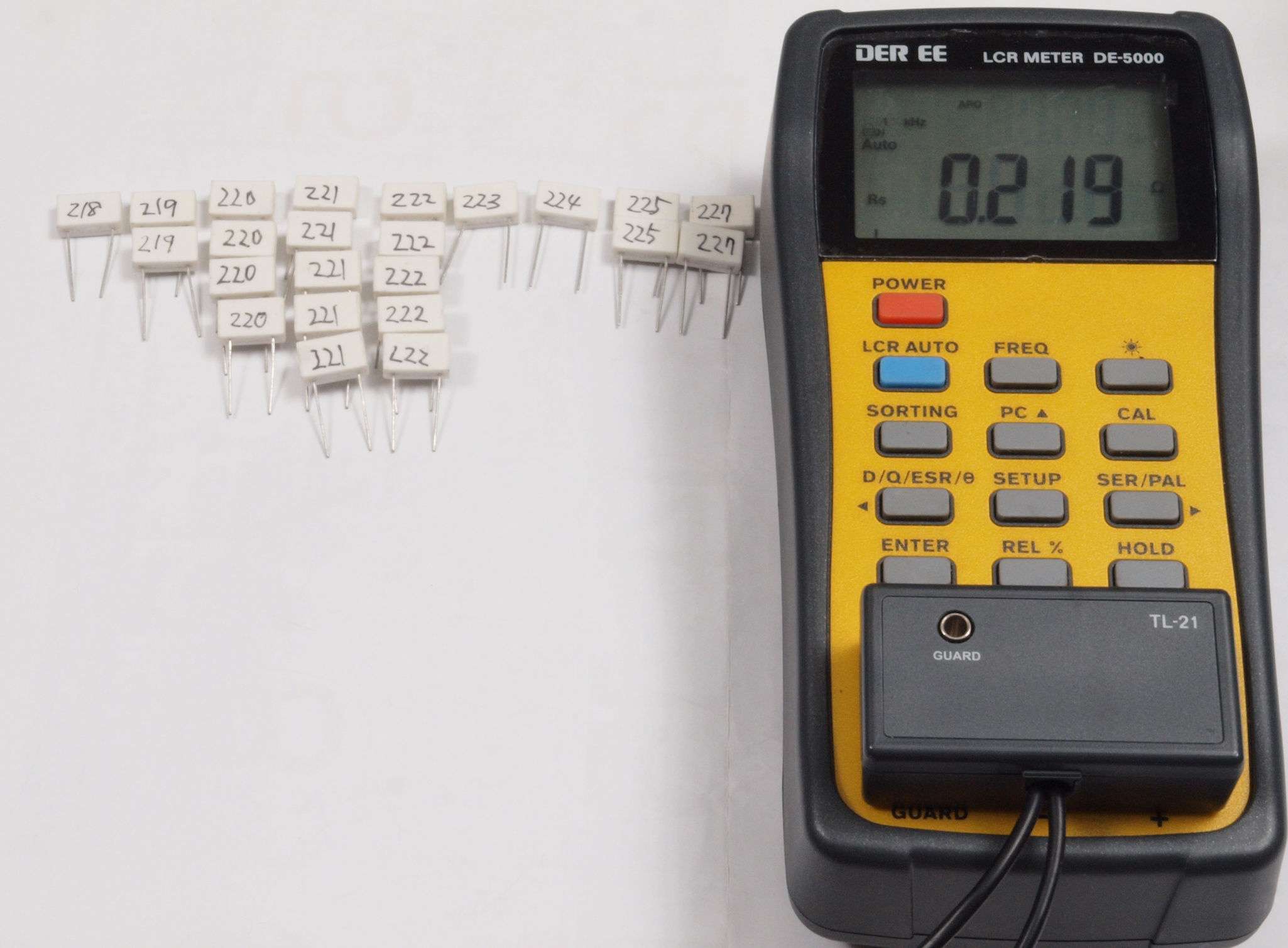 | A92. 点検中 終段TR(トランジスター)のエミッター抵抗(低歪タイプ)は測定中して選別使用。福島双羽電機(株)製。 222を4本選択する。 |