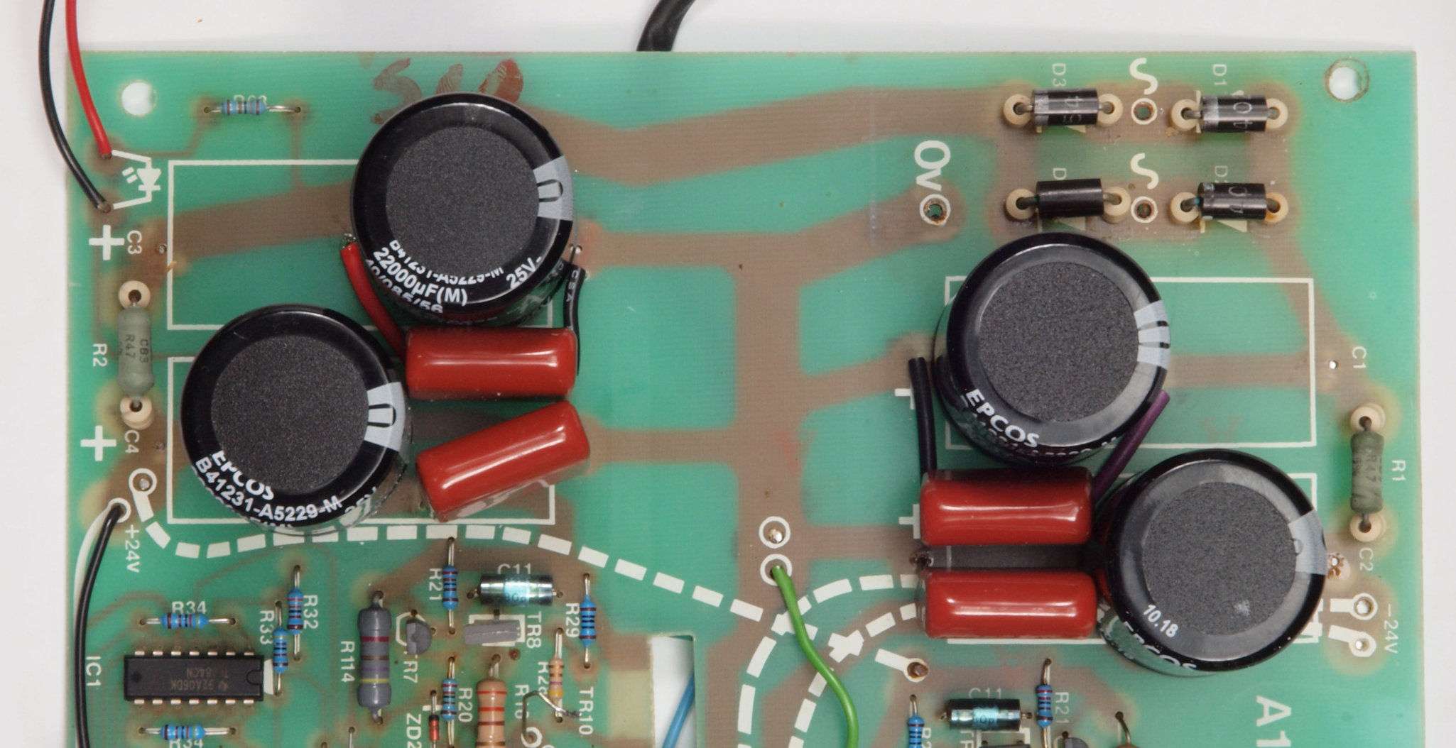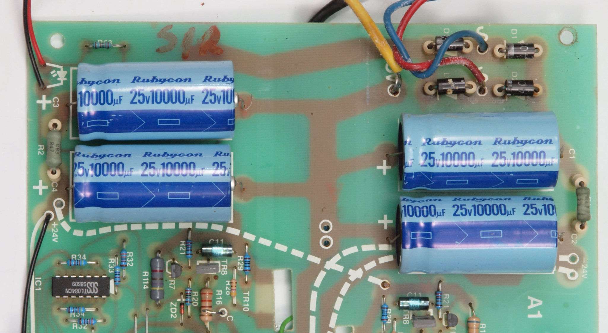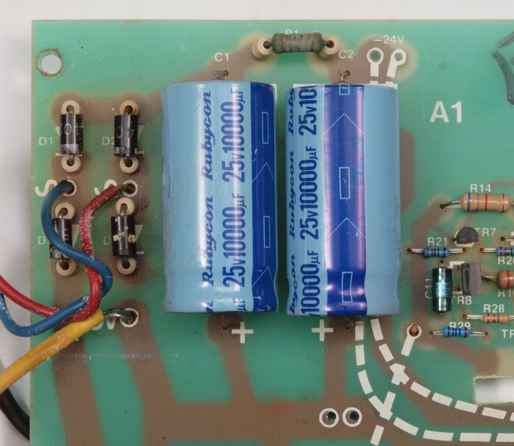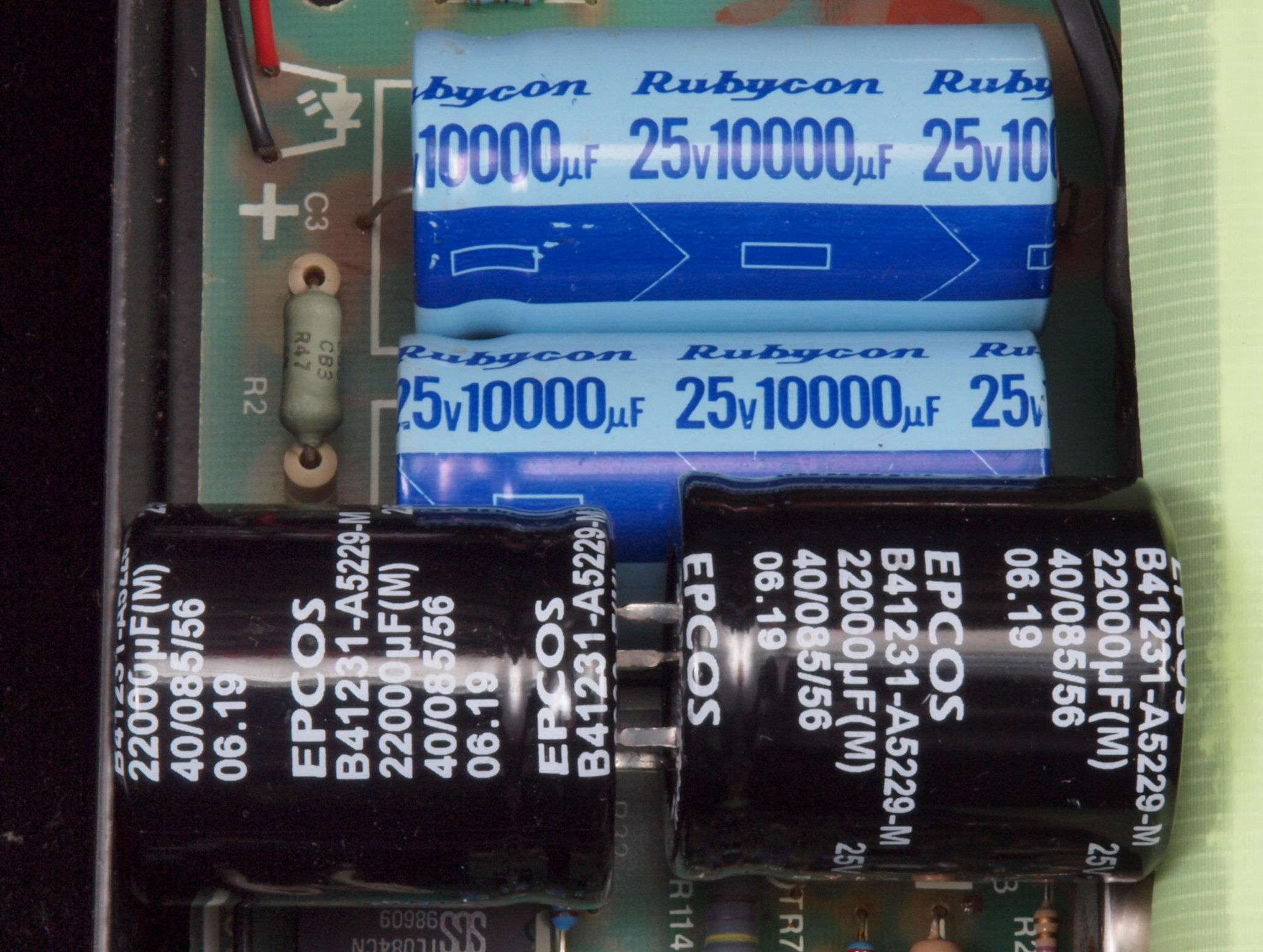 | AA1. 点検中 電源ブロック電解トランジスター比較。 下=交換するTDK 22000μ/25WV、上=付いているRubycon 10000μ/25WV。 |