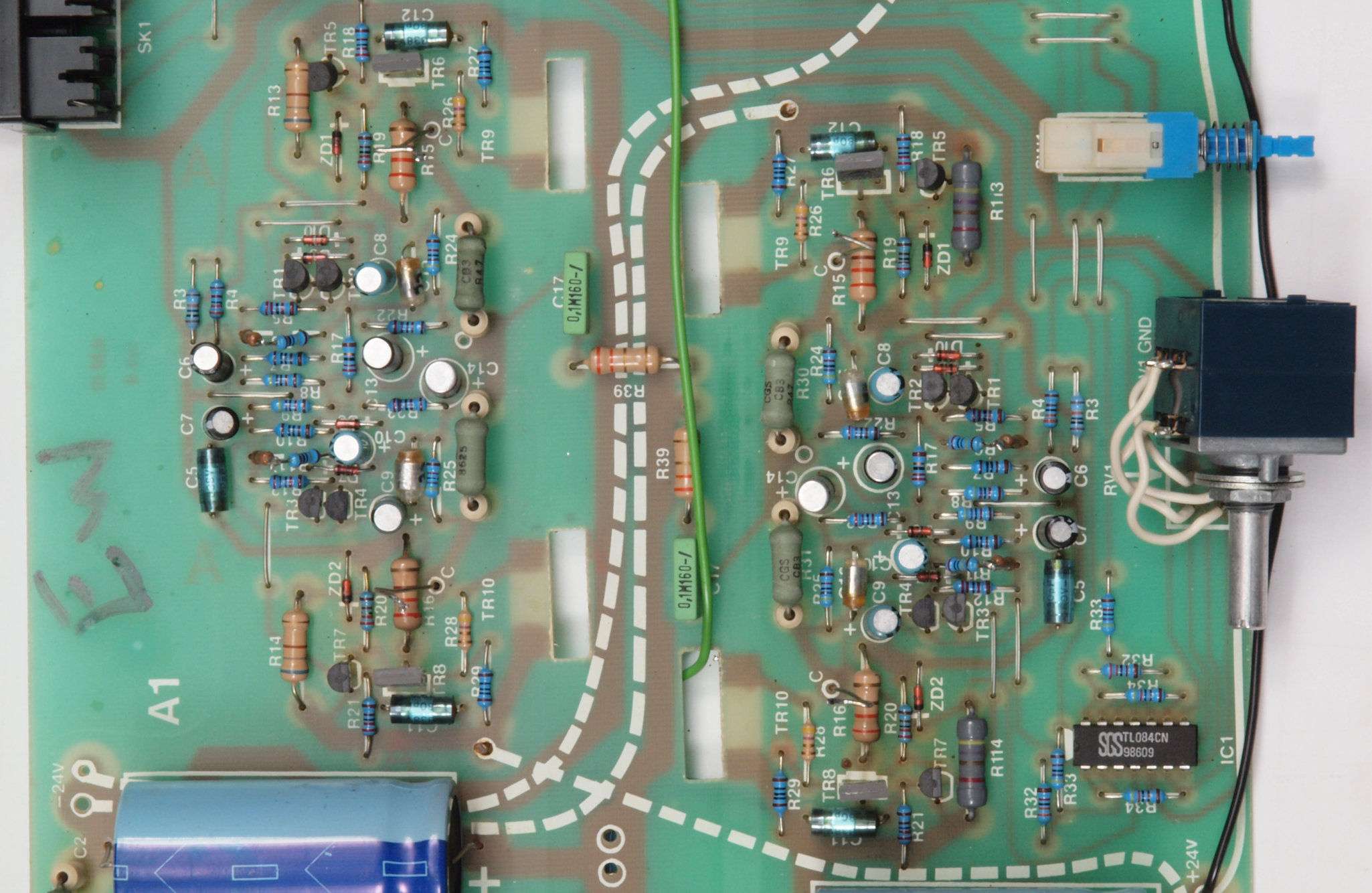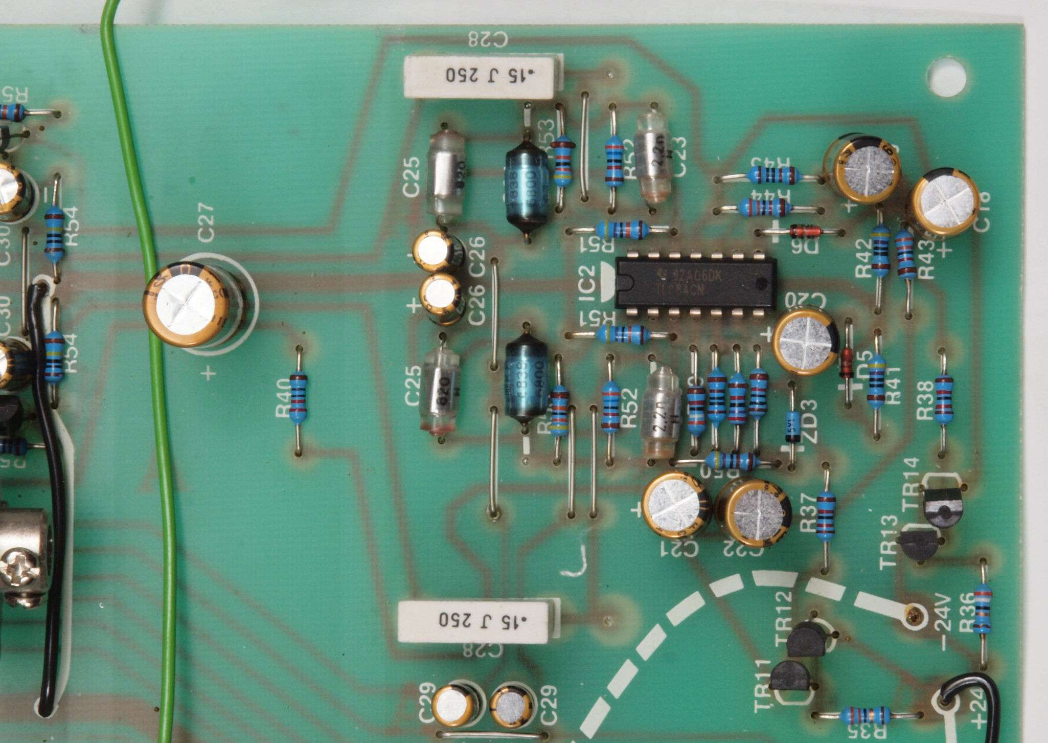 | C12. 修理後 基板 電解コンデンサー31個、OP−AMP2個交換。フイルムコンデンサー9個追加。エミッター抵抗(低歪タイプ)4本交換福島双羽電機(株)製。 | ||||||||||||||||||||