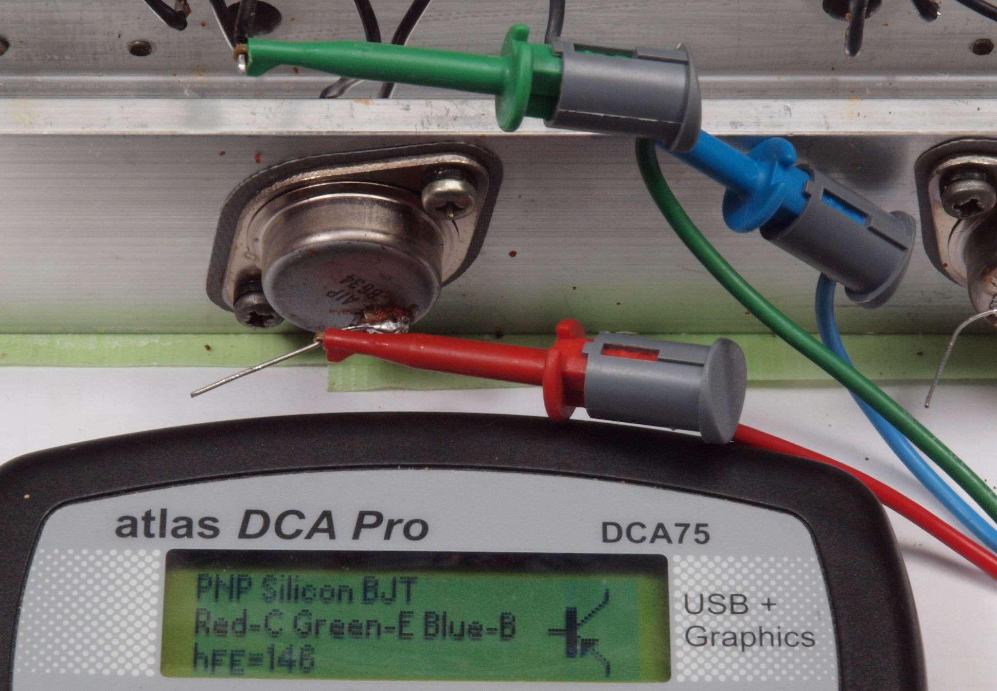 | T5. 修理中 「L側終段2SC−TR(トランジスター)測定、hfe=70」と交換するTR(トランジスター)測定hfe=156。 | ||||||||||||||||||||
