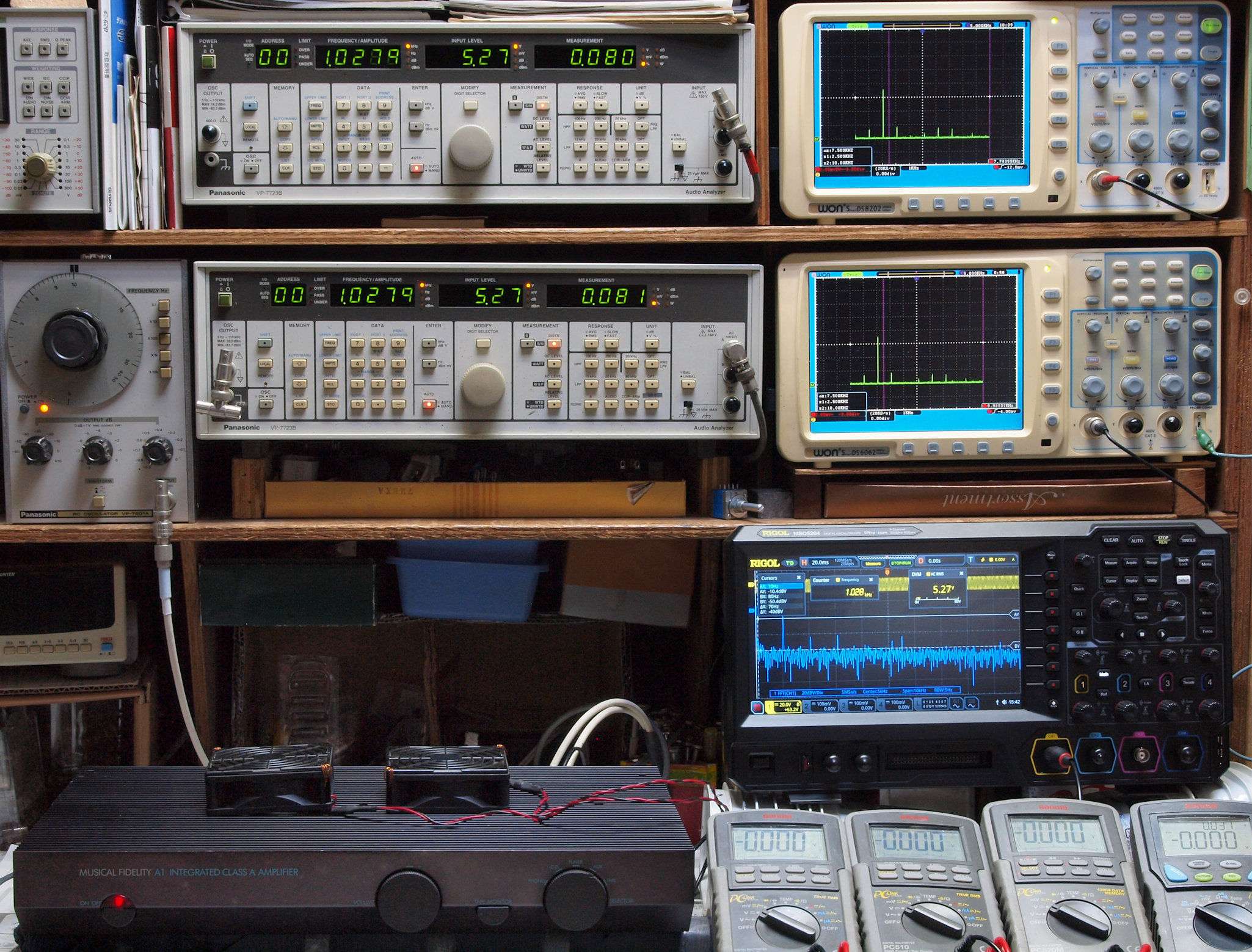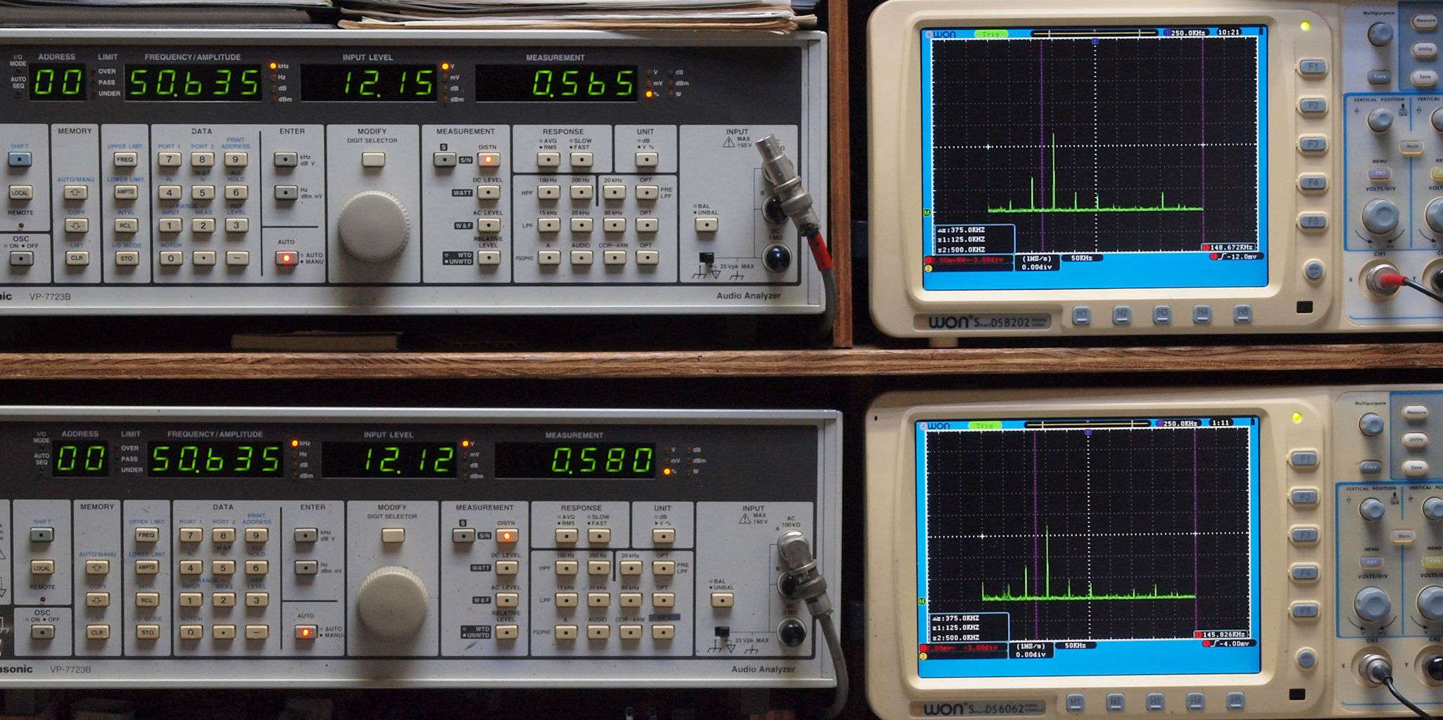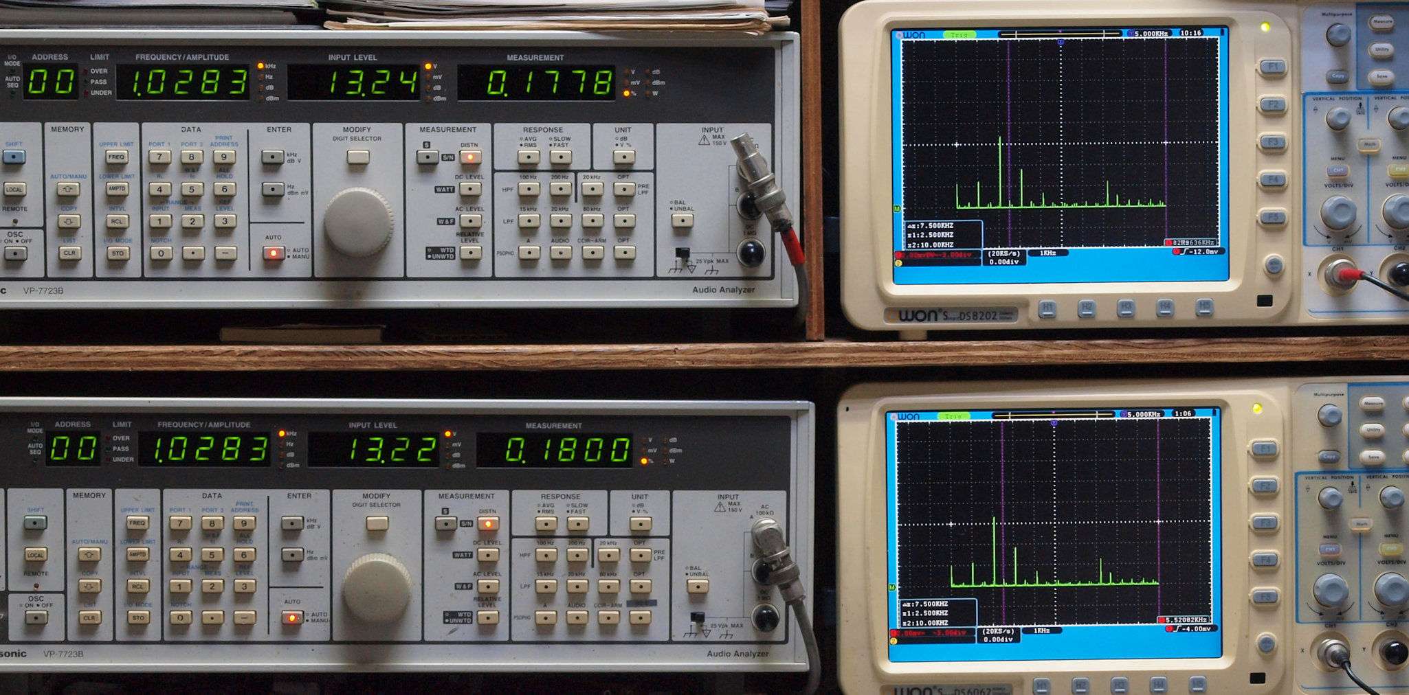 | E. 測定・調整。 画像をクリックすると、大きく(横幅2050ドット)表示されます。 E0. 出力・歪み率測定・調整 「見方」。 上段中 右側SP出力を「Audio Analyzer Panasonic VP−7723B」により測定。 表示LED、 左端=メモリーNo、 中左=周波数測定、 中右=出力電圧測定、 右端=歪み率測定。 上段右端 VP−7723Bの基本波除去出力を「owon SDS8202(200MHZ)」で「FFT分析」表示。 下段中 左側SP出力を「Audio Analyzer Panasonic VP−7723B」により測定。 表示LED、 左端=メモリーNo、 中左=周波数測定、 中右=出力電圧測定、 右端=歪み率測定。 下段右端 VP−7723Bの基本波除去出力を「owon SDS6062(200MHZ)」で「FFT分析」表示。 下段左端 オーディオ発振器 VP−7201A より50Hz〜100kHzの信号を出し(歪み率=約0.003%)、ATT+分配器を通し、AMPに入力。 よって、ダイアル設定出力レベルより低くなります。測定機器の仕様や整備の様子はこちら、「VP−7723B」「VP−7201A」。 FFT画面の見方はこちら。 |