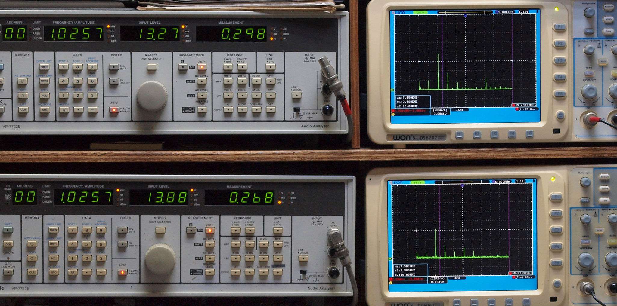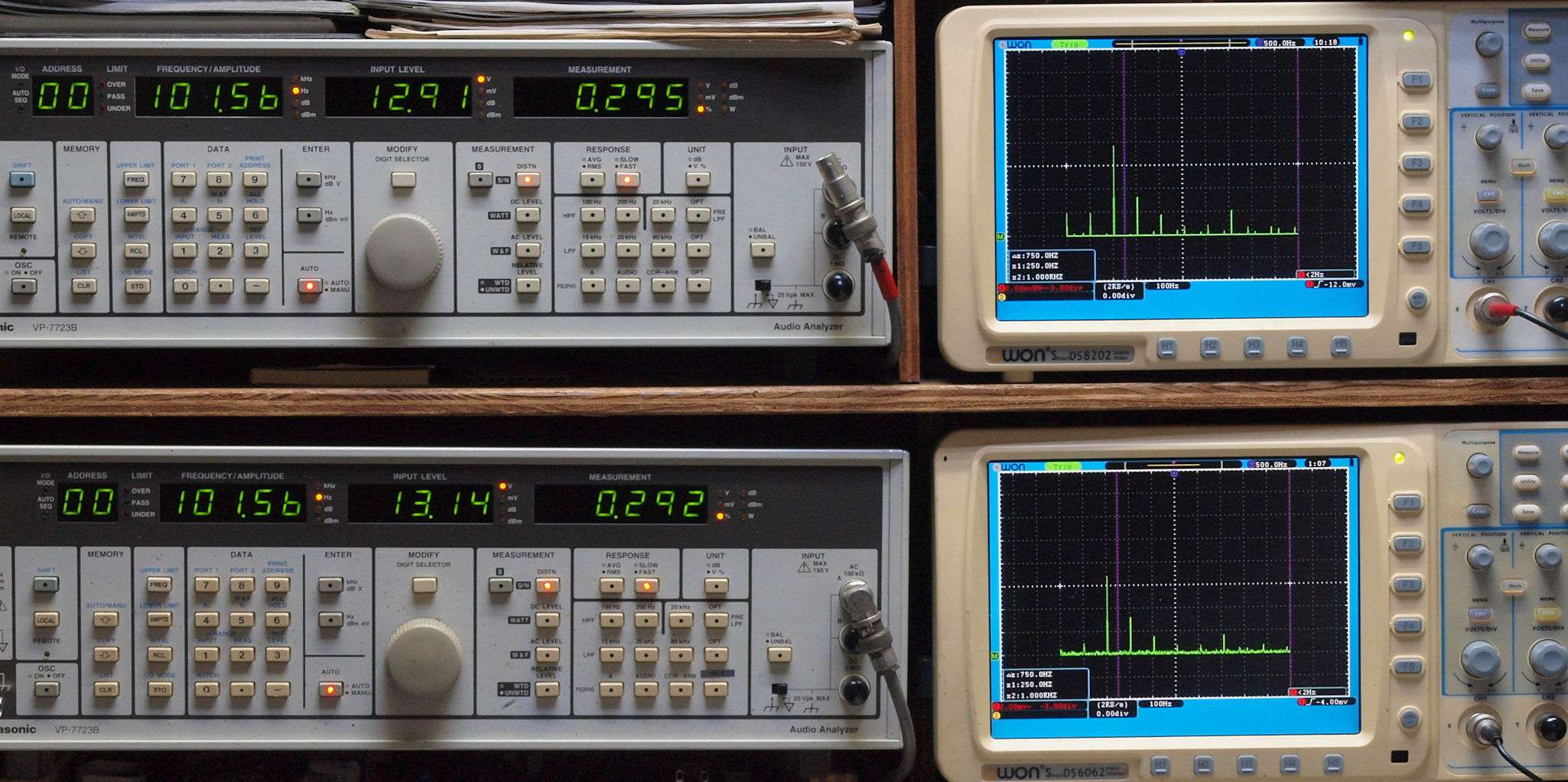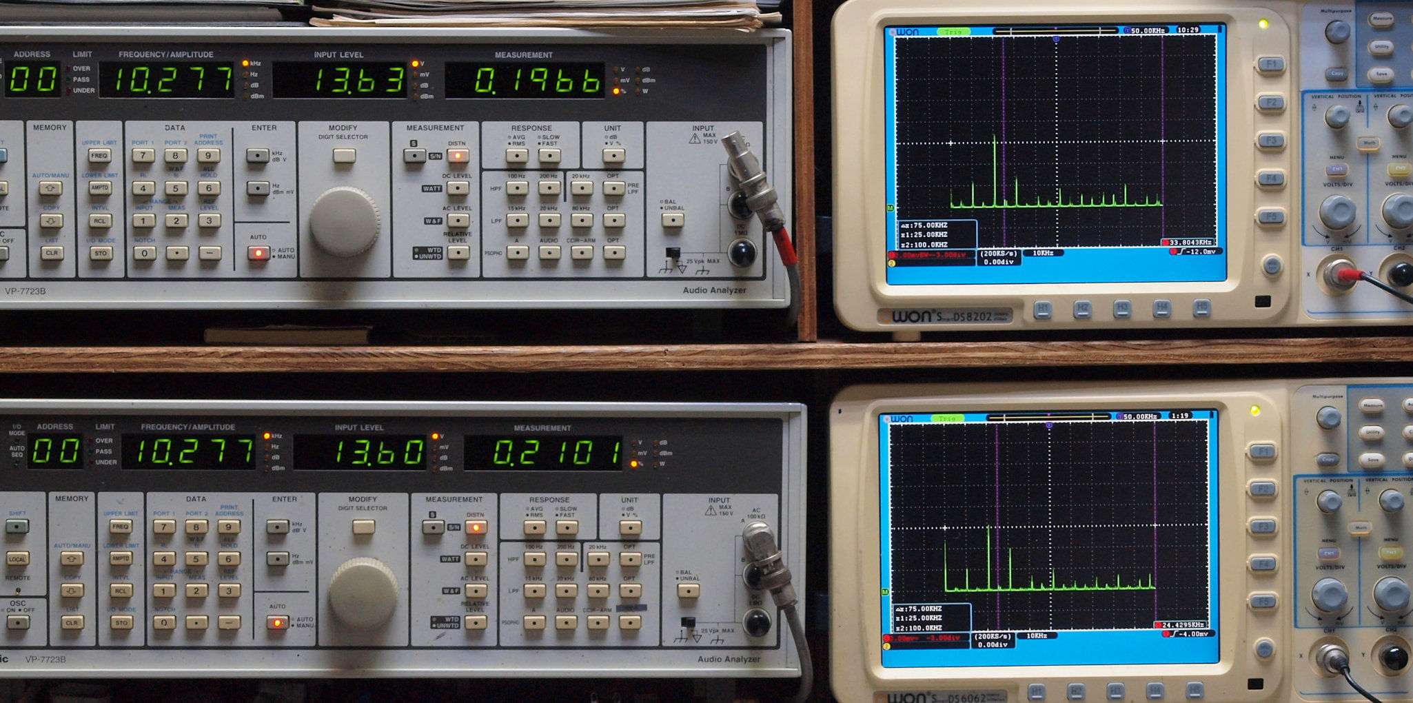 | E. 測定・調整。 画像をクリックすると、大きく(横幅2050ドット)表示されます。 E0. 出力・歪み率測定・調整 「見方」。 上段中 右側SP出力を「Audio Analyzer Panasonic VP−7723B」により測定。 表示LED、 左端=メモリーNo、 中左=周波数測定、 中右=出力電圧測定、 右端=歪み率測定。 上段右端 VP−7723Bの基本波除去出力を「owon SDS8202(200MHZ)」で「FFT分析」表示。 下段中 左側SP出力を「Audio Analyzer Panasonic VP−7723B」により測定。 表示LED、 左端=メモリーNo、 中左=周波数測定、 中右=出力電圧測定、 右端=歪み率測定。 下段右端 VP−7723Bの基本波除去出力を「owon SDS6062(200MHZ)」で「FFT分析」表示。 下段左端 オーディオ発振器 VP−7201A より50Hz〜100kHzの信号を出し(歪み率=約0.003%)、ATT+分配器を通し、AMPに入力。 よって、ダイアル設定出力レベルより低くなります。測定機器の仕様や整備の様子はこちら、「VP−7723B」「VP−7201A」。 FFT画面の見方はこちら。 |