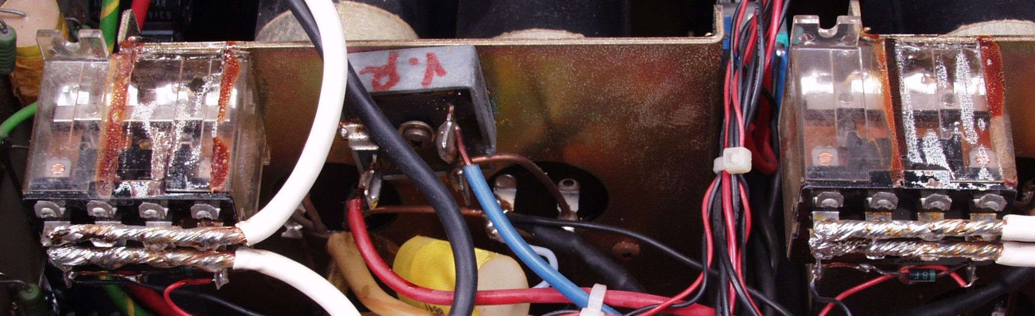 | A8.点検中 突入電流抑制回路、交換されているリレーの接点容量は5A×2(但し、パラ接点なので=10Aとはならない) このAMPの消費電力は650Wなのだから、もう少し余裕が欲しい、出来れば20A以上 |