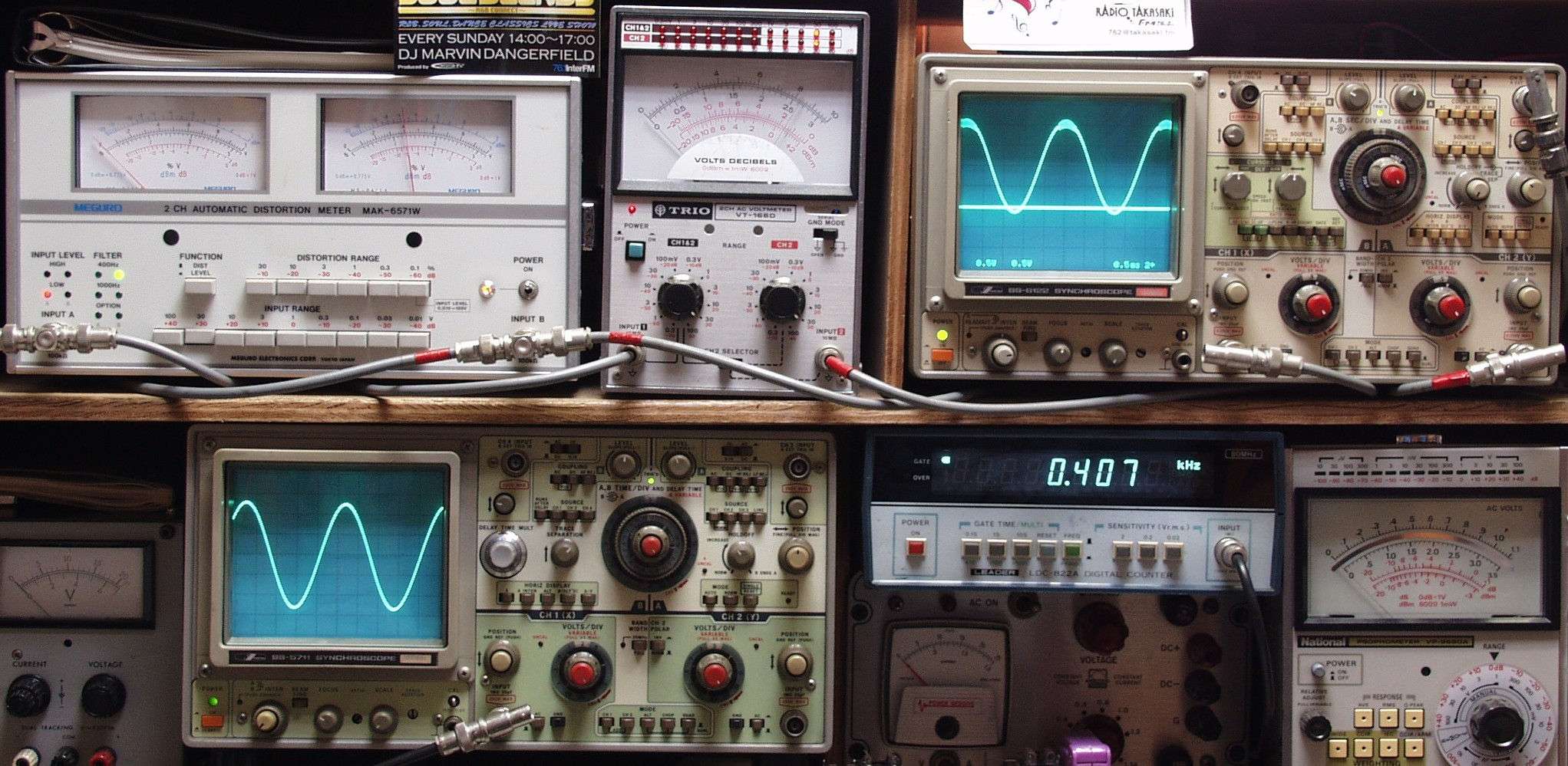 | E. 測定 E1. R−SP出力 27V=91W 14%歪み率 400HZ 寄生発振をしている。 定格は150W歪み率1%以下 <見方> 下左オーディオ発振器より400HZ・1KHZの信号を出す(歪み率=約0.003%) 下中=入力波形(オーディオ発振器のTTLレベル) 下右=周波数計 上左=SP出力の歪み率測定 左メータ=L出力、右メータ=R出力 上中=SP出力電圧測定器、赤針=R出力、黒針=L出力 上右=SP出力波形オシロ 上=R出力、下=L出力(出力電圧測定器の出力) |