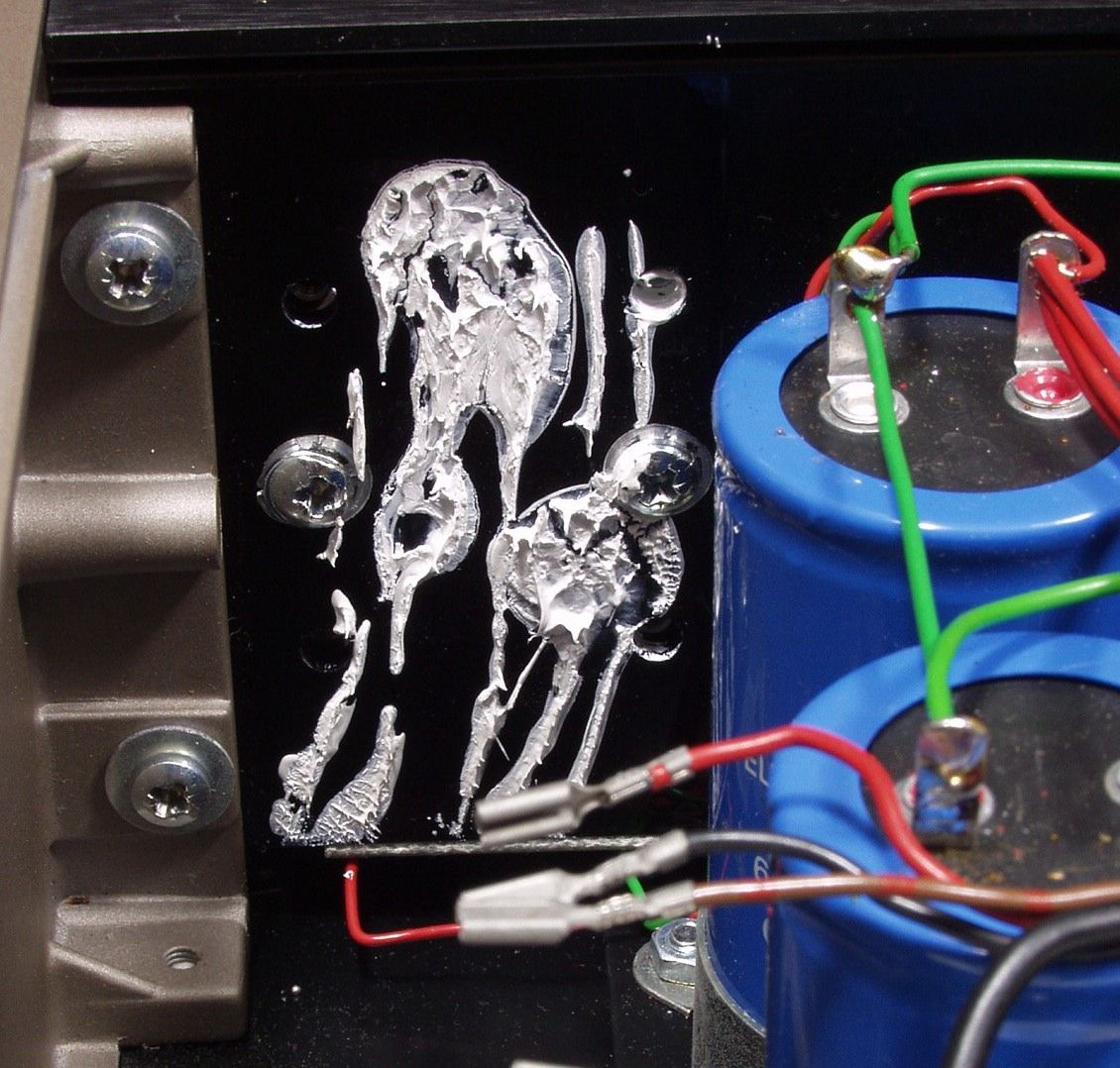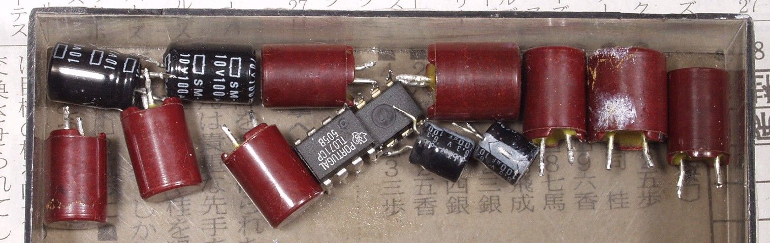C1A1. 修理前 R側AMP基板のヒビの入った電解コンデンサー
