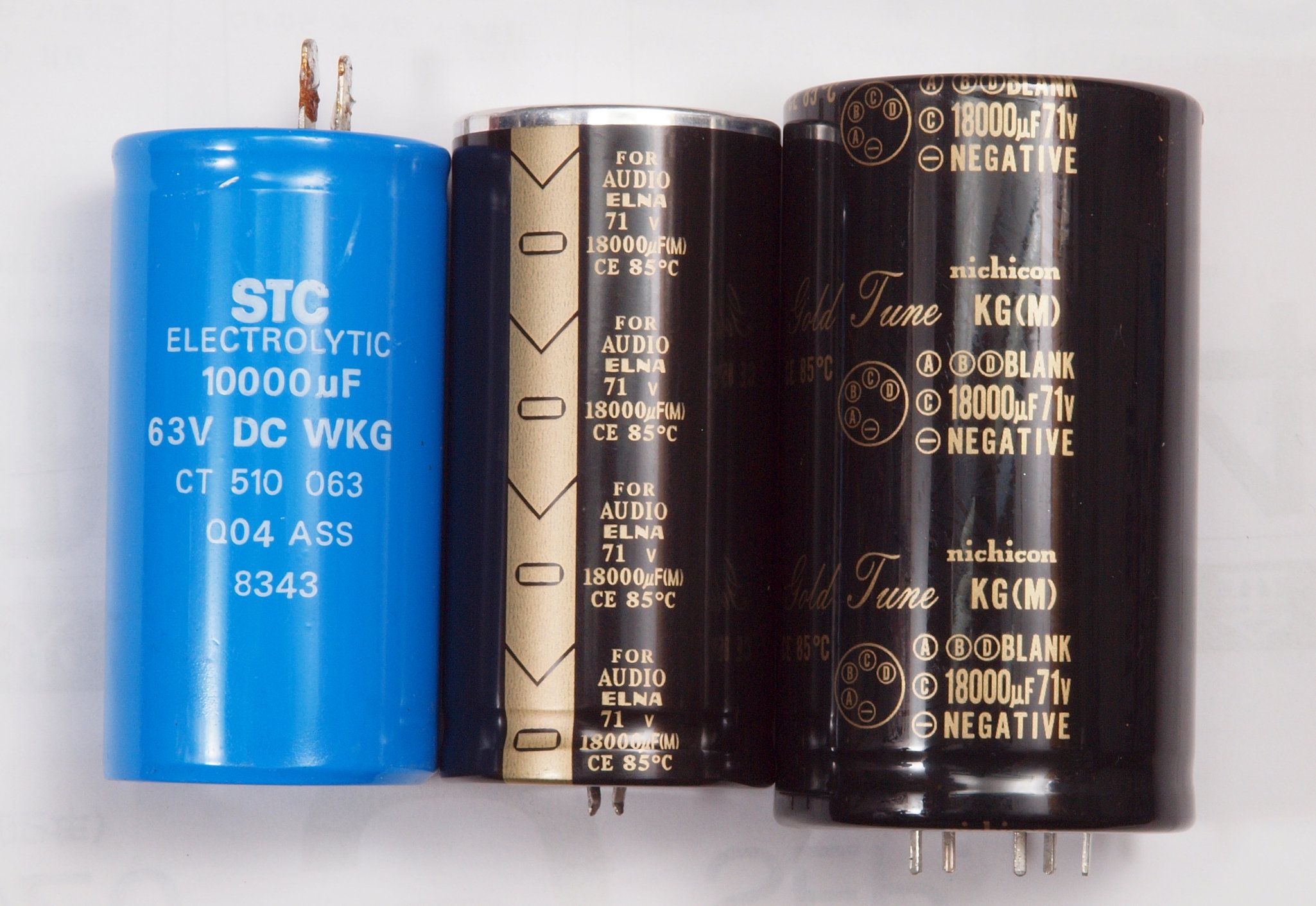中=エルナ製71V/18000μF、右=ニチコン製71V/18000μFを使用。