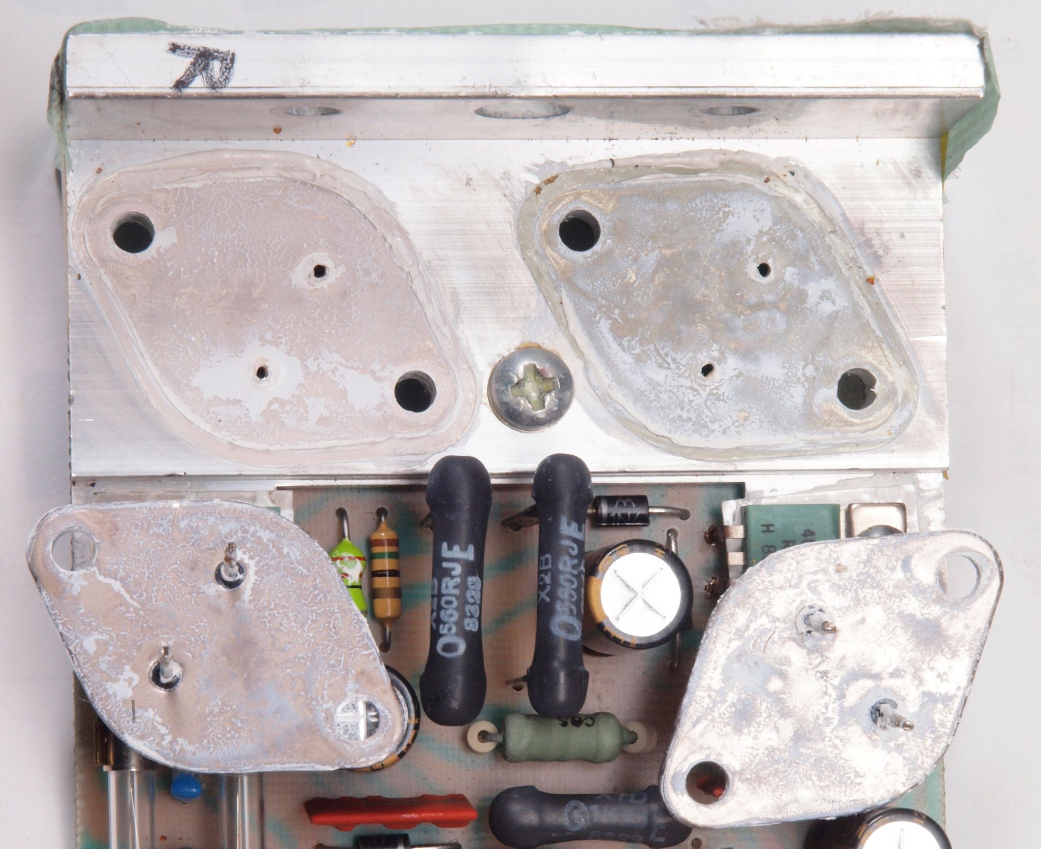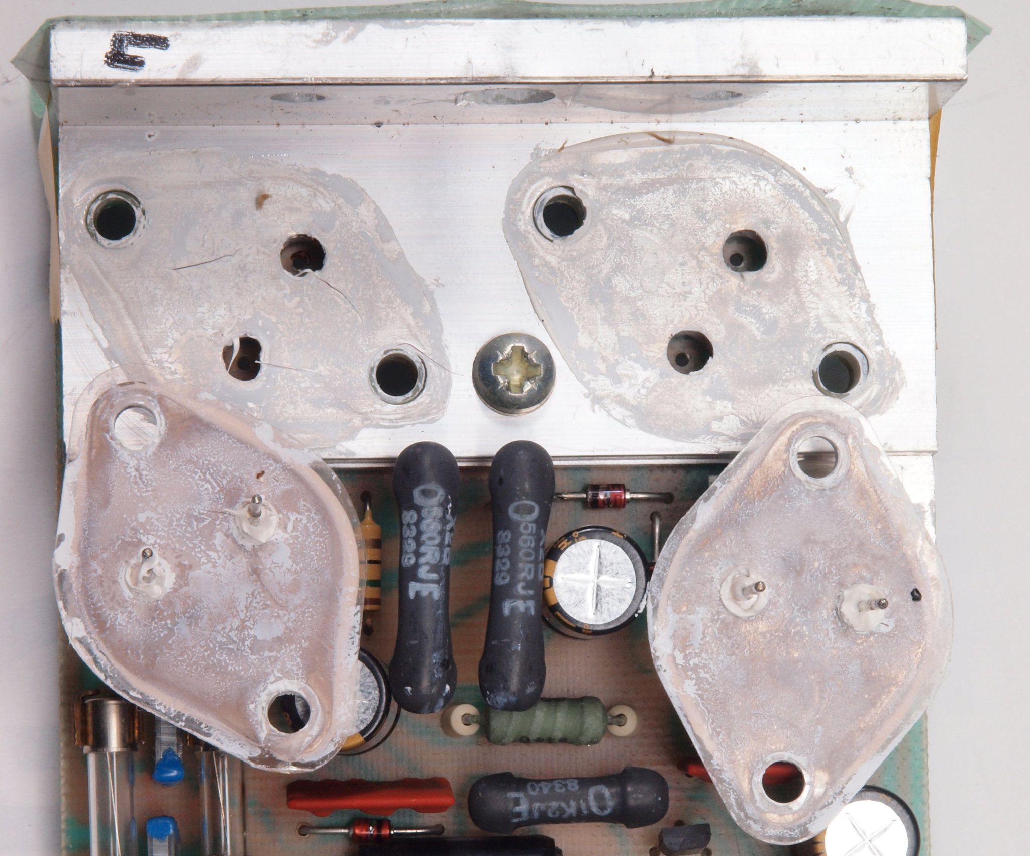 C222. 修理中 R側 終段トランジスター。 熱でシリコングリスが堅い、テフロンシートに交換する。