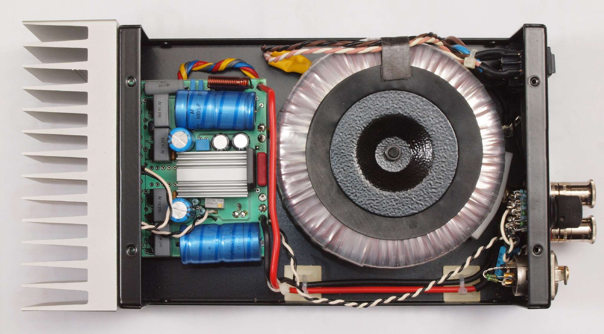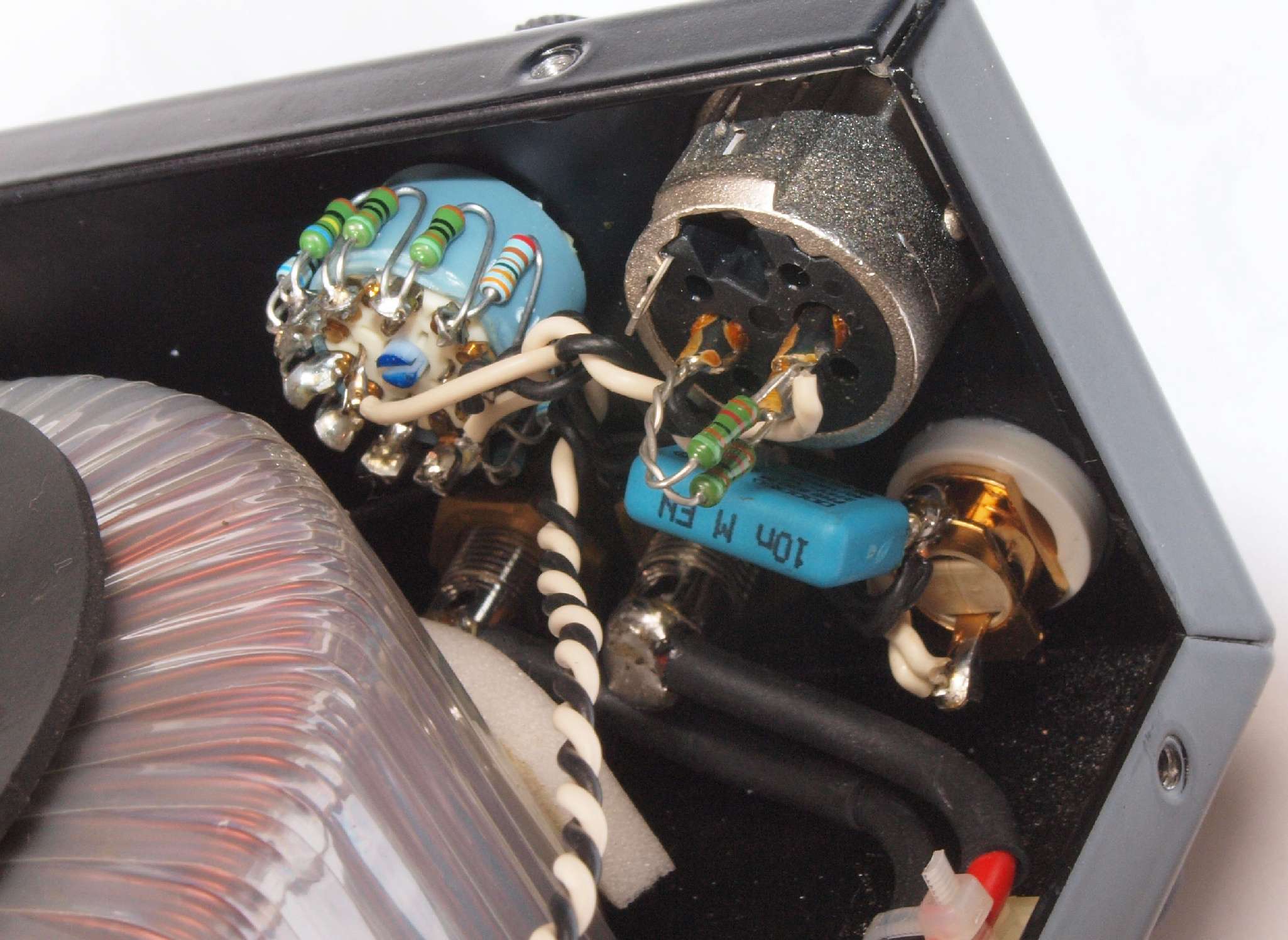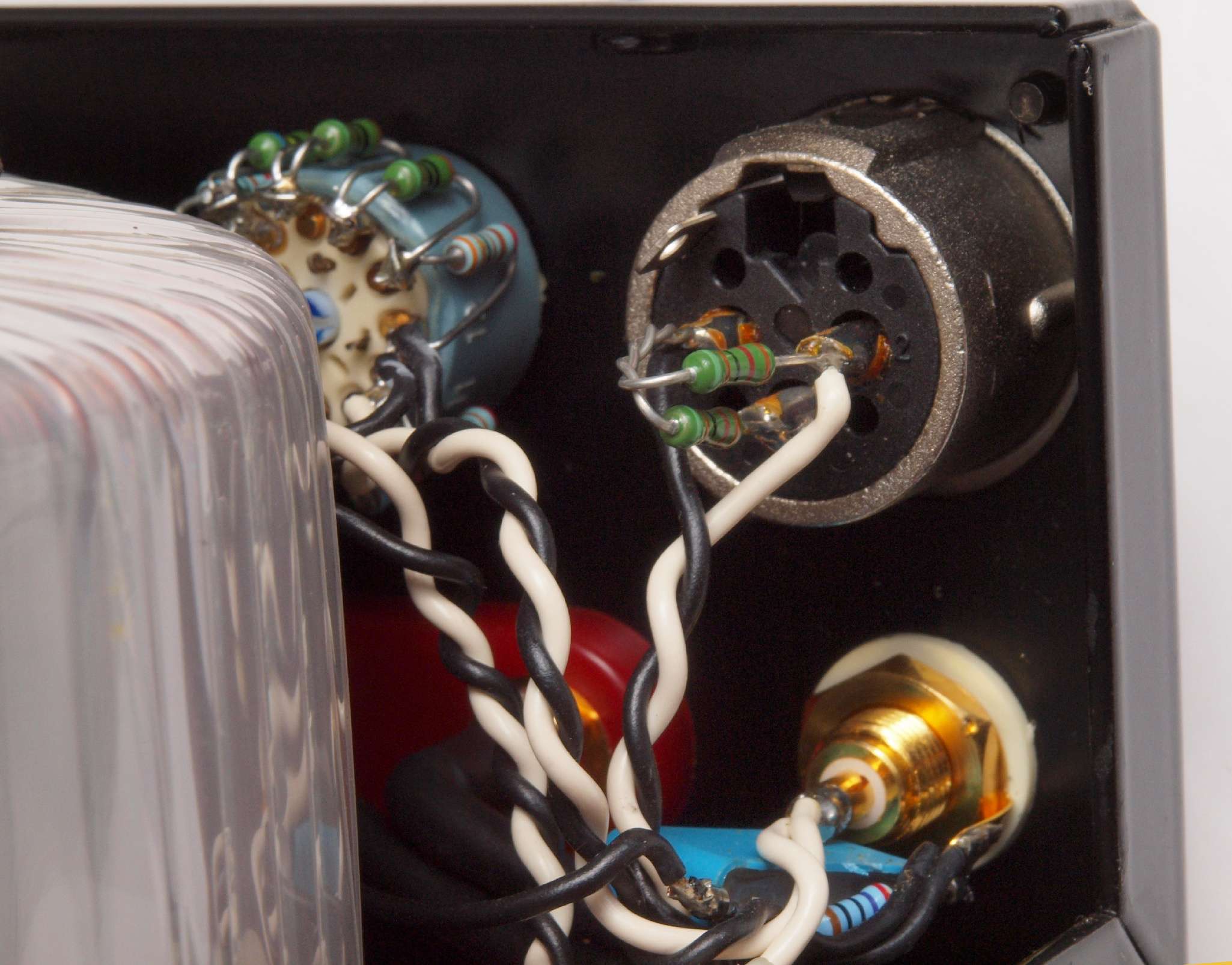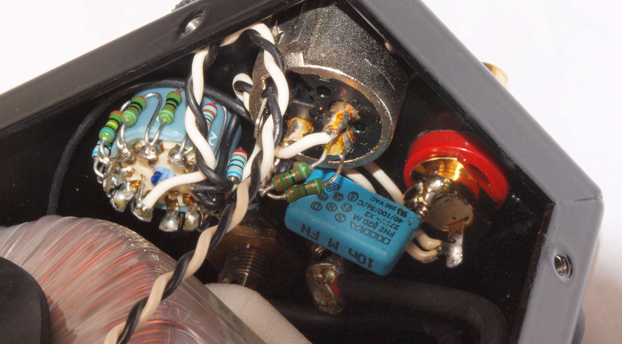 A19. 点検中 上蓋を取り、上から見る。 XLRバランス入力端子裏配線、3番コールドは未接続
