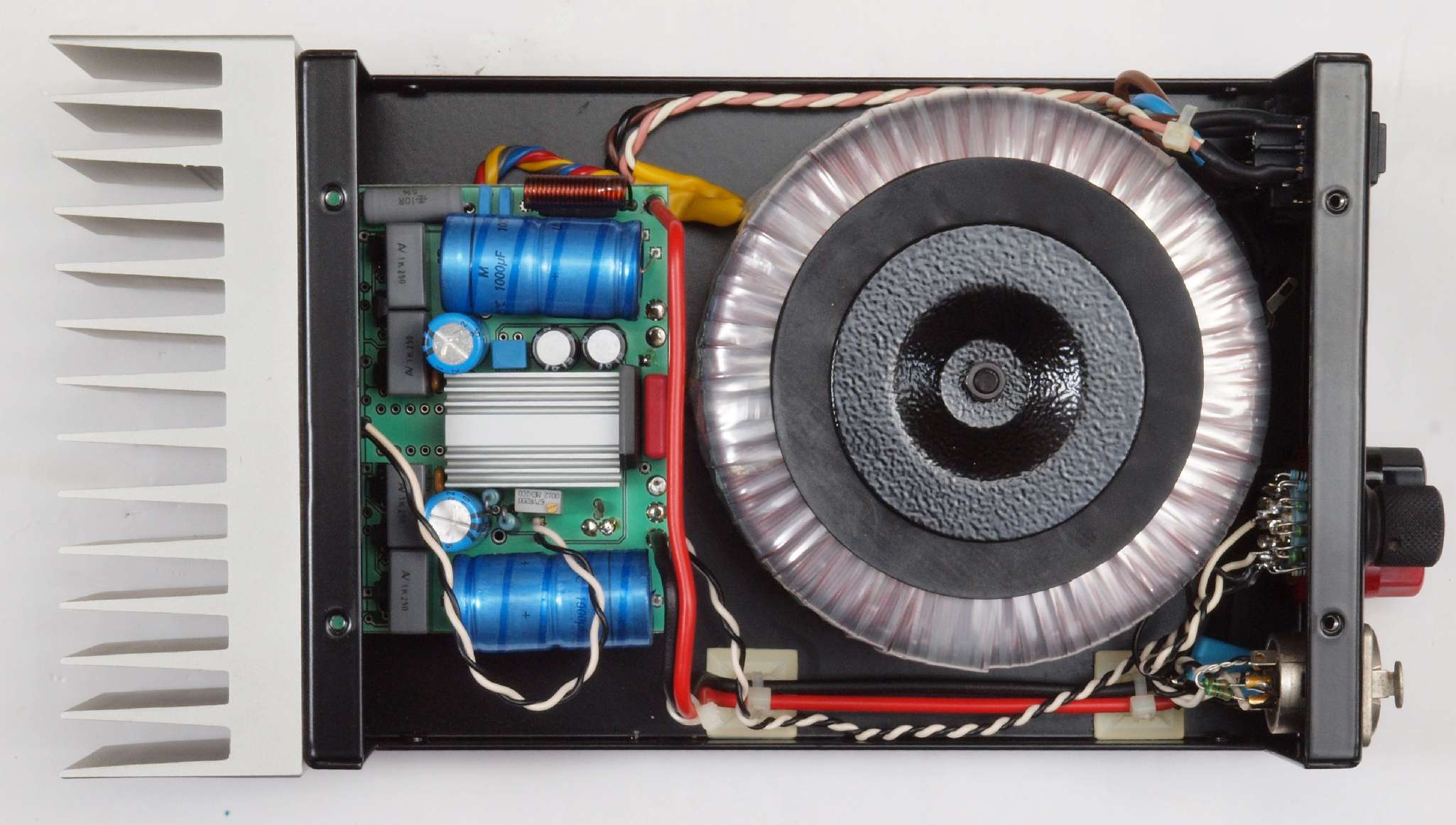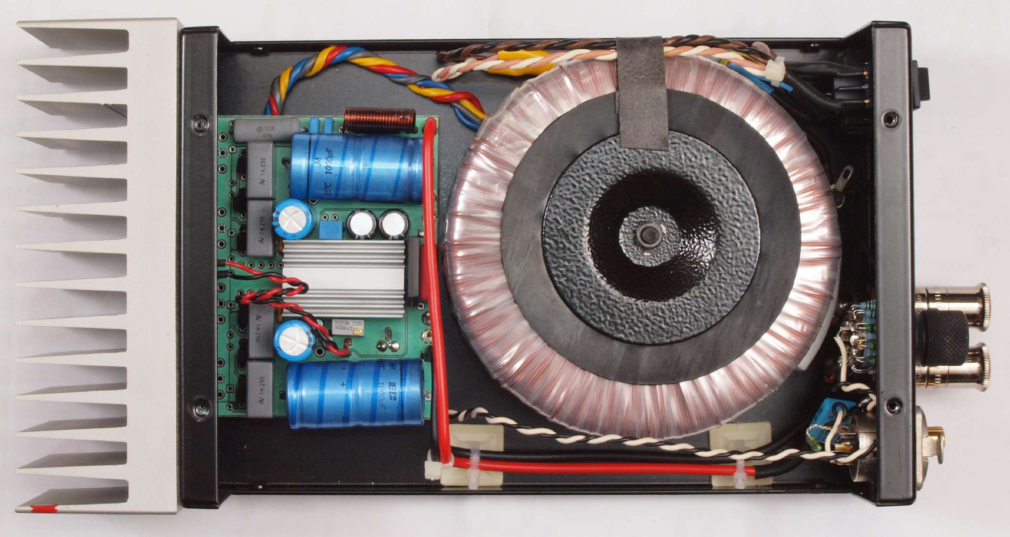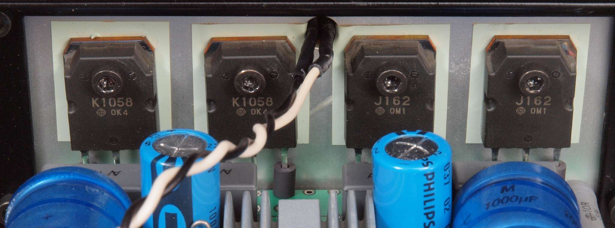 A17. 点検中 上蓋を取り、上から見る。 終段FET(電解トランジスター)は日立2SK1058/2SJ162。