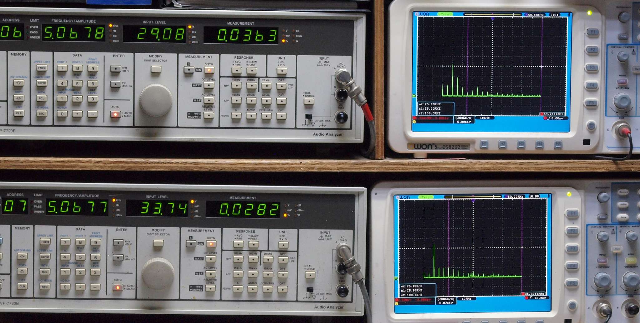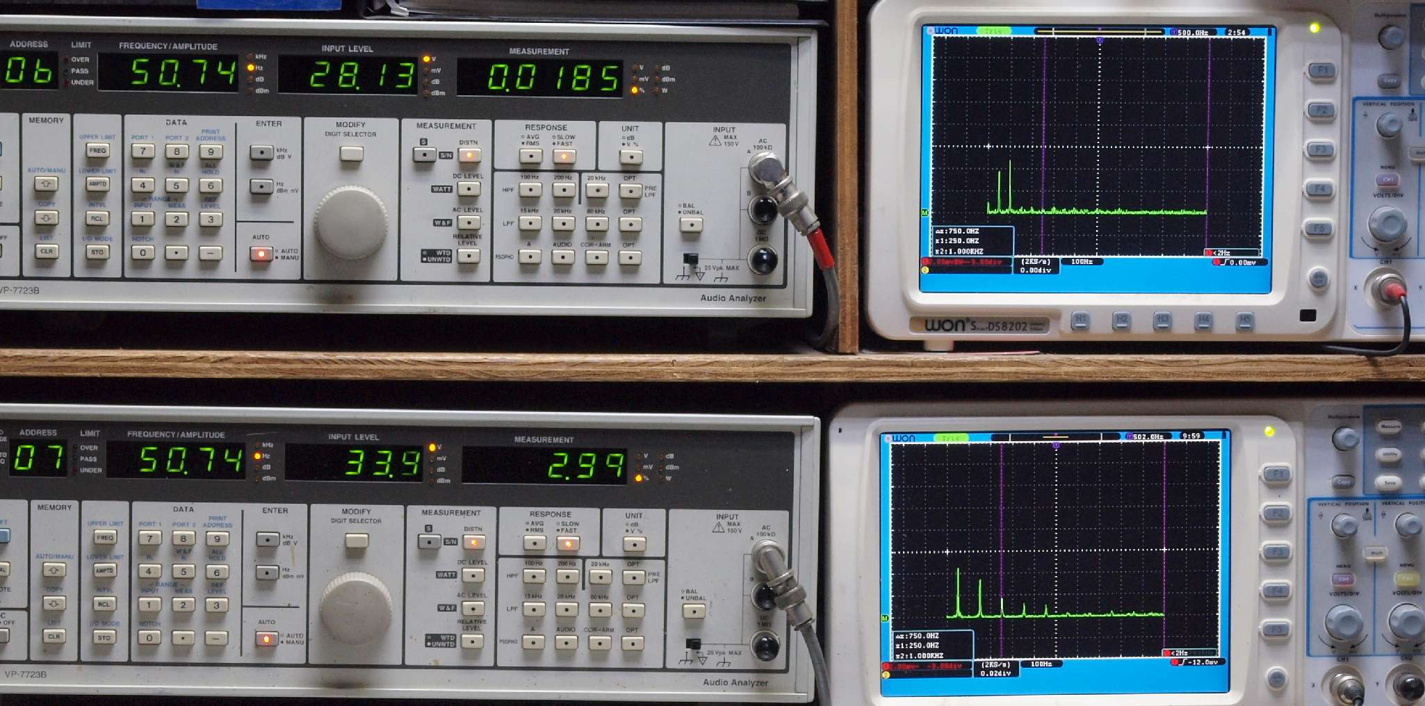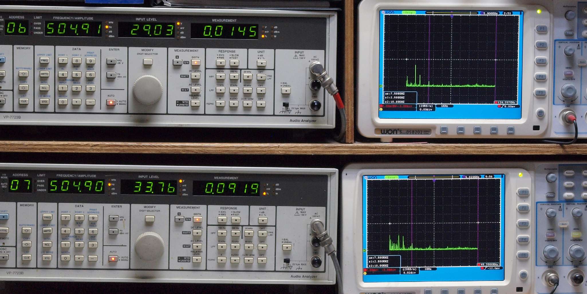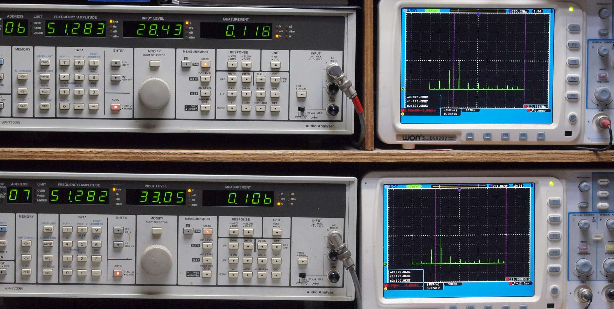 よって、ダイアル設定出力レベルより低くなります。測定機器の仕様や整備の様子はこちら、「VP−7723B」「VP−7201A」。 FFT画面の見方はこちら。