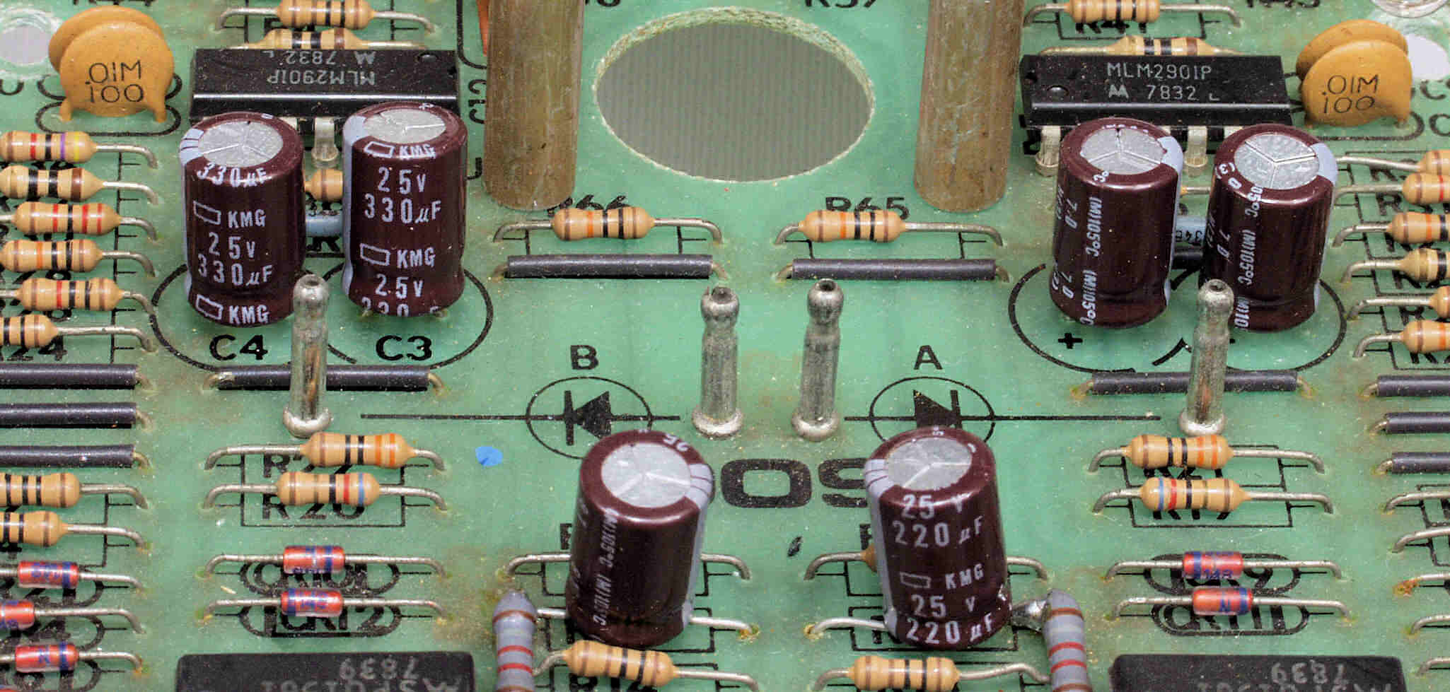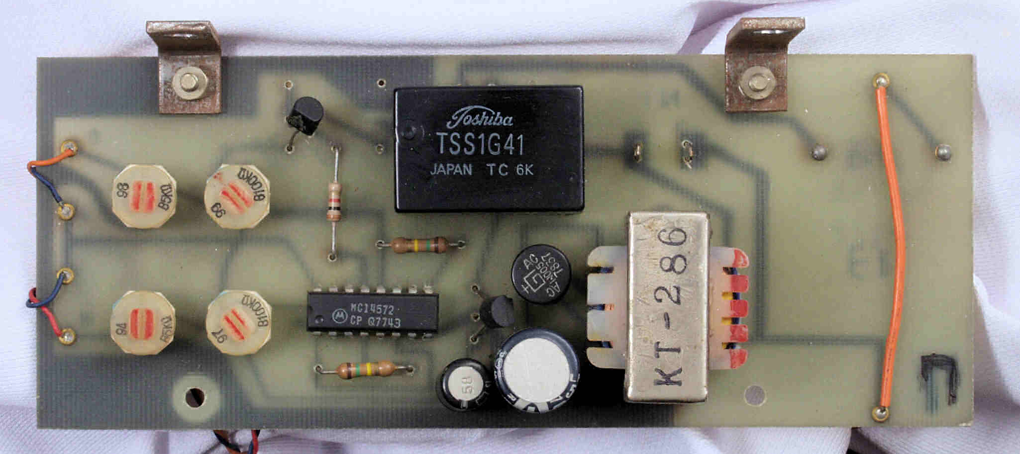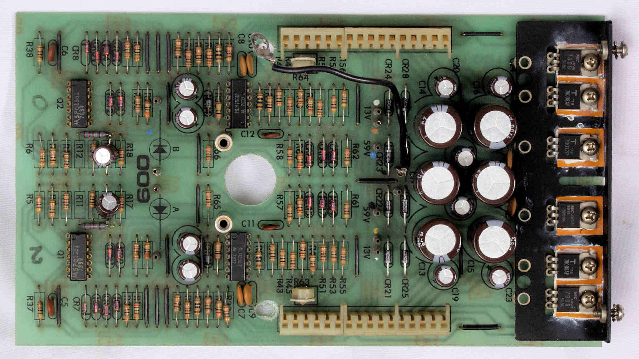 A41. 点検中 定電圧基板、 上の4個の電解コンデンサーの容量が3倍に交換されている。 下の2個は規定値。