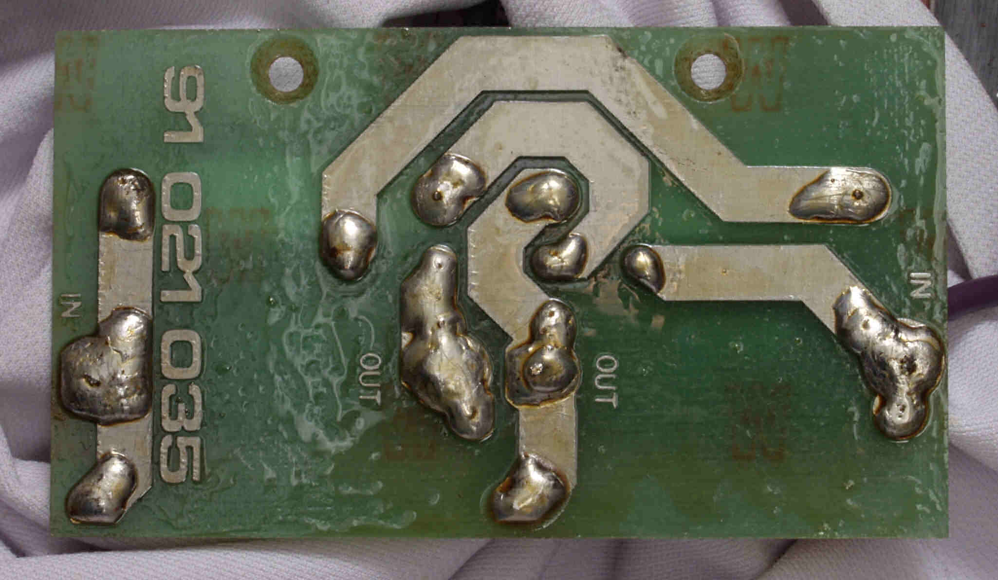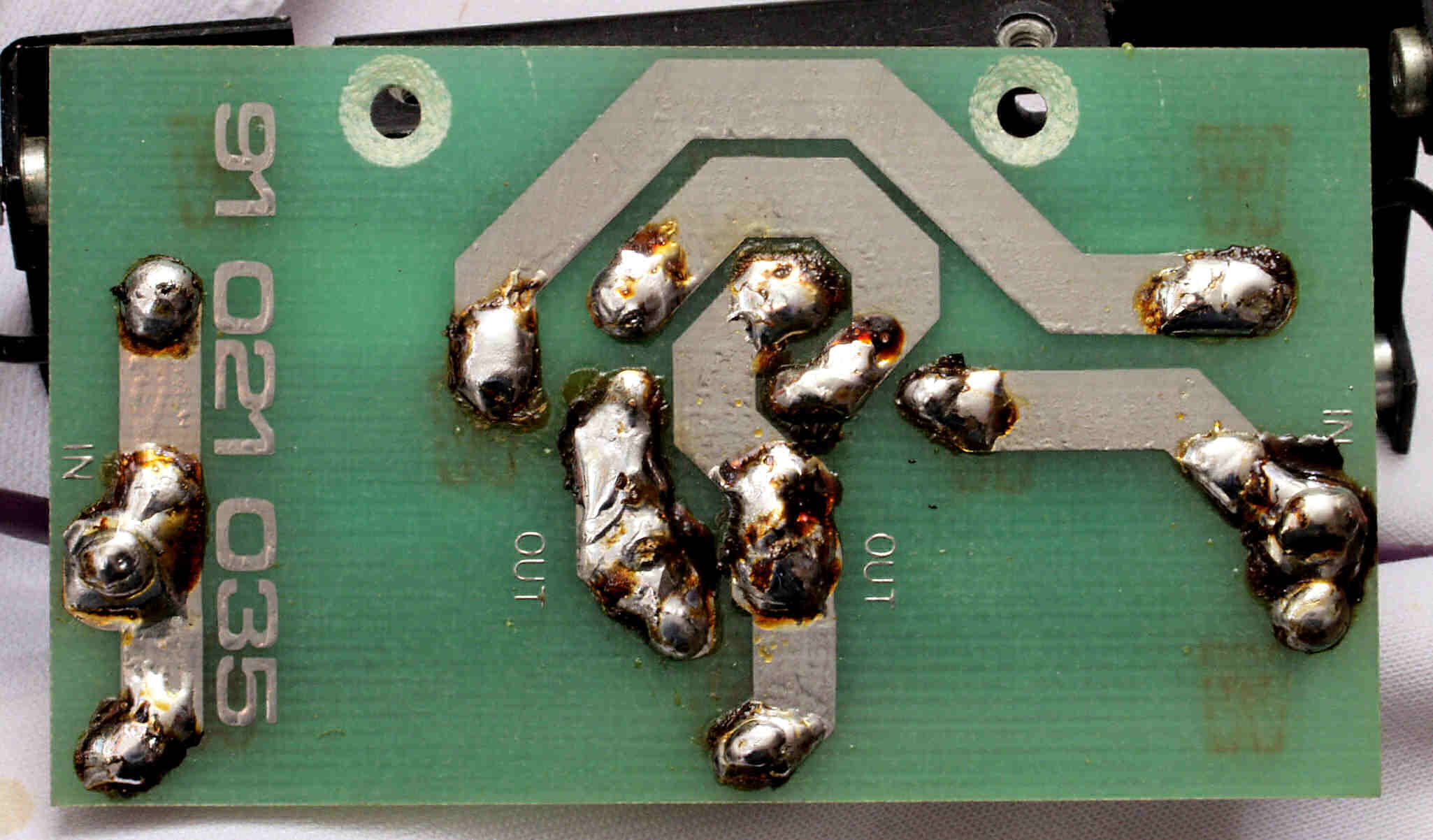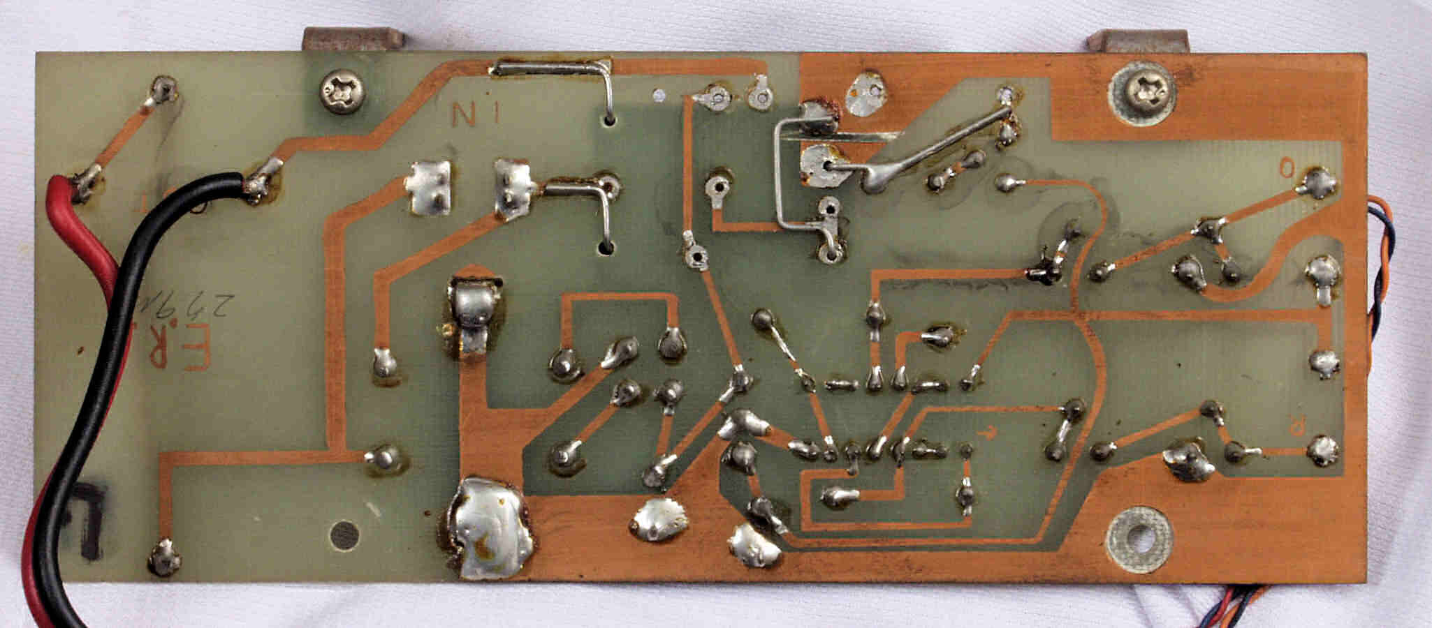 C911. 修理中 L側−終段TR(トランジスター)基板裏「−」、大きな事故で液漏れして腐食した銅箔。