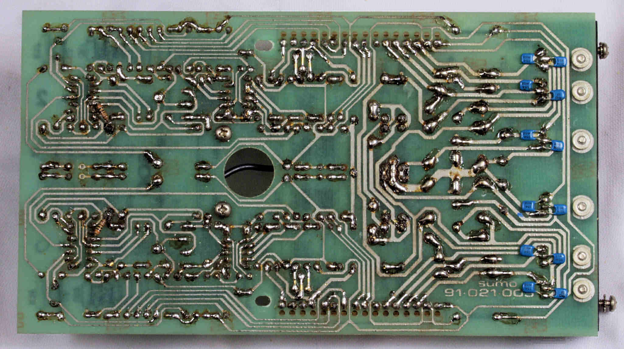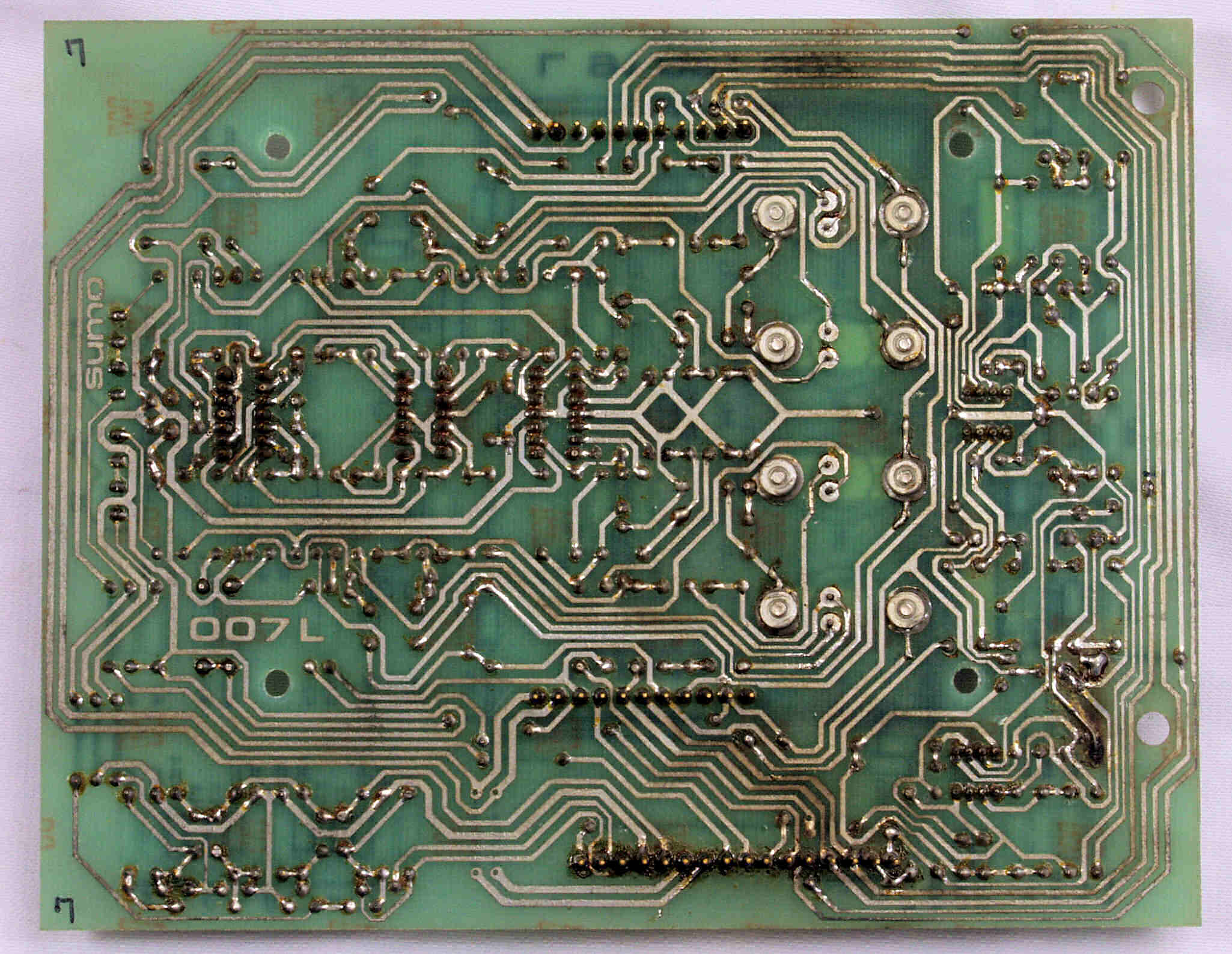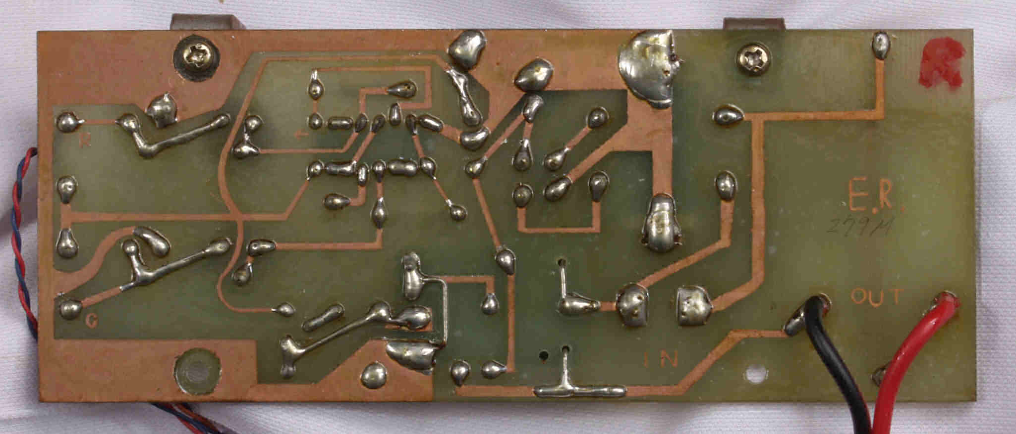 C911. 修理中 L側−終段TR(トランジスター)基板裏「−」、大きな事故で液漏れして腐食した銅箔。