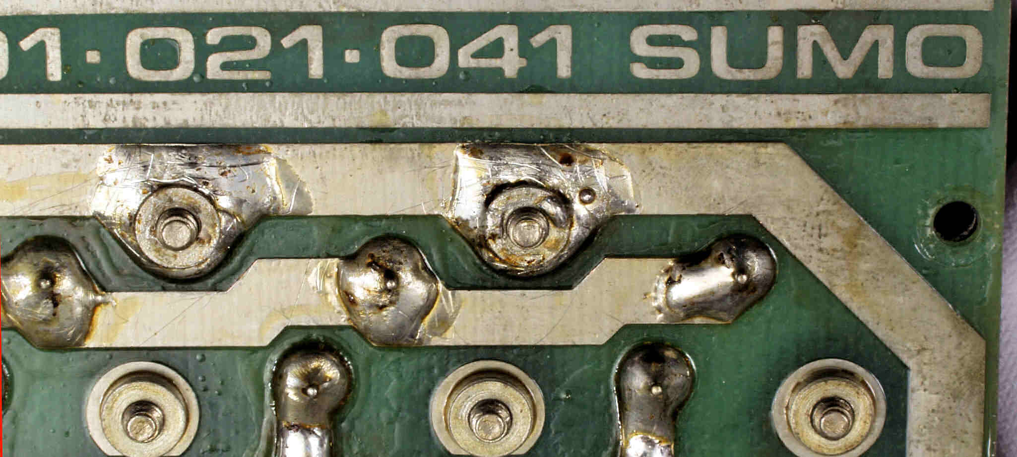 C971. 修理(半田補正)中、 L側−終段AMPユニット整流器基板裏、 端子にも半田を盛る、手前右2個が半田補正後。